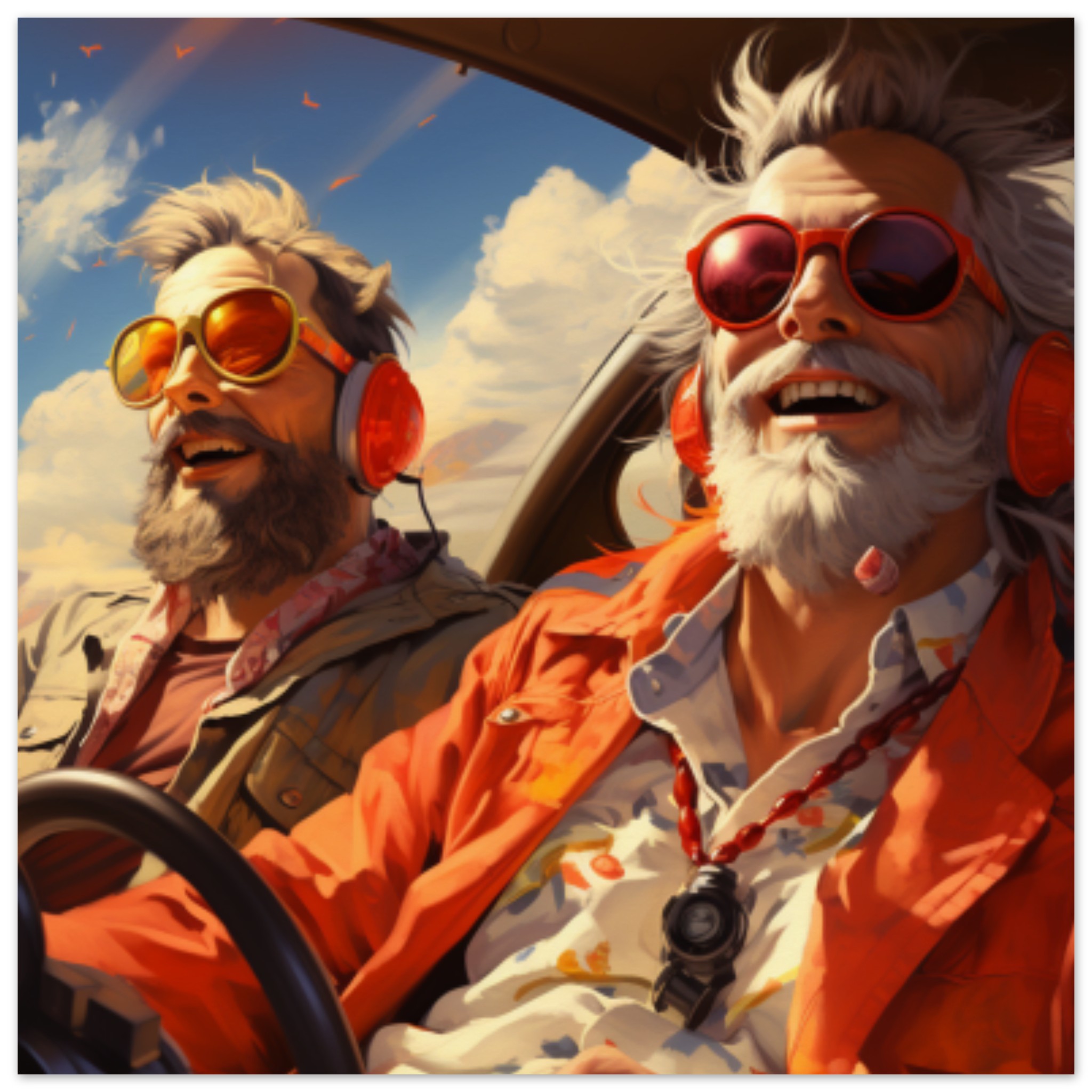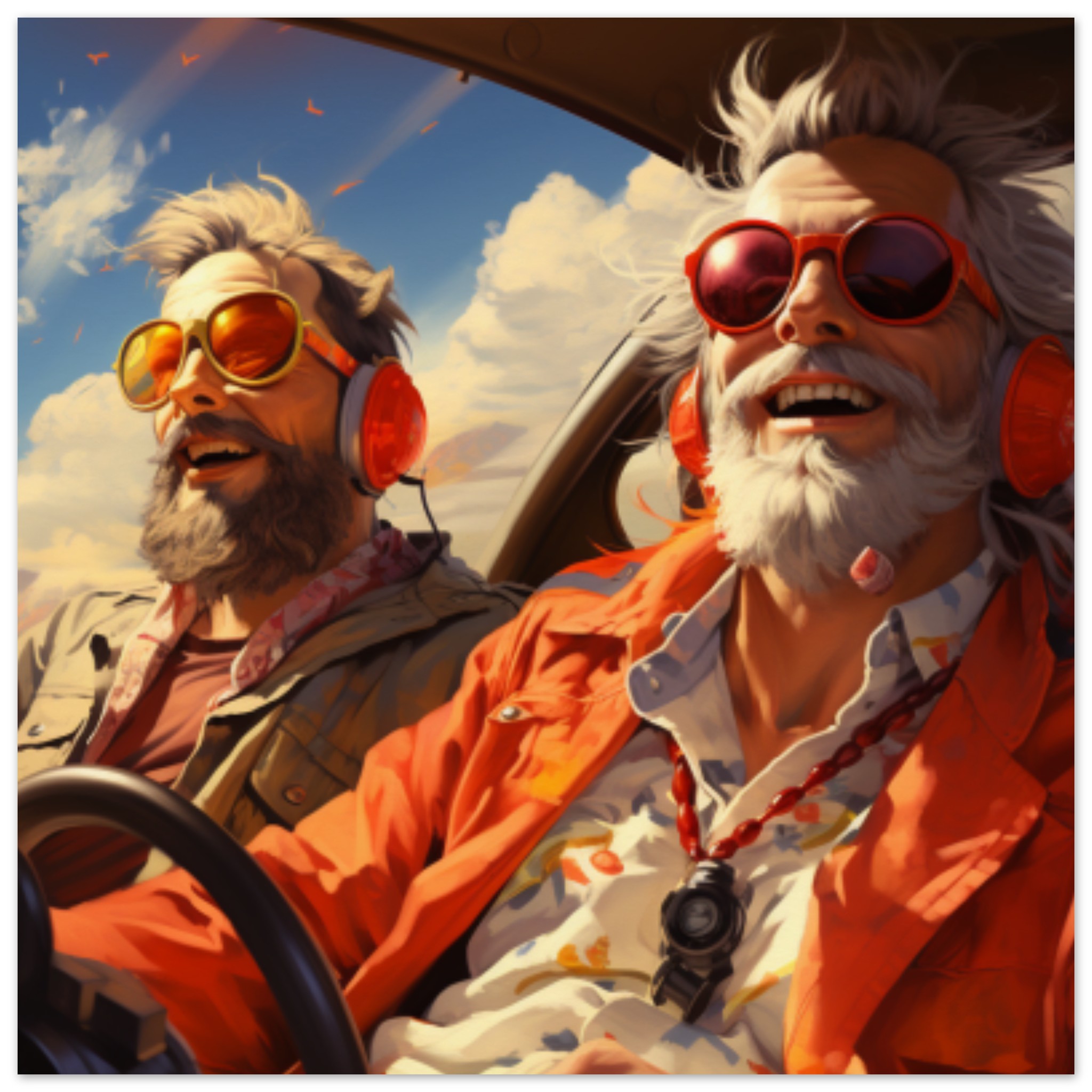 Two men are standing outdoors, wearing sunglasses and headphones. The dominant colors in the image are brown and red, with a vibrant accent color of BB3010. The background consists of a clear blue sky with fluffy clouds and mountains in the distance. Both men are dressed in casual clothing, with one man wearing orange headphones. The image is not in black and white and does not contain any adult, racy, or gory content. The men appear relaxed and enjoying the sunny day, with one man looking towards the camera and the other facing away.