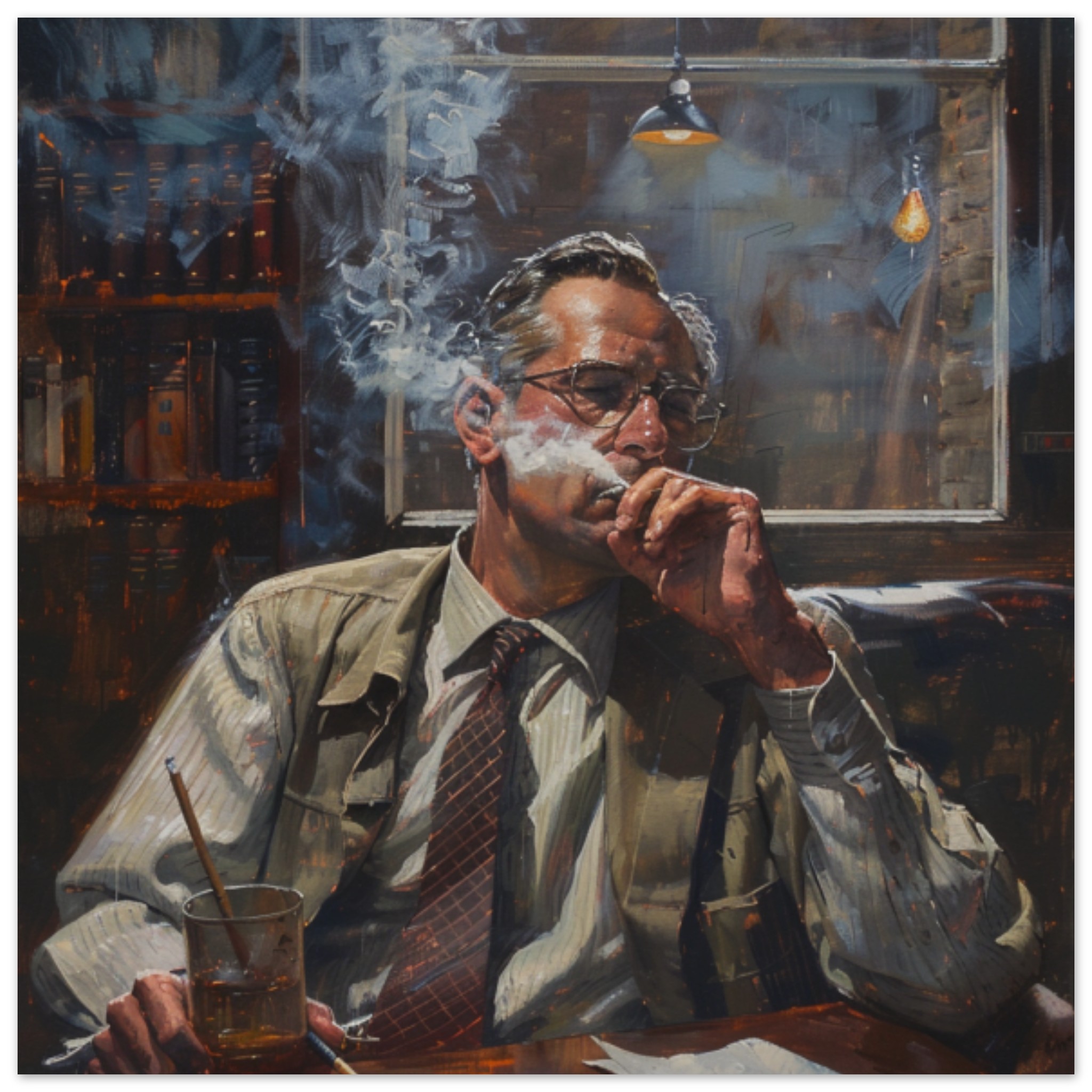 A man with a human face, wearing clothing including a tie and glasses, is depicted in a painting indoors. The man has a human beard and is smoking a cigarette. In the background, there is a cup placed on a surface. The dominant colors in the image are grey and black, with an accent color of 7E604D. The image is not black and white. The content of the image is not adult, racy, or gory. The scene is artistic in nature, with a focus on the man smoking and the various details captured in the painting.