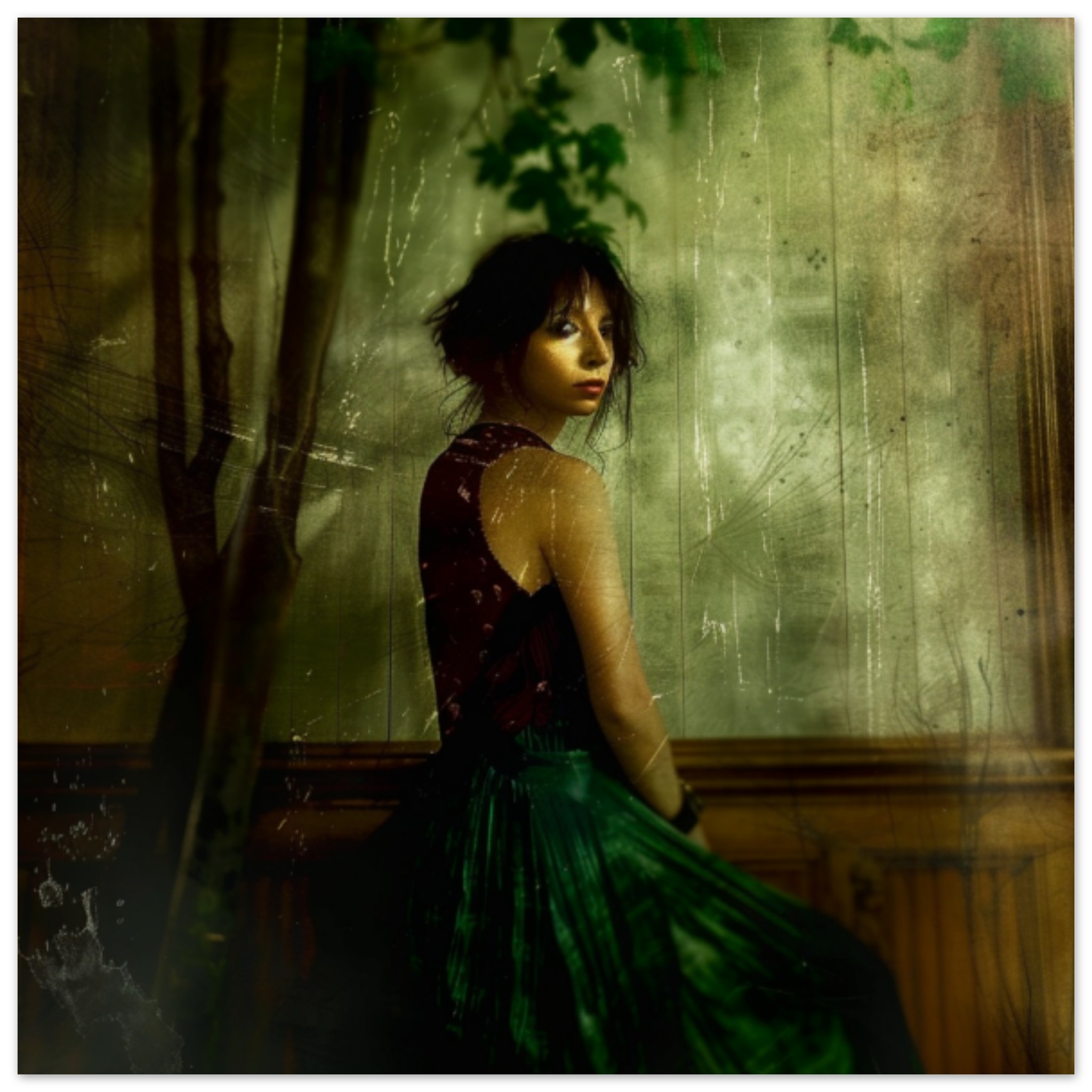 A woman wearing a green skirt is depicted in this painting. The woman is standing against a black wall, showcasing her elegant attire. She has a serene expression on her face, with her eyes looking directly at the viewer. The skirt is flowing and ornate, adding a touch of haute couture to her ensemble. The background is dark, emphasizing the woman’s vibrant green skirt. The image has a dominant color scheme of black and green, with accents of a warm brown tone. The woman’s outfit resembles an academic gown, adding a scholarly and sophisticated element to the scene.
