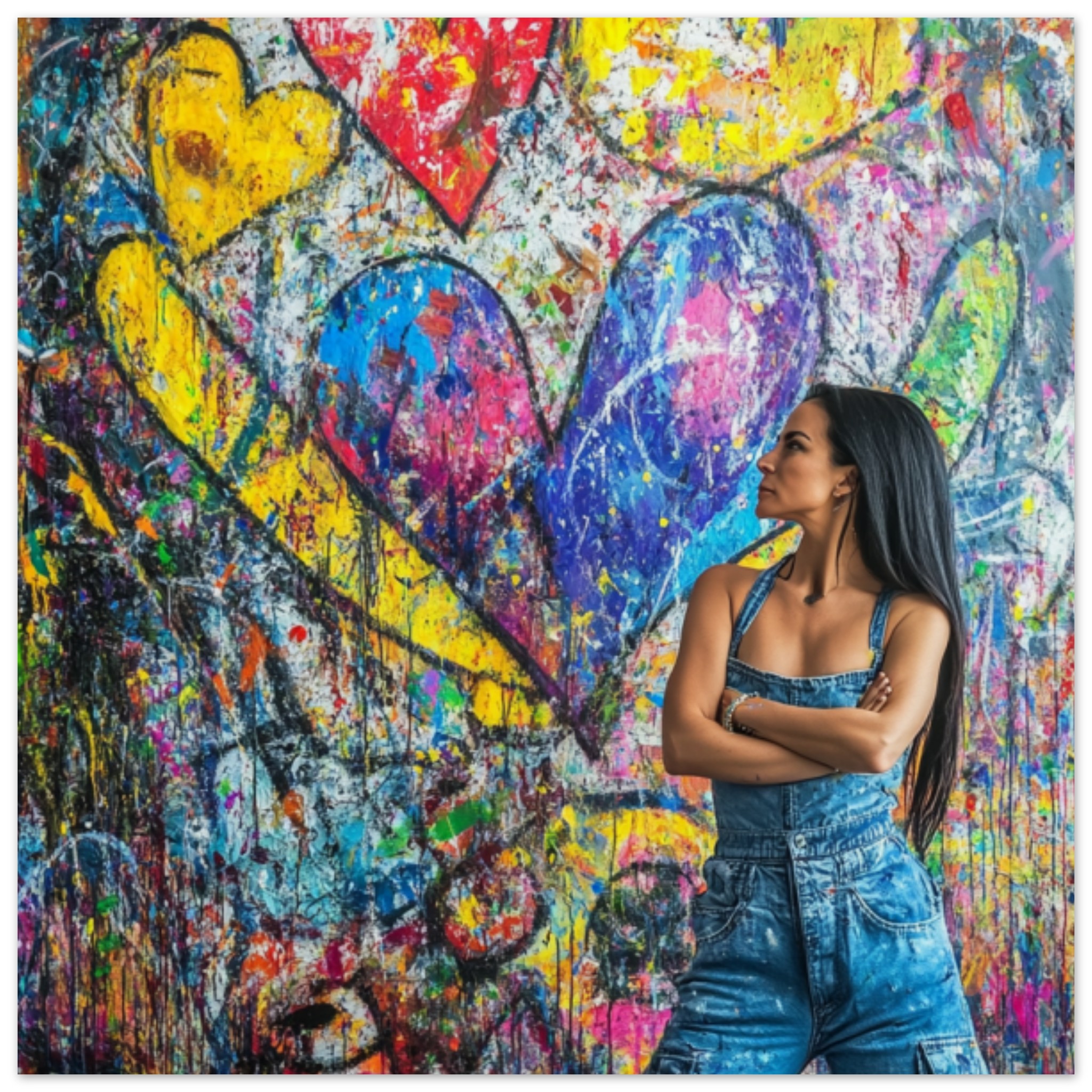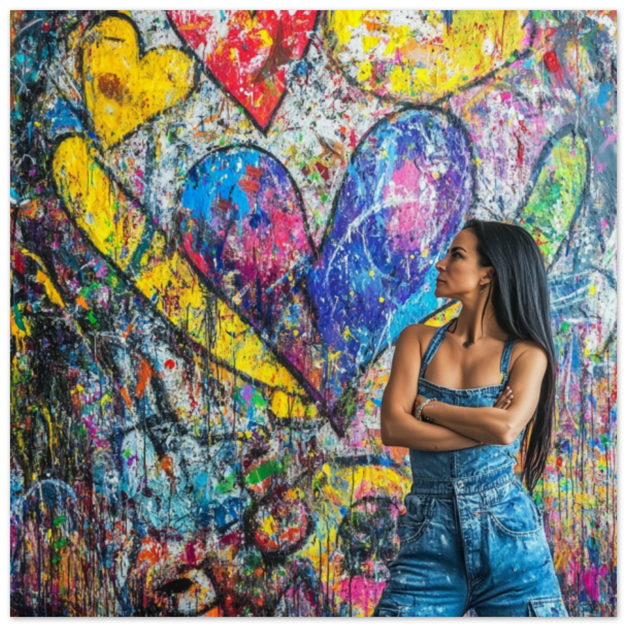 A woman with long black hair wearing blue jeans stands in front of a grey wall adorned with colorful hearts in a modern art mural. The woman is crossing her arms, showcasing a sense of confidence. The dominant colors in the image are yellow and grey, with a hint of gold as the accent color. The scene exudes a contemporary urban vibe, with elements of graffiti and street art. The focus is on the woman’s stylish outfit and the vibrant artwork behind her, creating a visually striking composition that blends fashion with visual arts in a unique way.