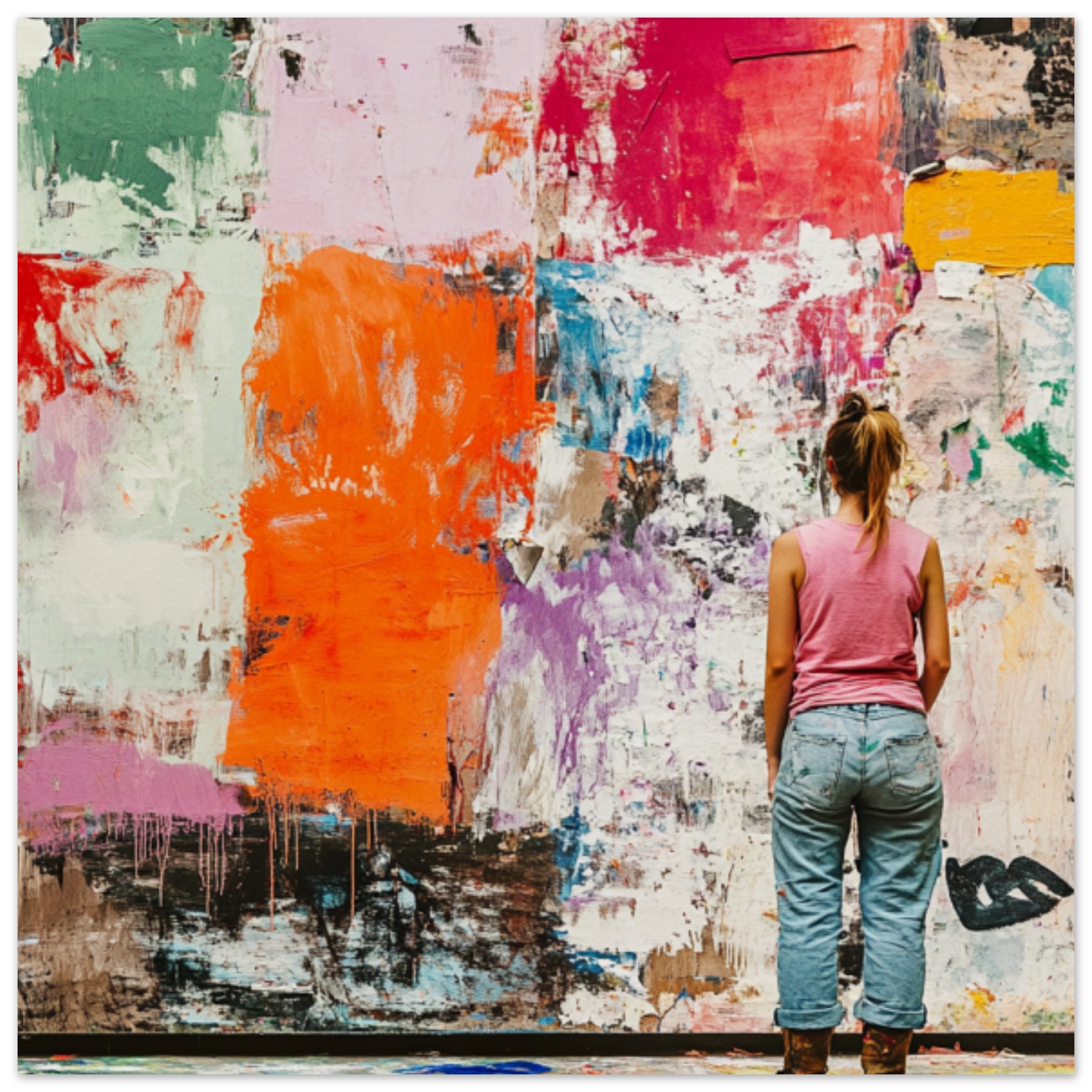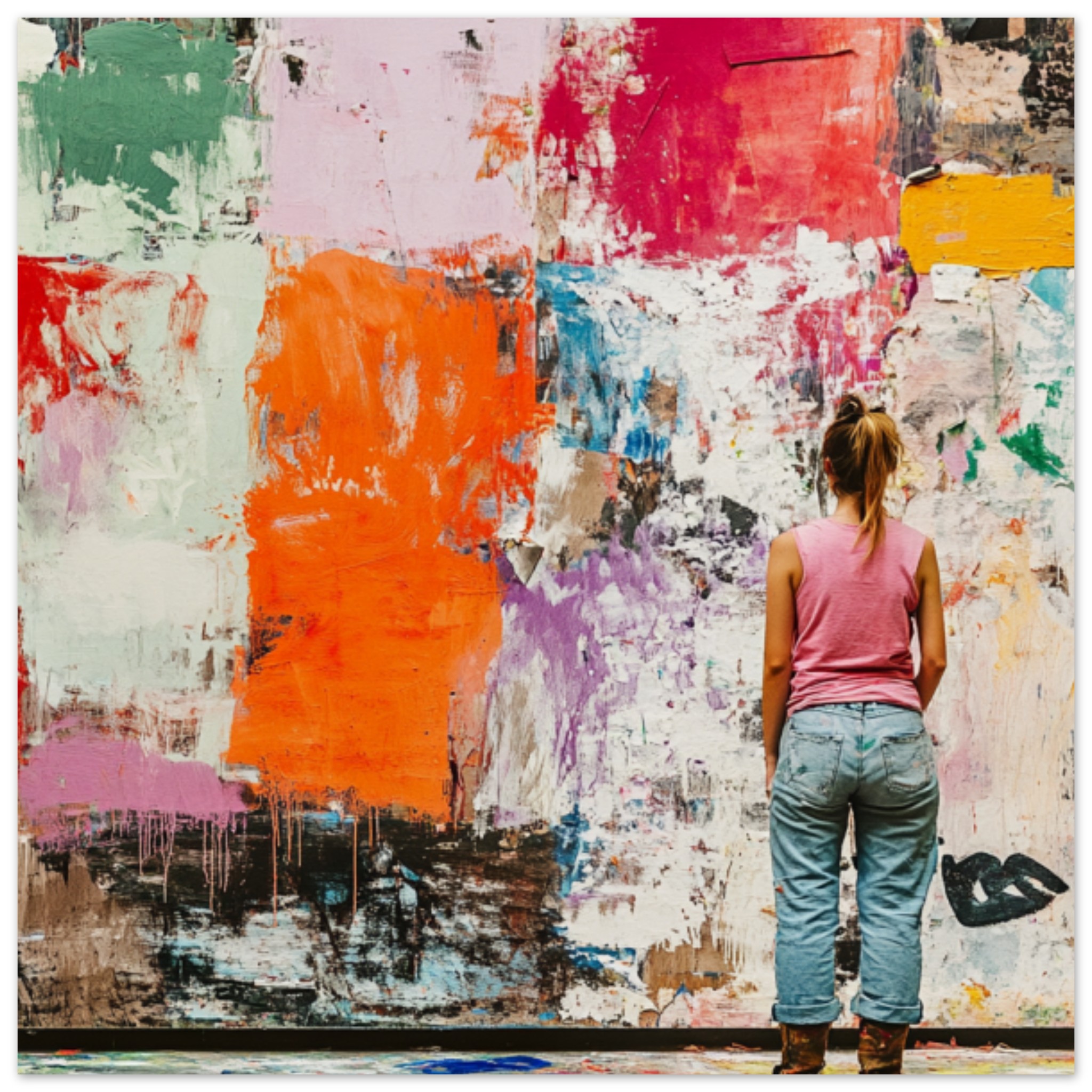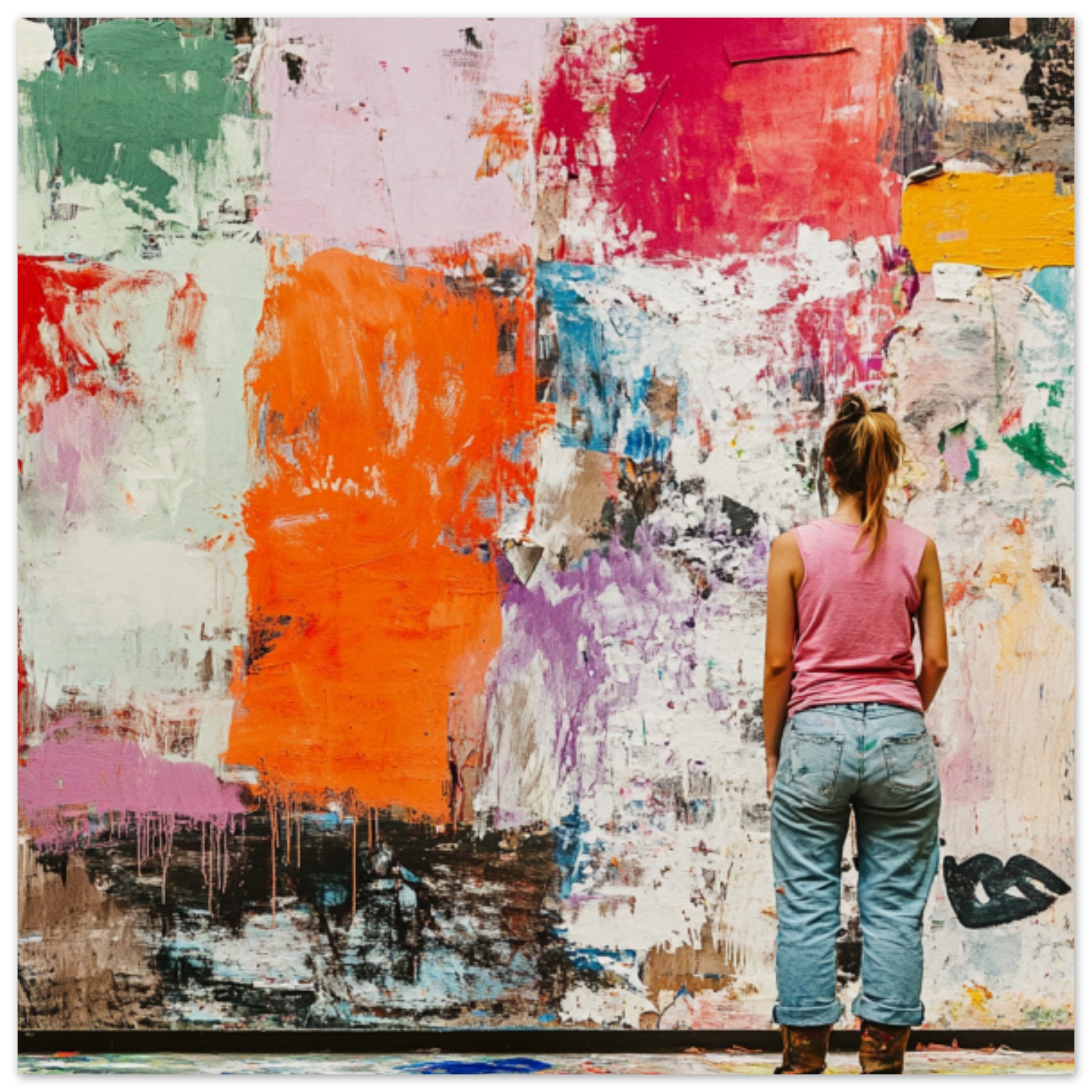 A woman wearing blue jeans and a pink tank top stands in front of a large wall with colorful paint. The wall features a vibrant street art mural, showcasing modern art and acrylic paint. The woman’s back and the bottom of her jeans are visible in the image. She is wearing white footwear and is surrounded by shades of white and grey. The scene captures a moment of urban creativity and visual arts in an outdoor setting. The focus is on the contrast between the woman’s casual clothing and the intricate painting behind her, creating a striking composition.