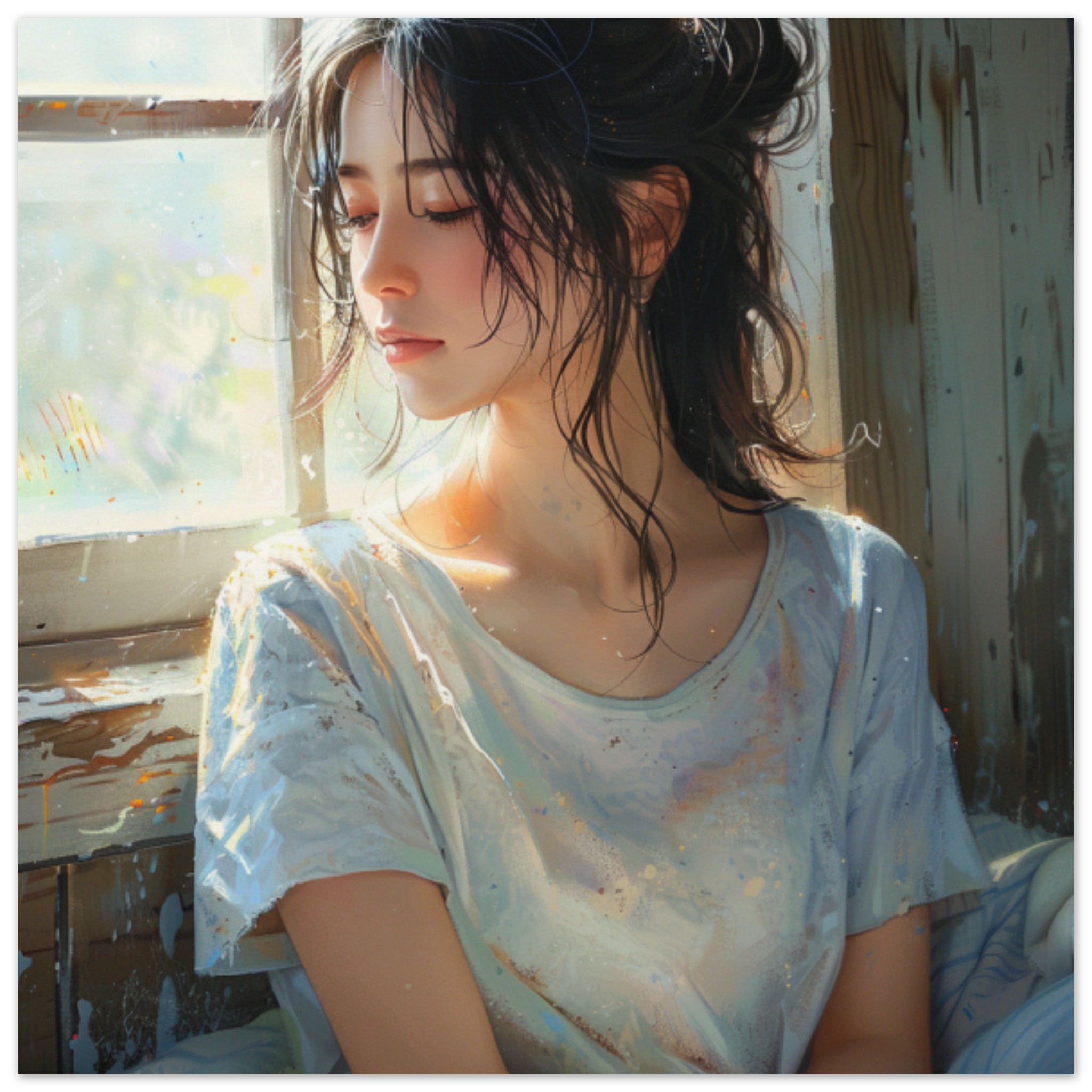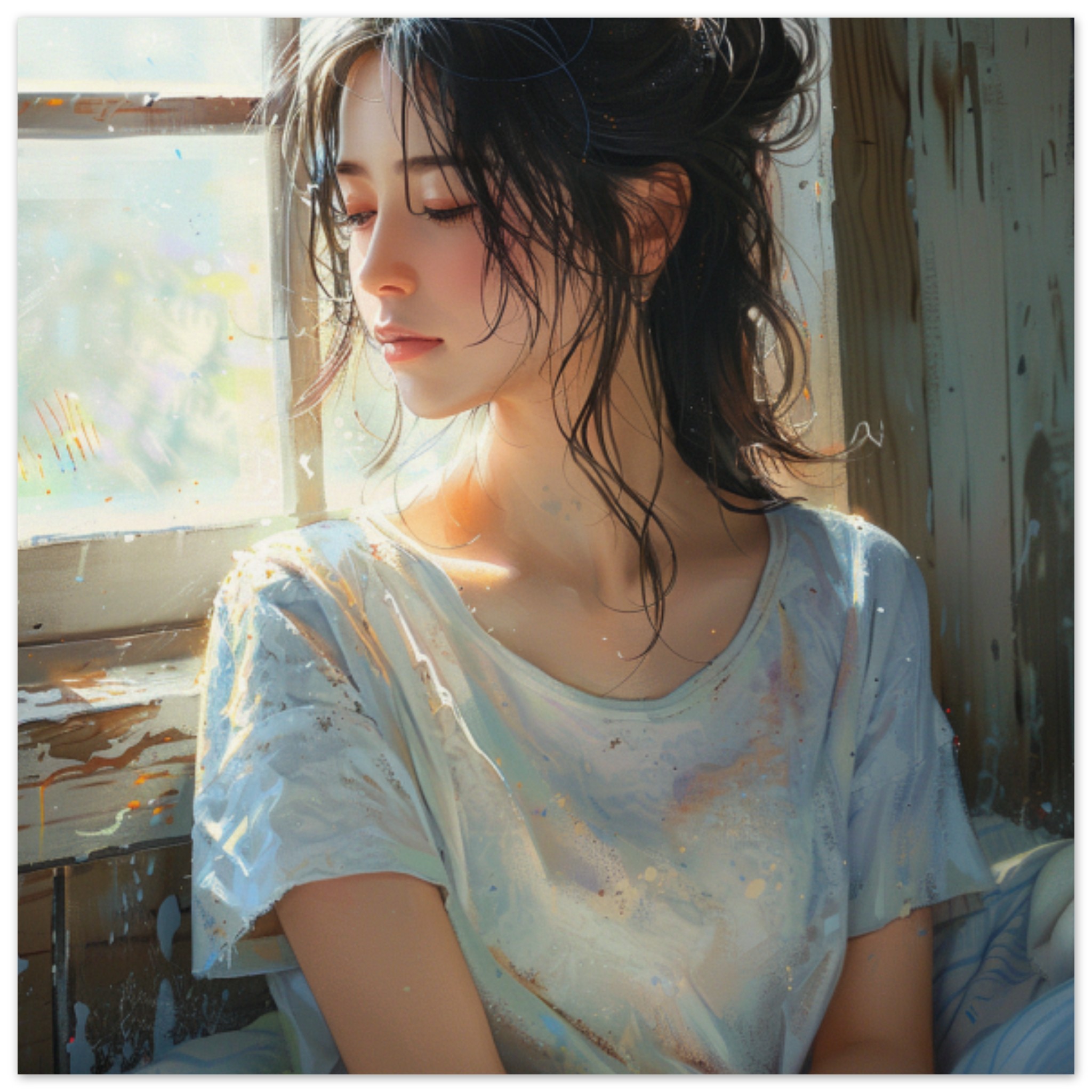 A young woman with dark hair is sitting in a window, wearing a white shirt. The background is predominantly grey, with accents of brown and white. The woman is facing the camera, with a neutral expression on her face. The image is well-lit, with sunlight streaming in through the window. The woman appears calm and relaxed, creating a peaceful atmosphere. There are no other objects or people in the scene, emphasizing the focus on the woman. The overall composition is simple yet visually appealing, drawing attention to the woman in the window.