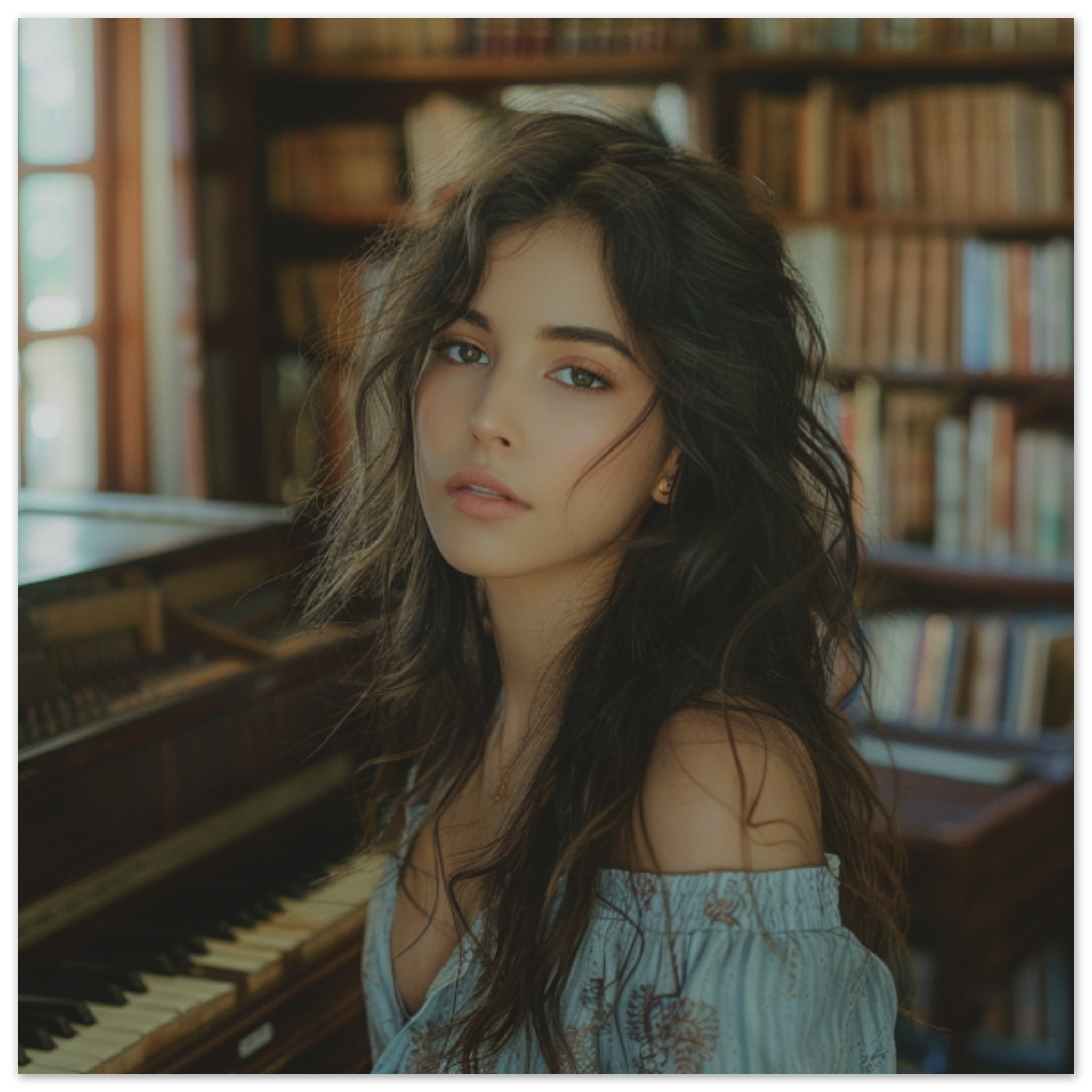 A woman with long brown hair is posing for a picture indoors. She is standing in front of a black wall with a keyboard instrument next to her. The image is dominated by shades of black, grey, and brown, with an accent color of 537875. The woman’s face is the focal point, with a bookshelf in the background. The overall scene is not adult, racy, or gory. The woman is elegantly dressed and seems to be in a music room, possibly playing the piano or another type of keyboard instrument.