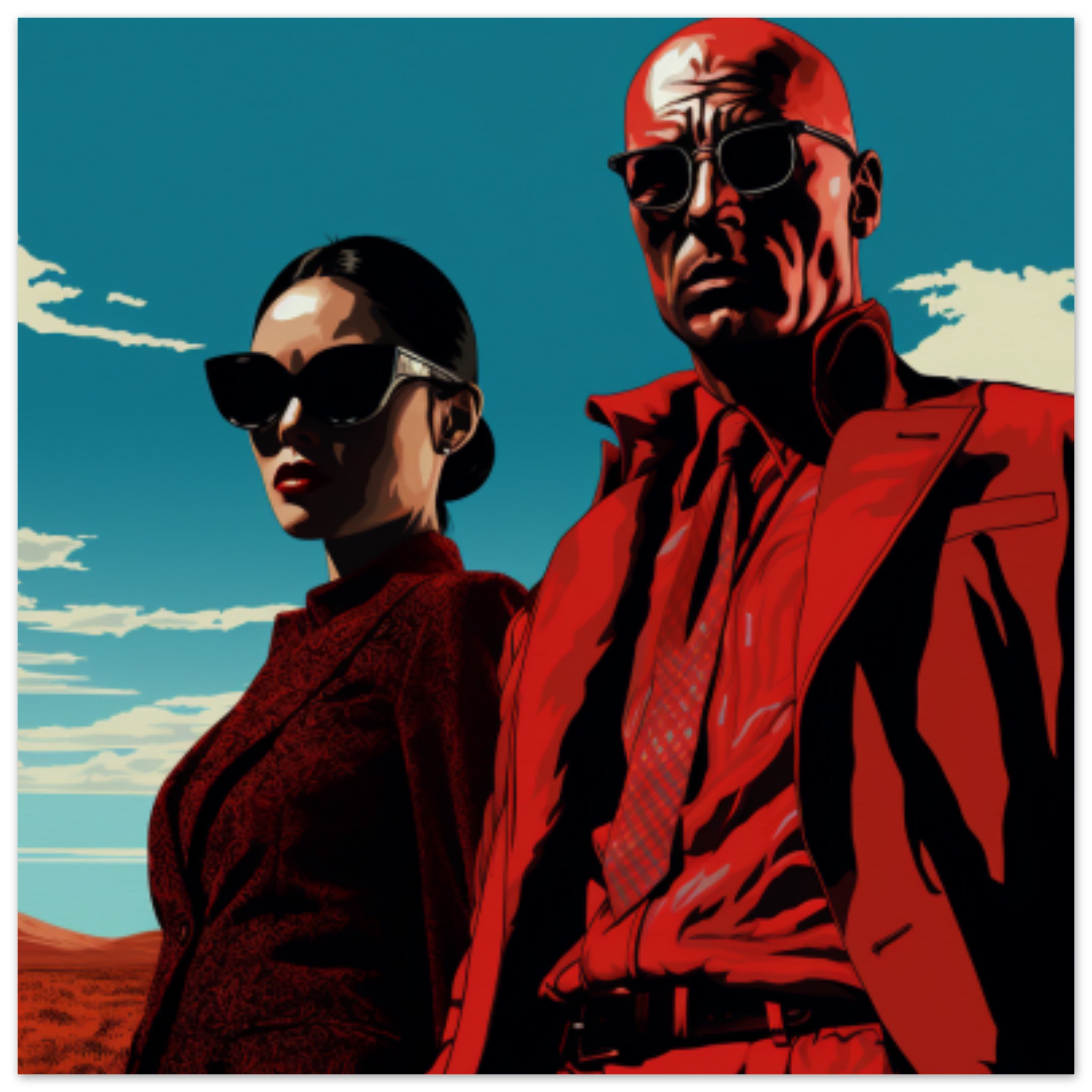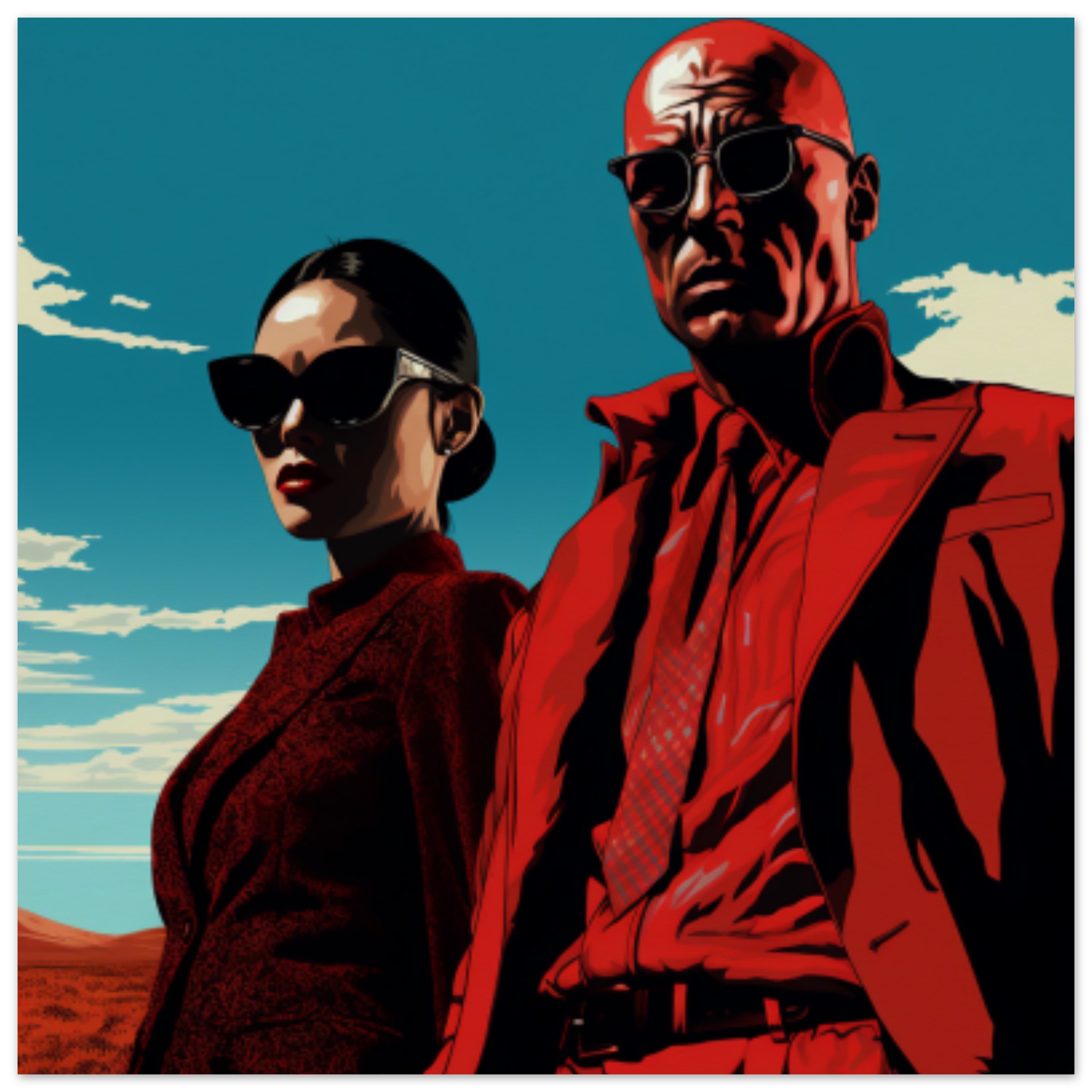 A man and woman dressed in vibrant red clothing are standing together in a desert landscape. The man is wearing a red suit and sunglasses, while the woman is sporting sunglasses and a red shirt. The dominant colors in the image are teal, black, and red. The background is a mix of teal and black, with hints of red accents. The image features a clear blue sky with fluffy white clouds, giving a serene outdoor feel. Both individuals have glasses on, adding a stylish touch to their adventurous hiking attire.