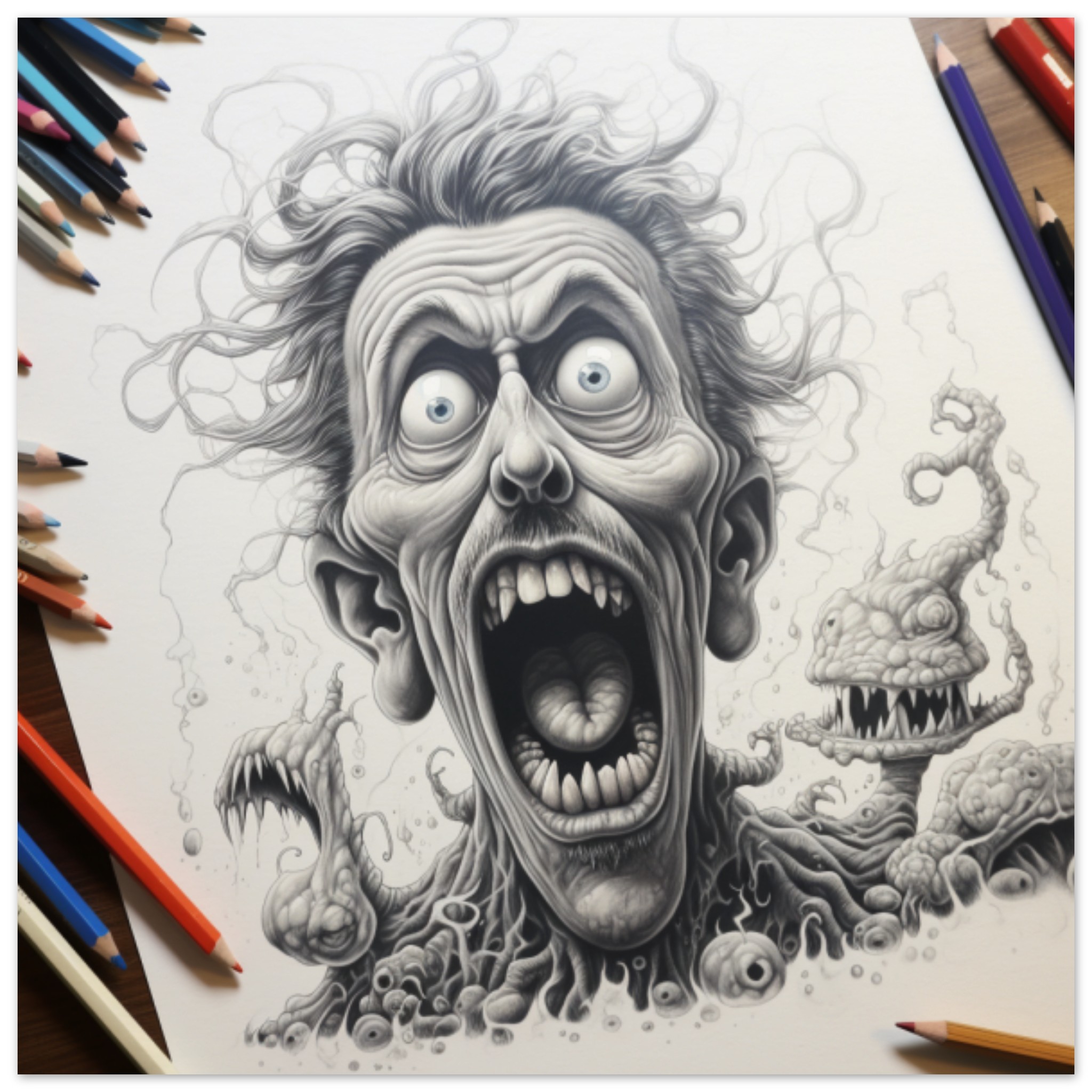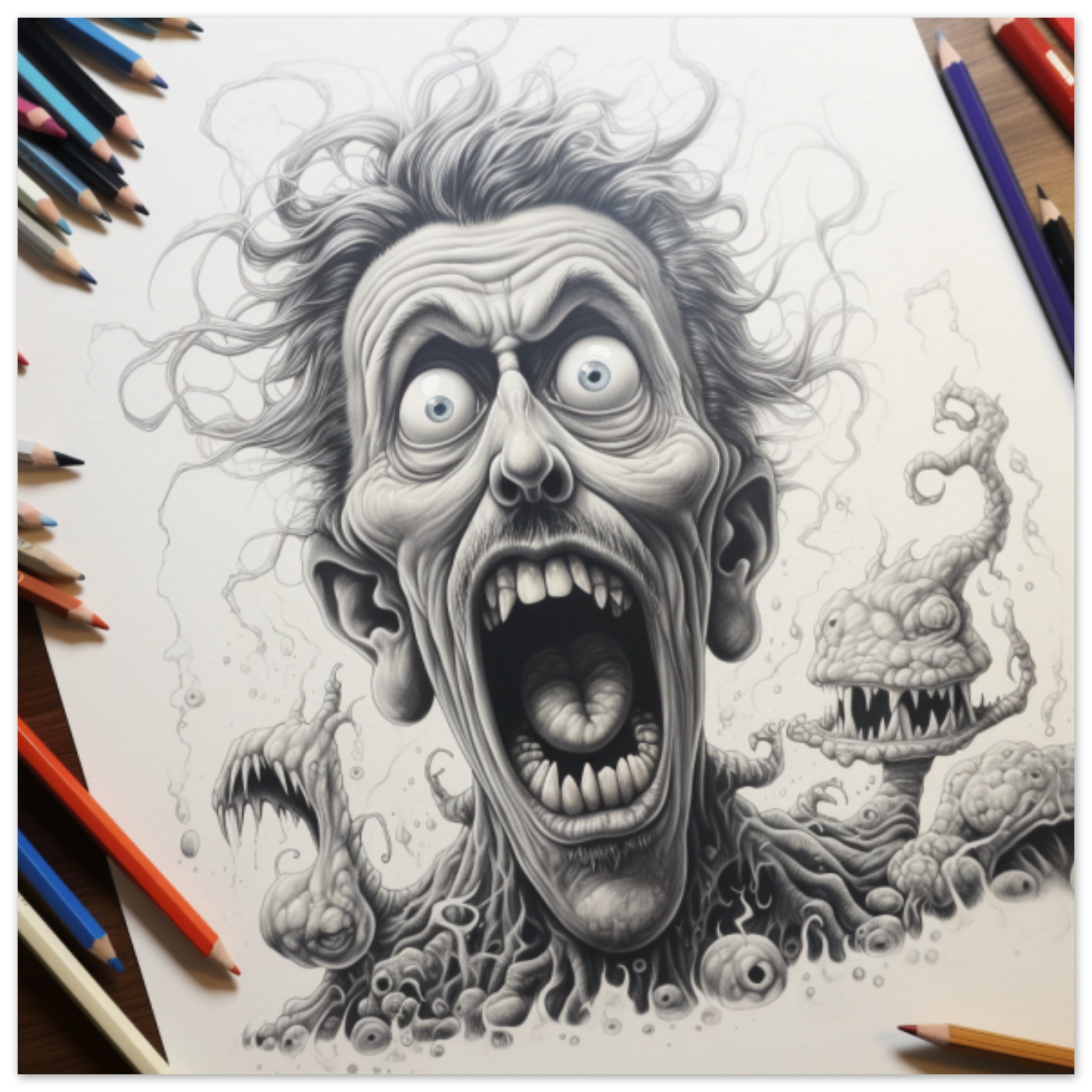 A detailed drawing of a zombie created with various pencils, showcasing intricate details and shading. The artwork is set against a white background, emphasizing the chilling and gory nature of the subject. The image measures 600×600 pixels, with the dominant colors being white and grey. The accent color is a deep red. This piece falls under the categories of drawing, painting, illustration, and sketch, with hints of ink work. The overall theme is dark and macabre, featuring a skull motif. The image does not contain any adult or racy content.