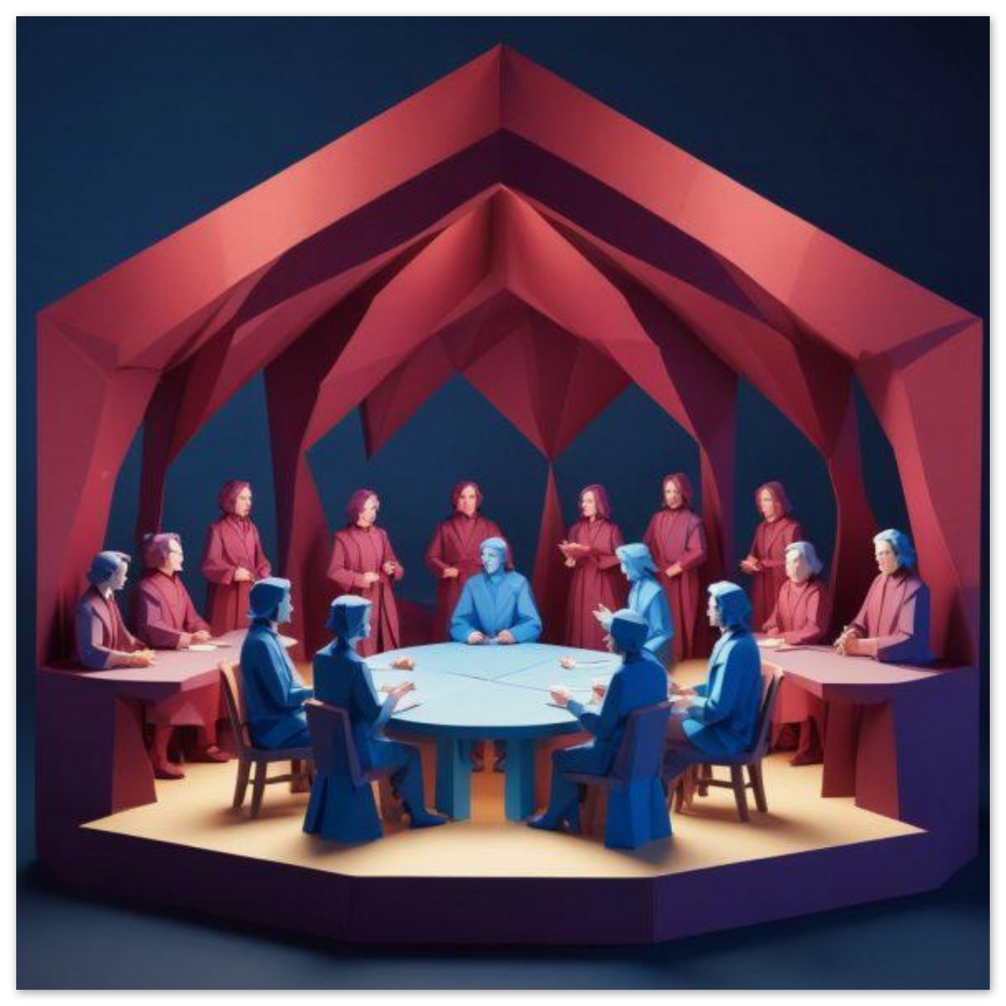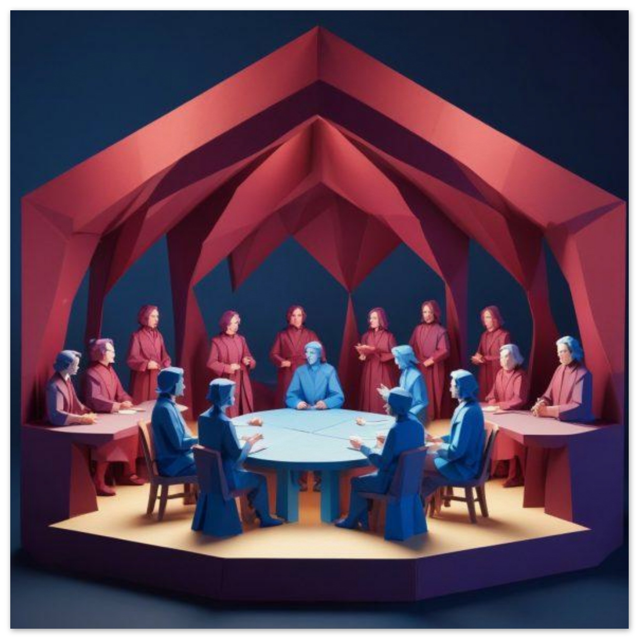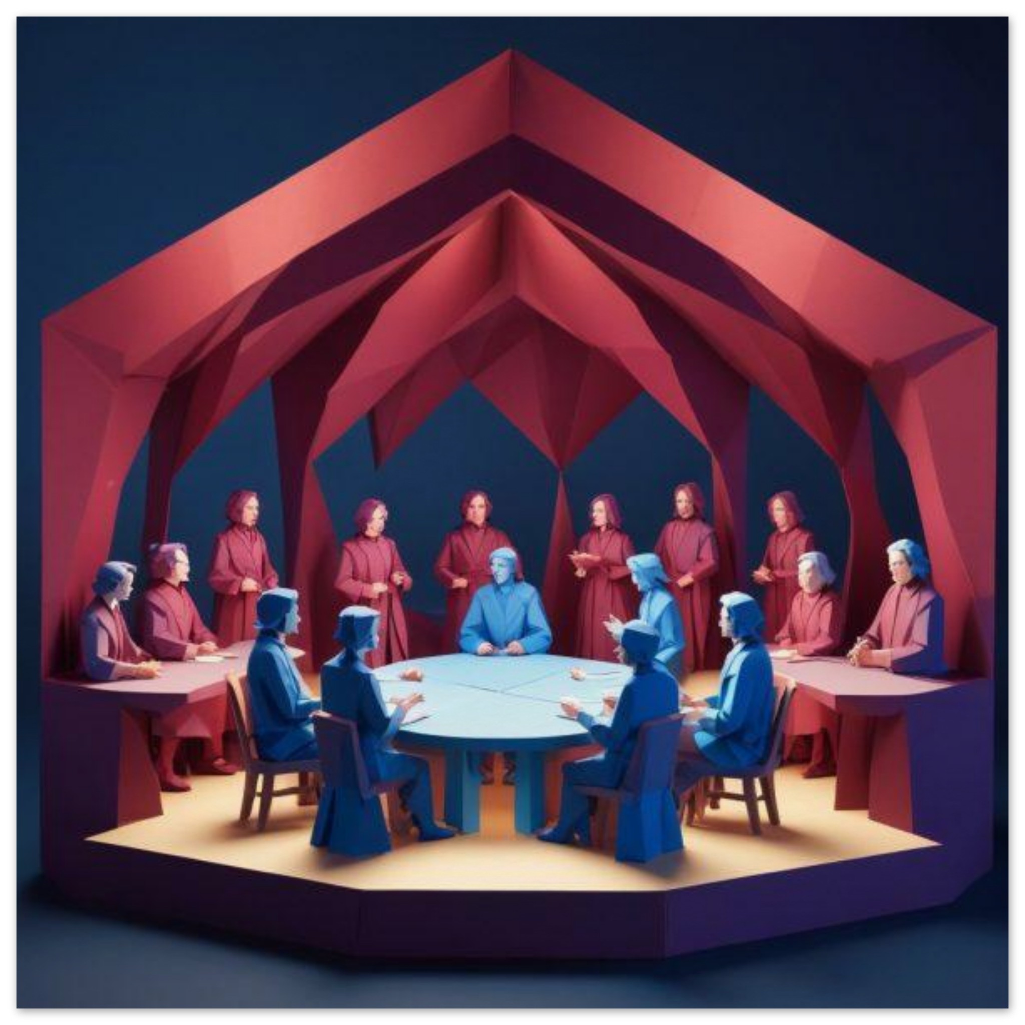 A group of six people, three men and three women, are seated around a rectangular wooden table in a room with red walls. The individuals are casually dressed and engaged in conversation. The room is well-lit, and there is a blue chair with wooden legs next to the table. The dominant colors in the image are red and brown. The people are of various ages and ethnicities. The image is focused on the group at the table, with no visible background details. Overall, it depicts a social gathering in a cozy indoor setting.