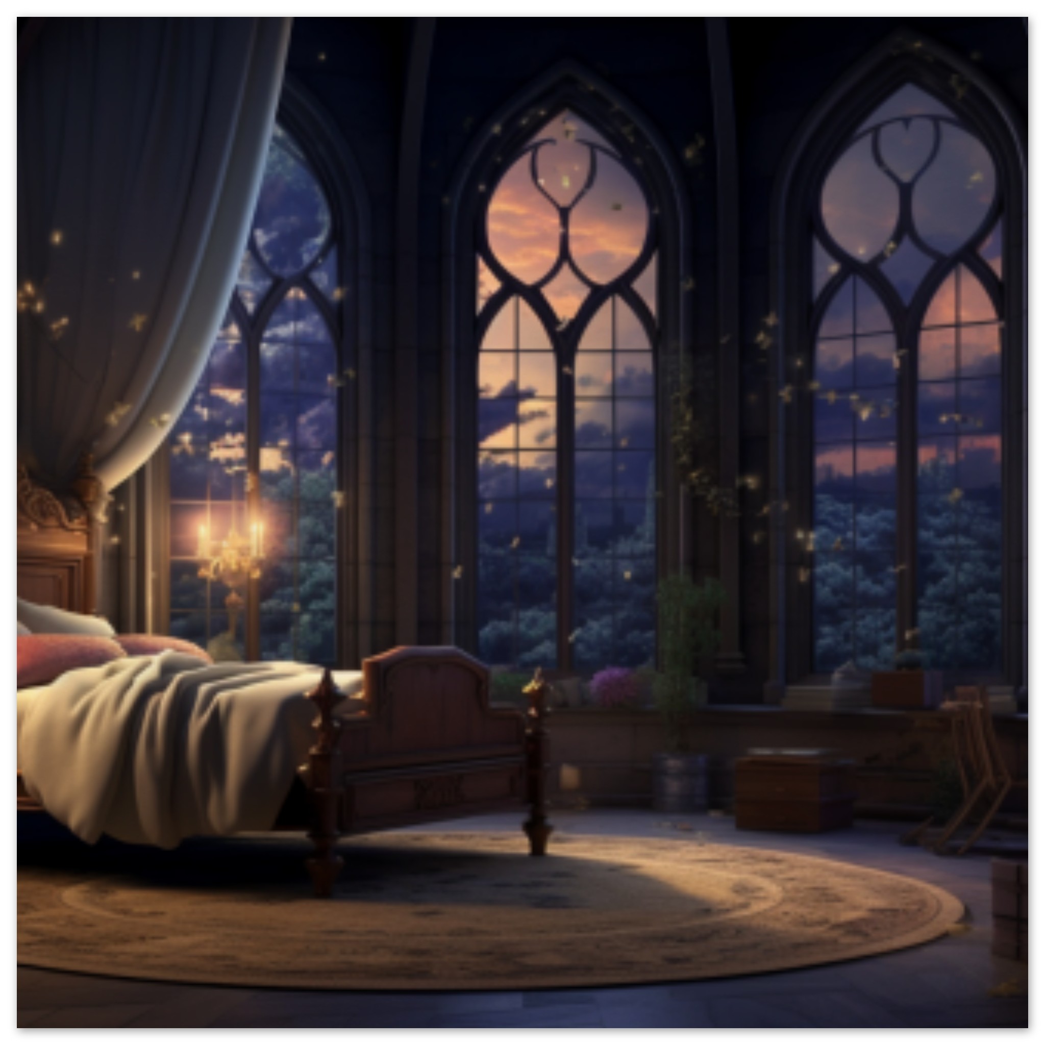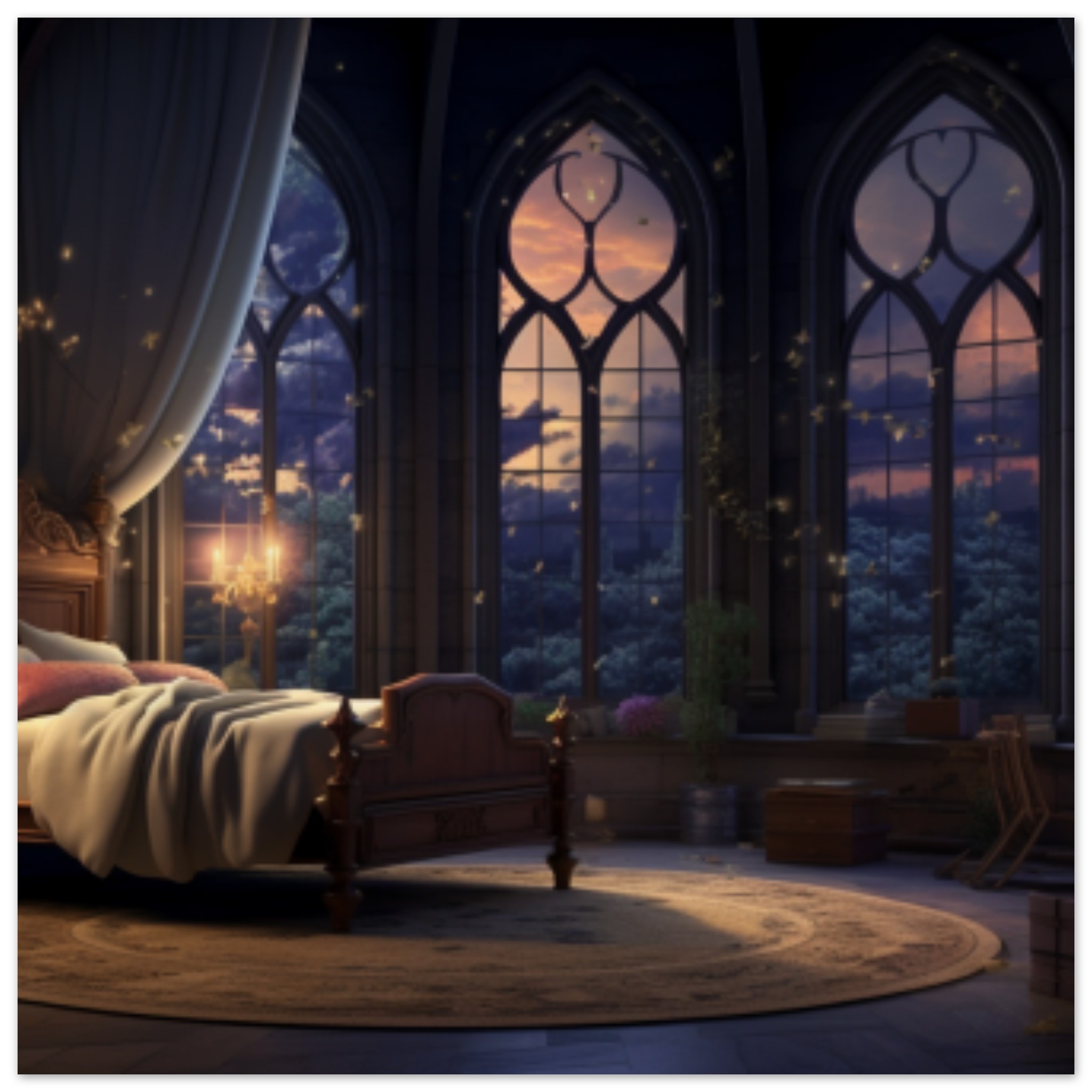 A cozy and inviting room featuring a comfortable bed with a canopy and a chandelier overhead. The room is illuminated by large windows, allowing natural light to pour in. A black chair is placed in the corner, adding to the elegant decor. A carpet covers the floor, providing warmth and comfort. In the center of the room, there is a stack of boxes on a table, adding a touch of organization. The image is sharp and detailed, showcasing the beauty of the room’s design and furniture.