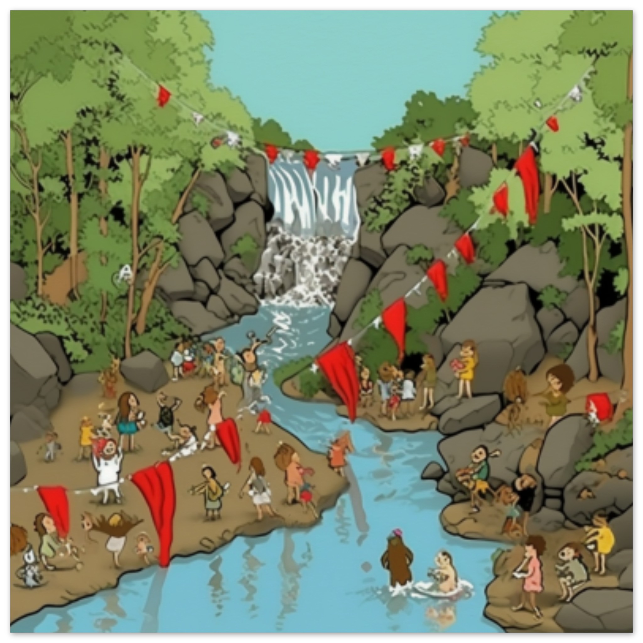 A colorful cartoon illustration of a river with a majestic waterfall cascading down into a serene pool of water. In the background, lush greenery surrounds the riverbank, creating a peaceful and scenic setting. A group of people can be seen enjoying the view, possibly picnicking or taking photos. The dominant colors in the image are shades of green and grey, with a vibrant red accent. This animated scene evokes a sense of tranquility and natural beauty, making it a captivating and engaging visual experience.