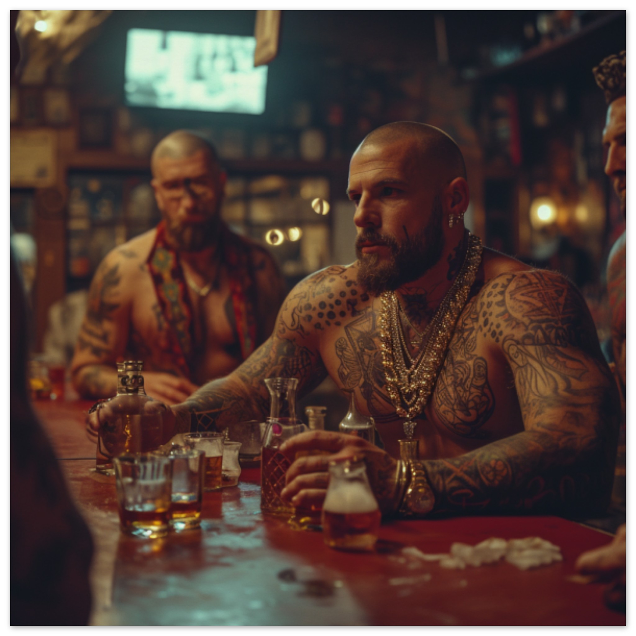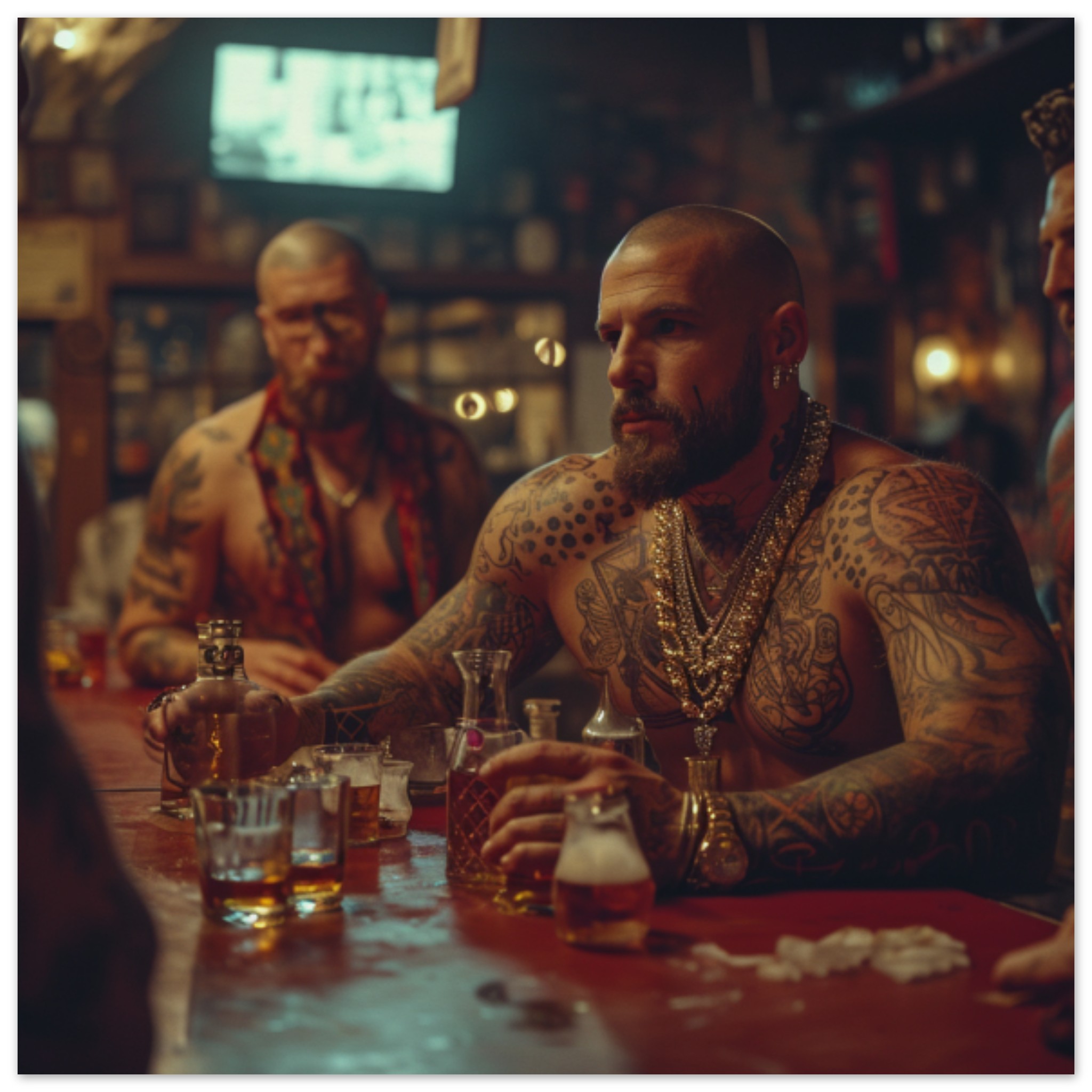 A group of three men are sitting at a wooden table indoors, enjoying drinks together. The men are casually dressed and one man has tattoos on his chest. The table is cluttered with various glasses filled with alcohol. In the background, there is a person standing near the table. The dominant colors in the image are brown and black, with white accents. The setting appears to be a cozy bar or pub. One man’s face is visible in the foreground, showing a relaxed expression. Overall, it is a scene of camaraderie and relaxation over drinks.