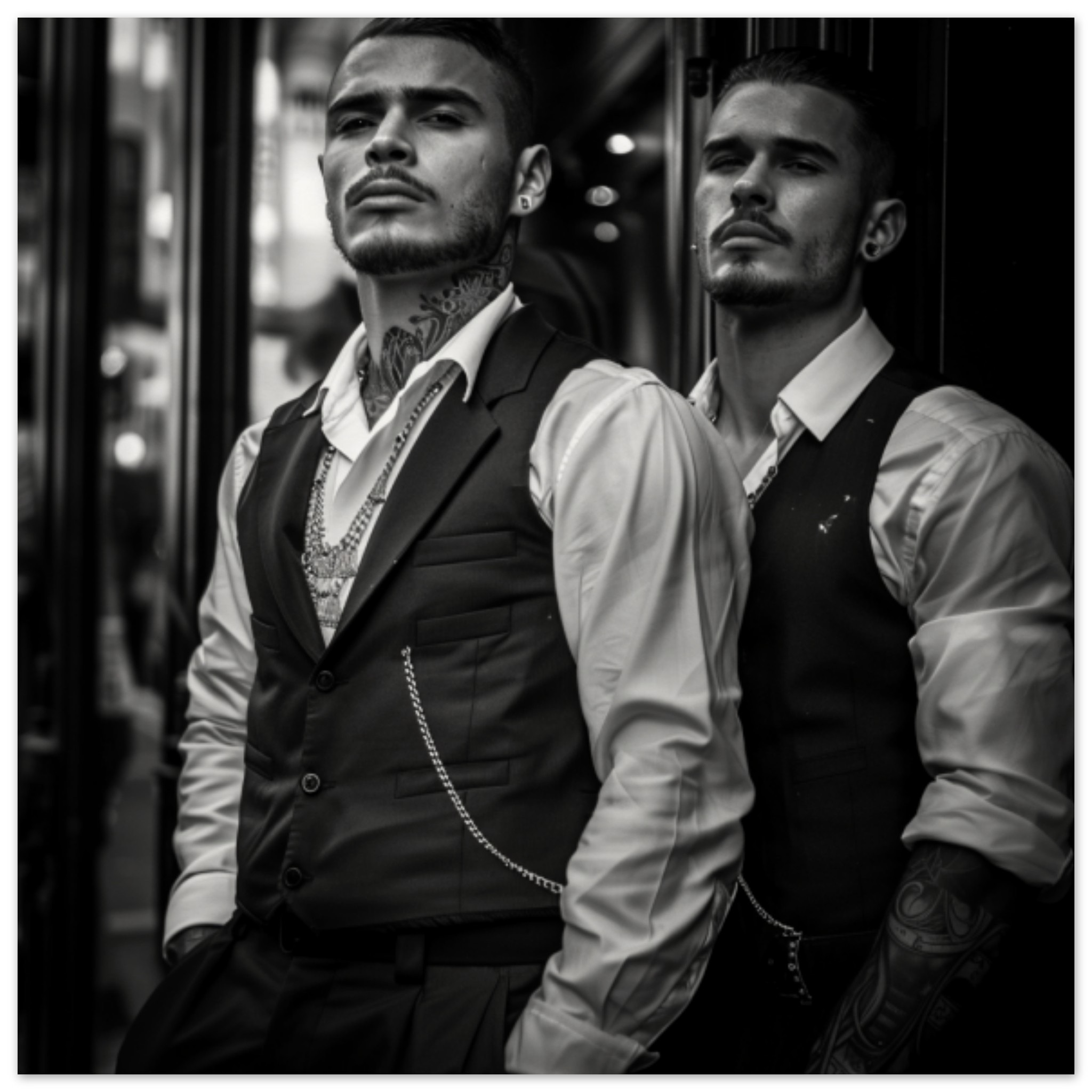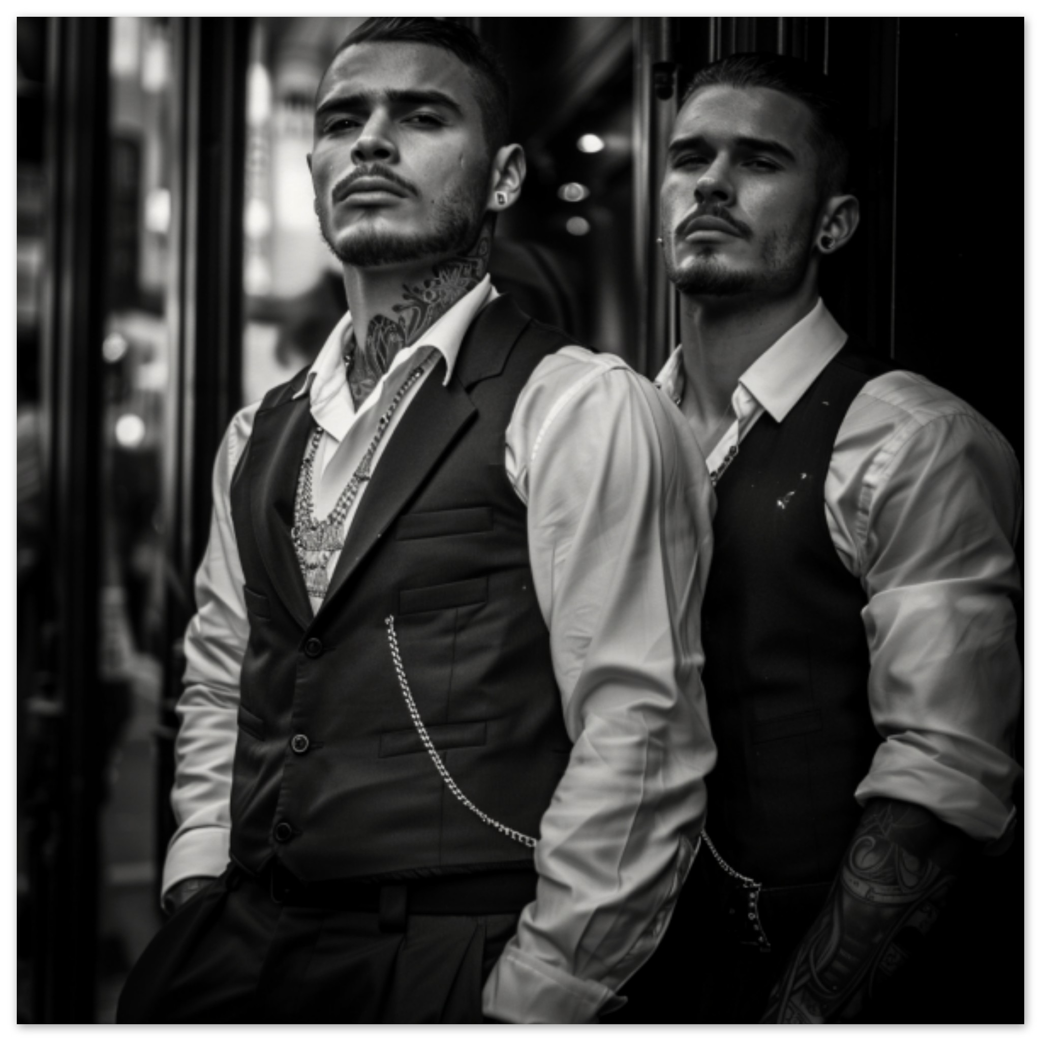 Two men are posing for a picture outdoors on the street. The first man, with a beard and neck tattoo, is wearing a black vest and a collared shirt. He stands confidently with his hands in his pockets. The second man, also dressed in black and white, is looking directly at the camera with a serious expression. Both men have a classic gentlemanly style. The image is in black and white, highlighting the contrast between their outfits and the urban background. The scene evokes a sense of timelessness and urban sophistication.