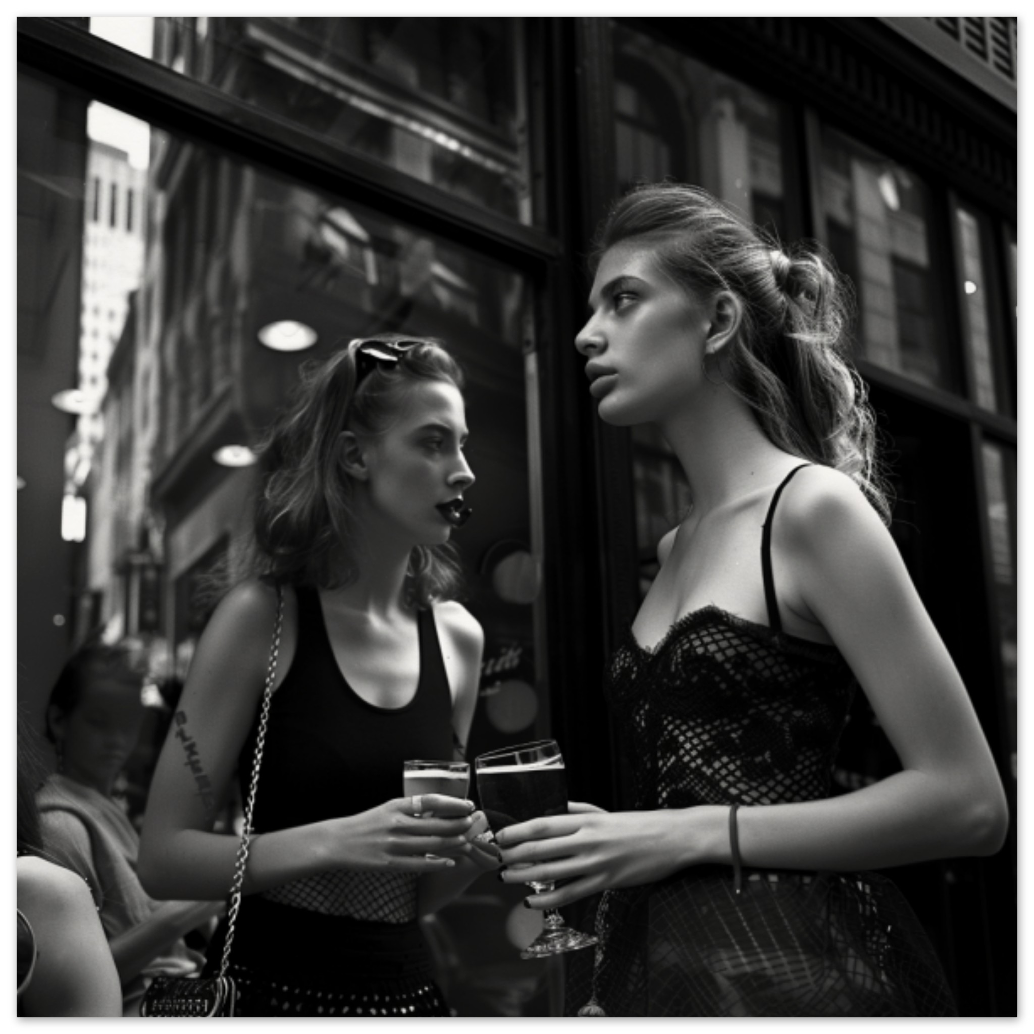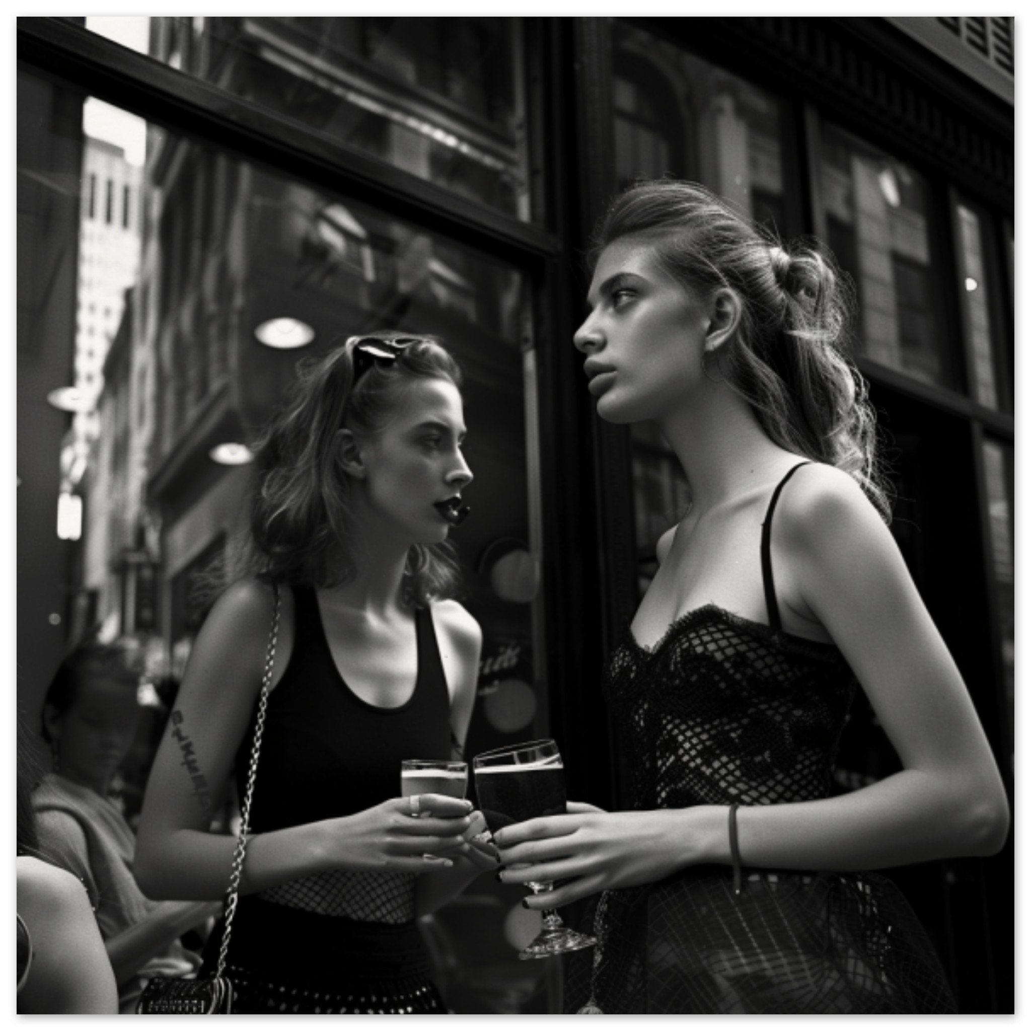 In a bustling city, two stylish women are seen enjoying drinks outdoors. One woman is wearing a chic black dress, while the other is in a black tank top and sunglasses. One hand is delicately holding a glass of wine, adding a touch of elegance to the scene. The image is in black and white, with dominant colors of black and grey. The background features a building and a street. Both women exude confidence and sophistication as they stand together, creating a fashionable and captivating moment captured in the city.