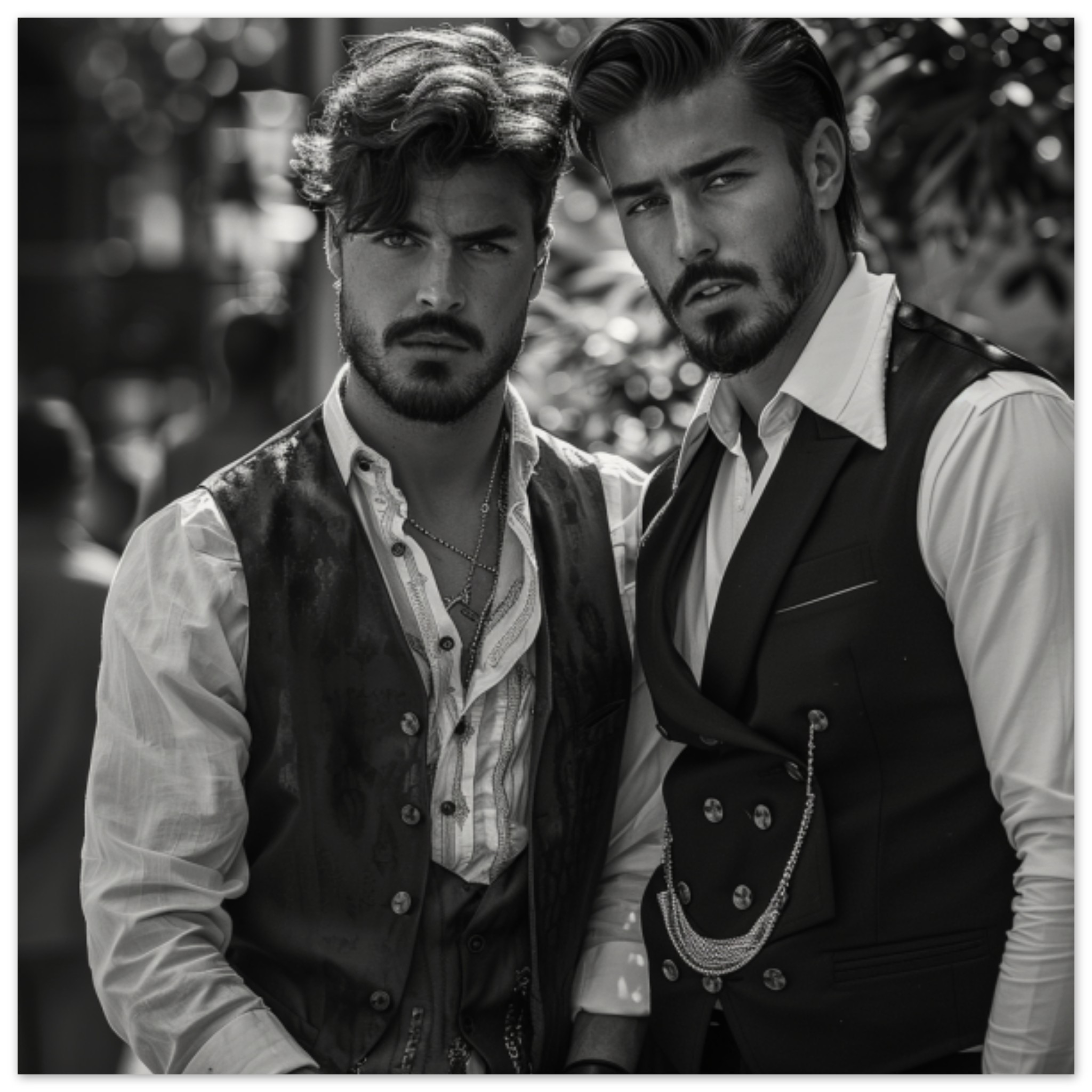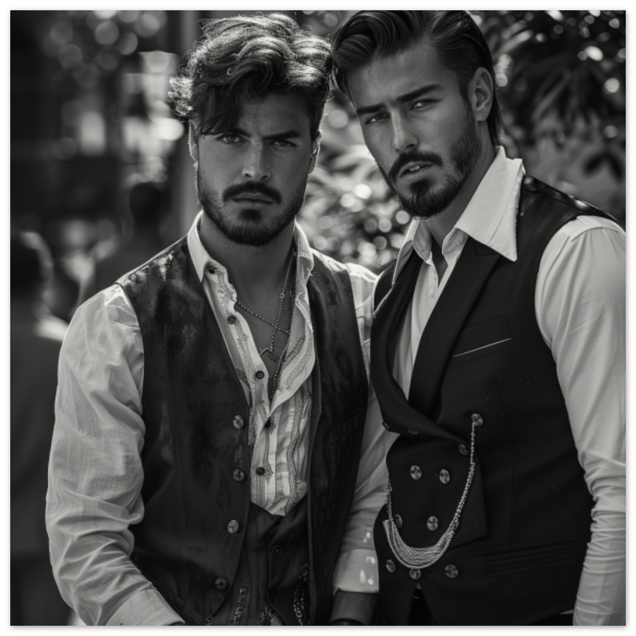 A group of men, all dressed in black and white suits, are posing for a picture outdoors. The men are standing on a street, looking dapper in their gentleman attire. One man in the center has a beard and mustache, wearing a hat, while another man on the right is wearing a vest. The image is in black and white, with the dominant colors being black and grey. The men are all well-groomed, with one man wearing a bow tie. The scene exudes a classic and elegant vibe, with a crowd of people in the background.
