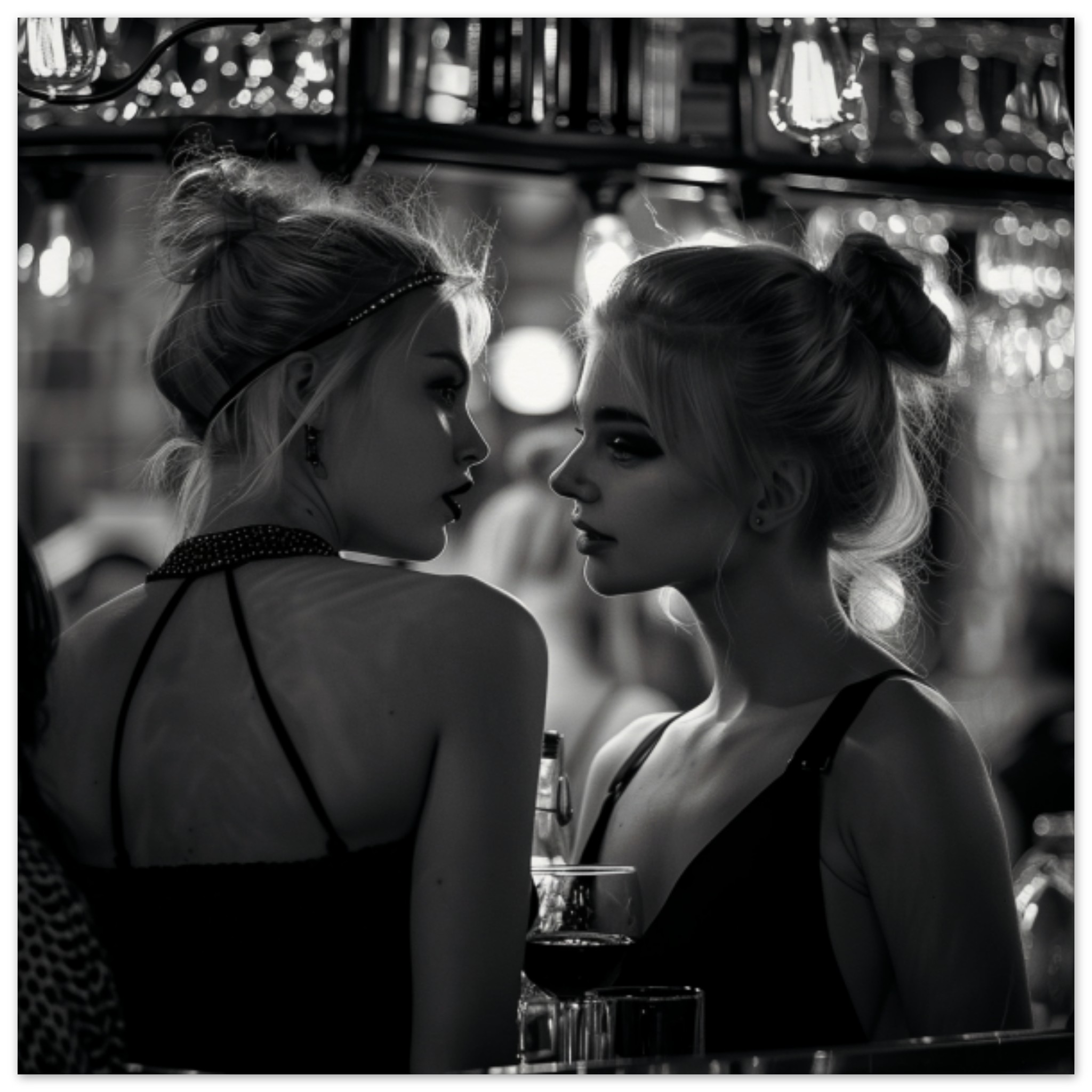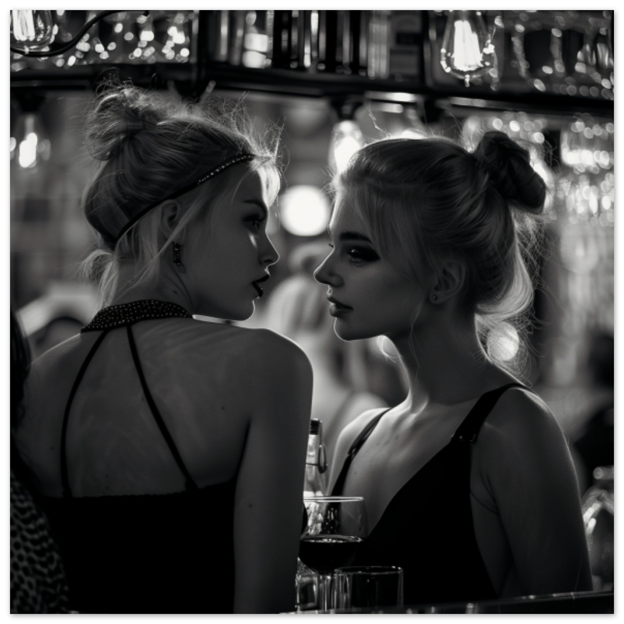 Two women are standing outside on a street, looking directly at each other. Both women have their faces visible, wearing casual clothing. One woman is wearing a black strappy top, while the other woman’s outfit is not specified. The image is in black and white, with a dominant color of black and grey. There is a glass of wine in the foreground. One of the women has a black spot on her arm. The women are in a crowded outdoor setting, possibly outside of a bar. The focus is on the interaction between the two women.