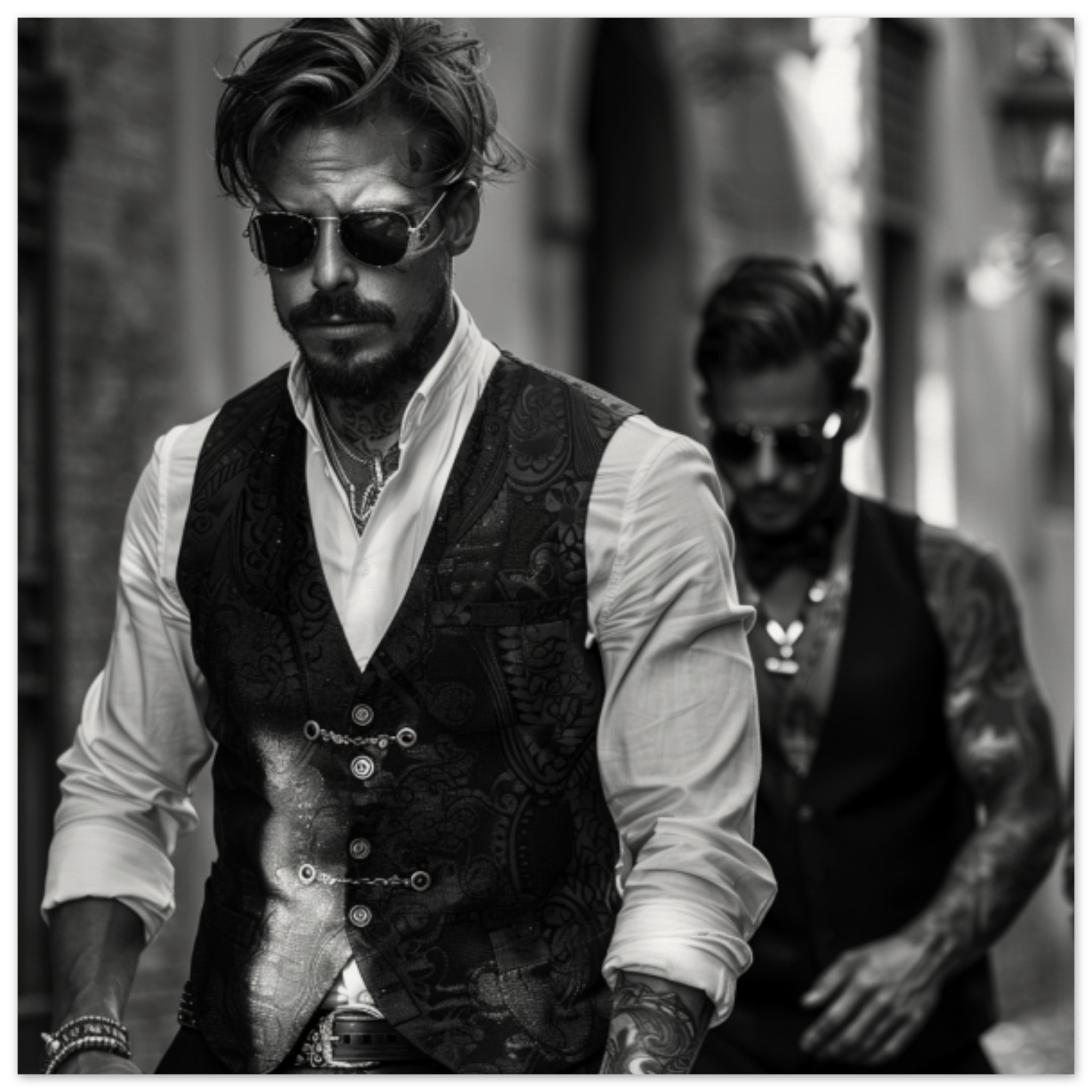 A black and white image depicting a man outdoors, wearing sunglasses and a vest. The man’s face is partially obscured by the sunglasses, with a dominant color scheme of black and grey throughout the image. The man is standing on a street, looking towards the camera. The image is focused on the man’s upper body, showcasing his stylish attire. The background is a neutral grey color, emphasizing the man’s outfit. The clothing is the main focus of the image, with the man exuding a sense of cool confidence in his ensemble.