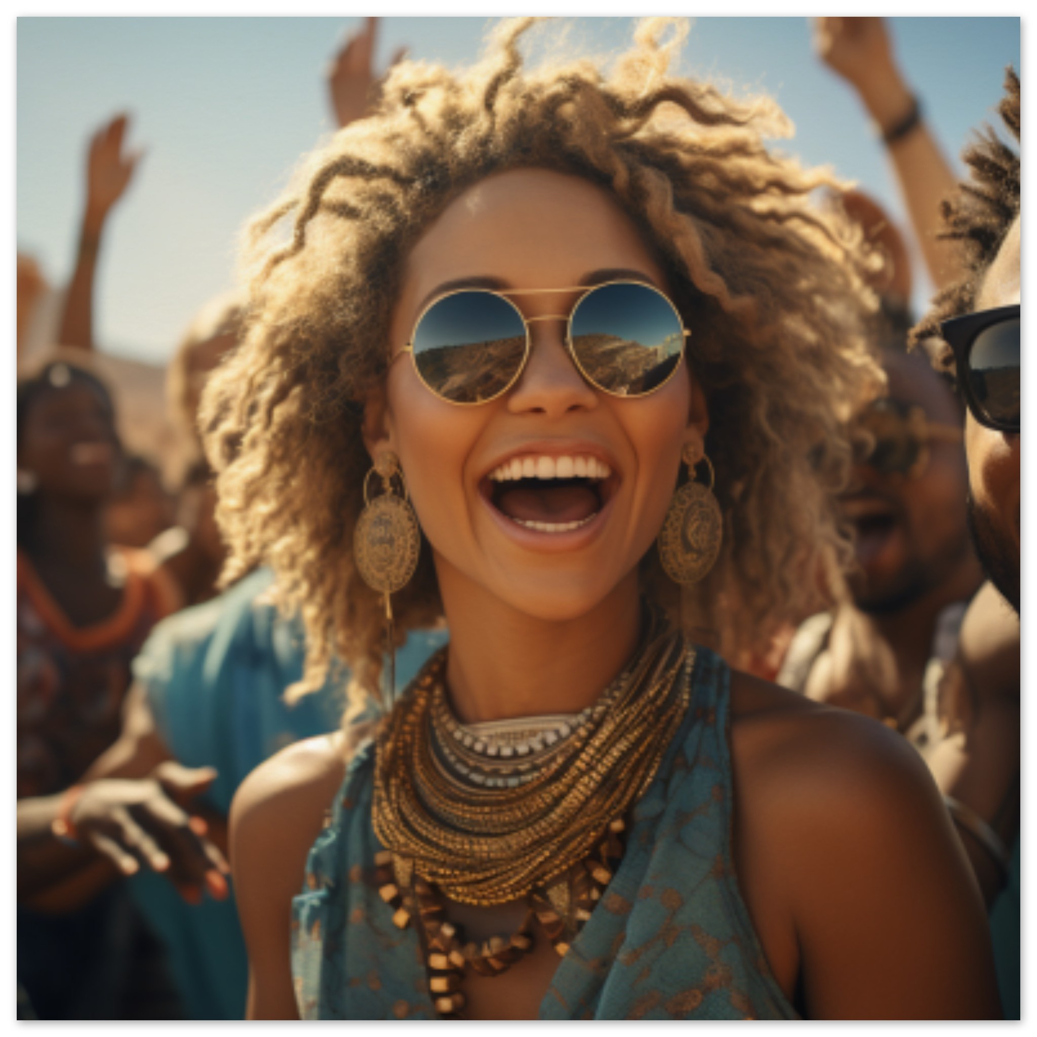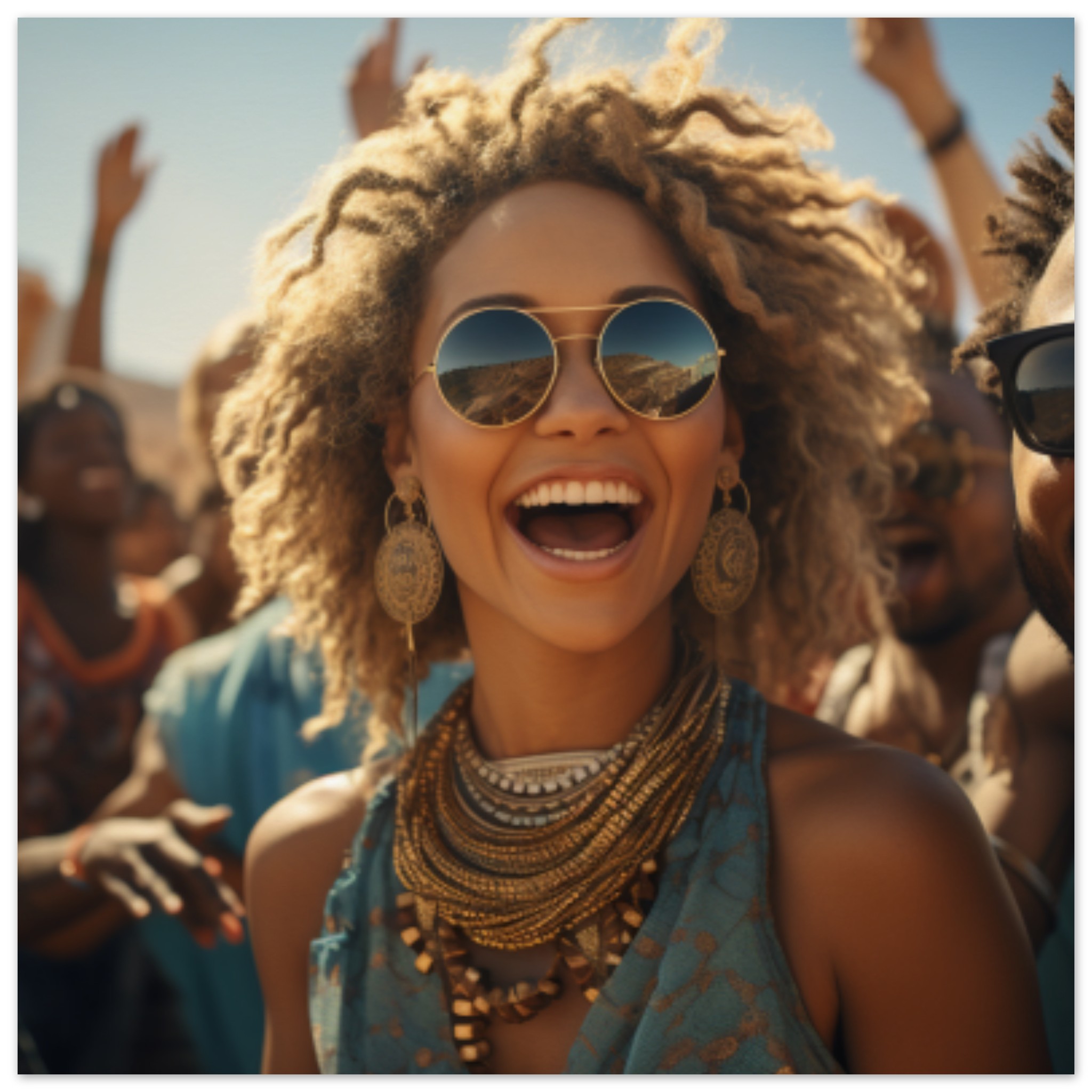A woman with long brown hair wearing stylish sunglasses and a vibrant blue dress stands confidently in front of a group of people. She is smiling and radiating happiness under the clear blue sky. The background consists of a diverse group of individuals, some wearing glasses as well. The dominant colors in the image are brown and black, with an accent color of 4E6E7D. The image is colorful and lively, capturing a moment of joy and togetherness. The woman’s fashion sense and positive demeanor make her the focal point of the scene.
