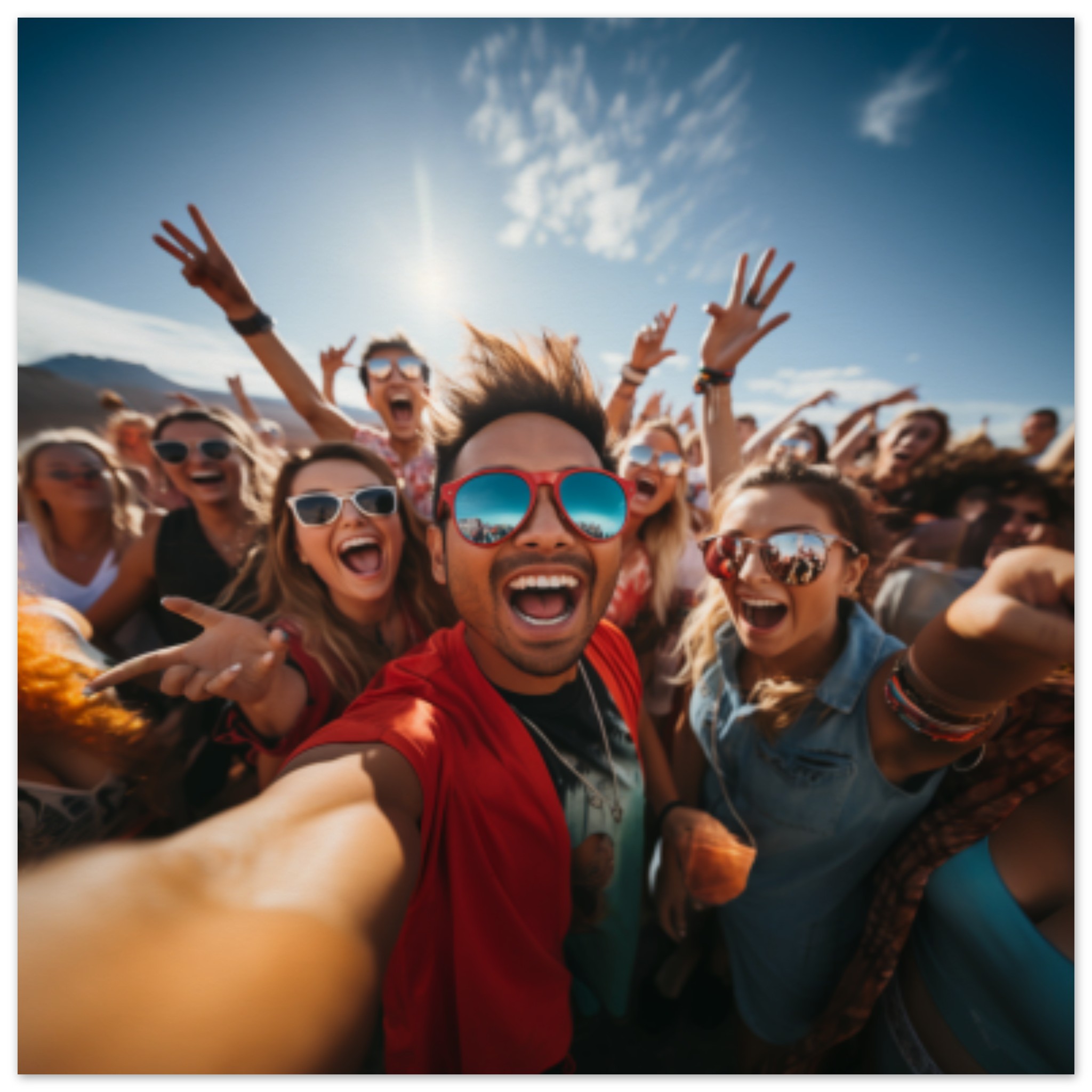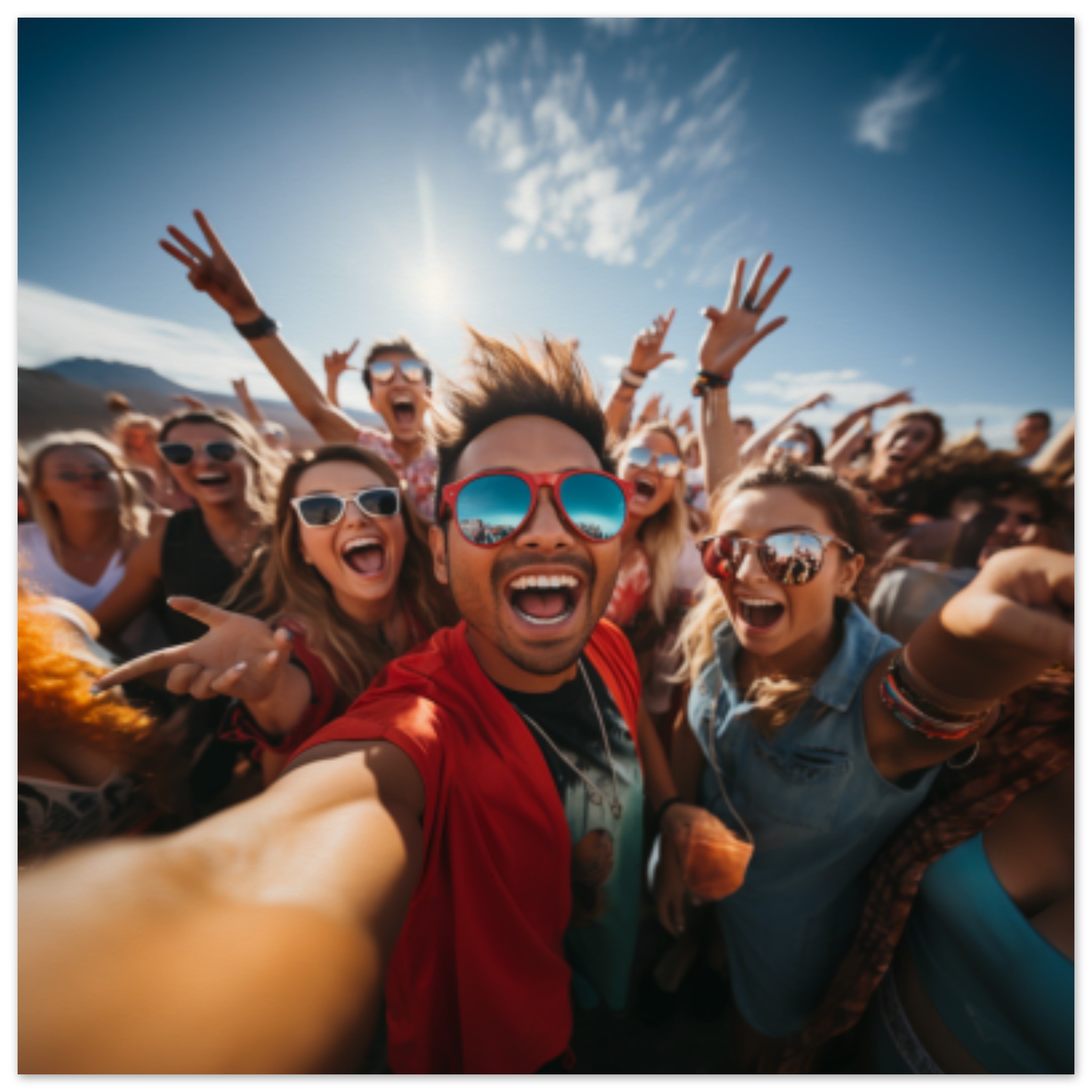 A group of four people, two women and two men, are gathered outdoors under a cloudy sky. One woman with red hair is wearing sunglasses and smiling, while another woman is wearing a blue shirt and a blue garment. The group is cheering and laughing, with one person pointing. Two of the individuals are taking a selfie with a fisheye lens, capturing the joyful moment. The foreground is dominated by brown and black colors, with the accent color being a deep blue. The image is vibrant and full of energy, showcasing a festive atmosphere.