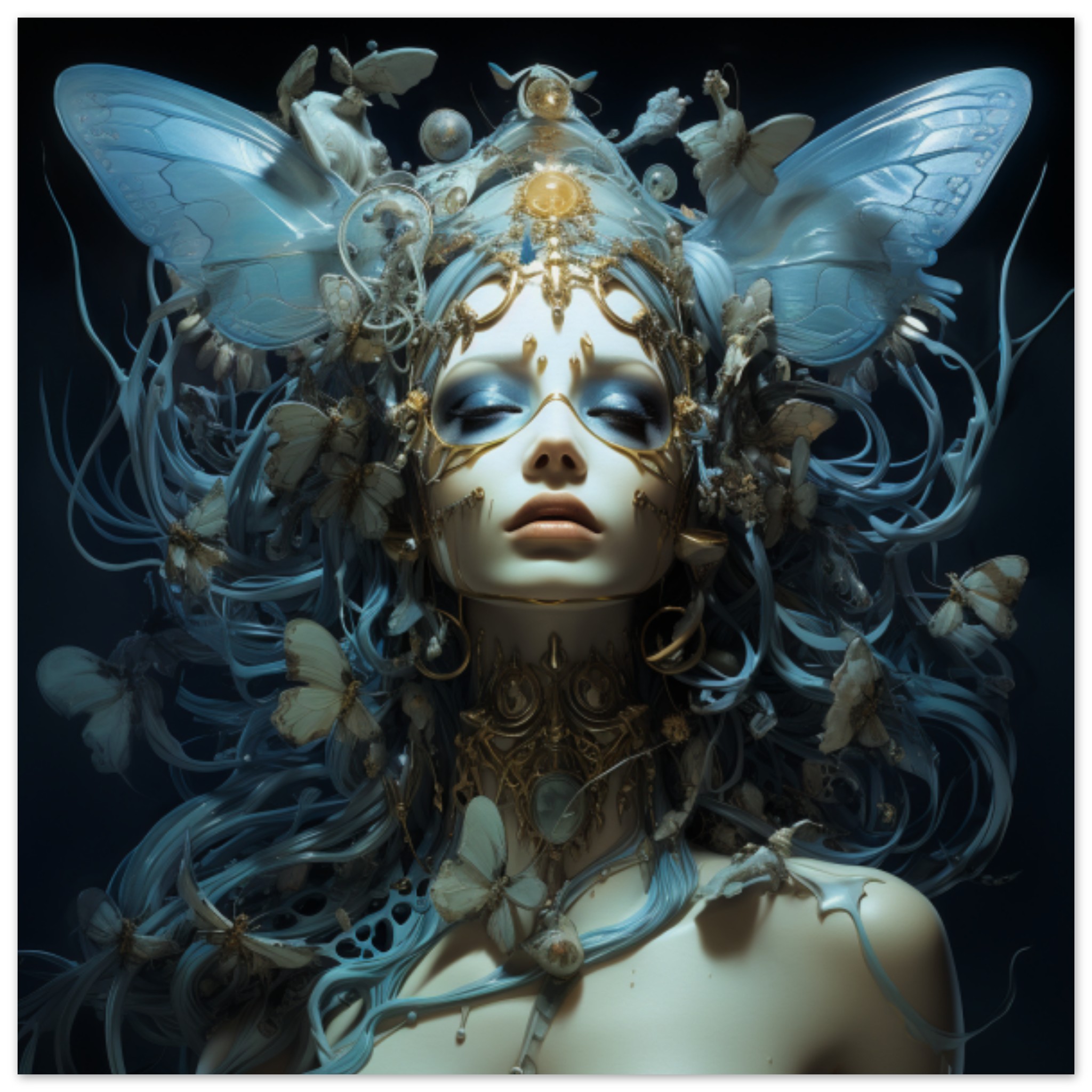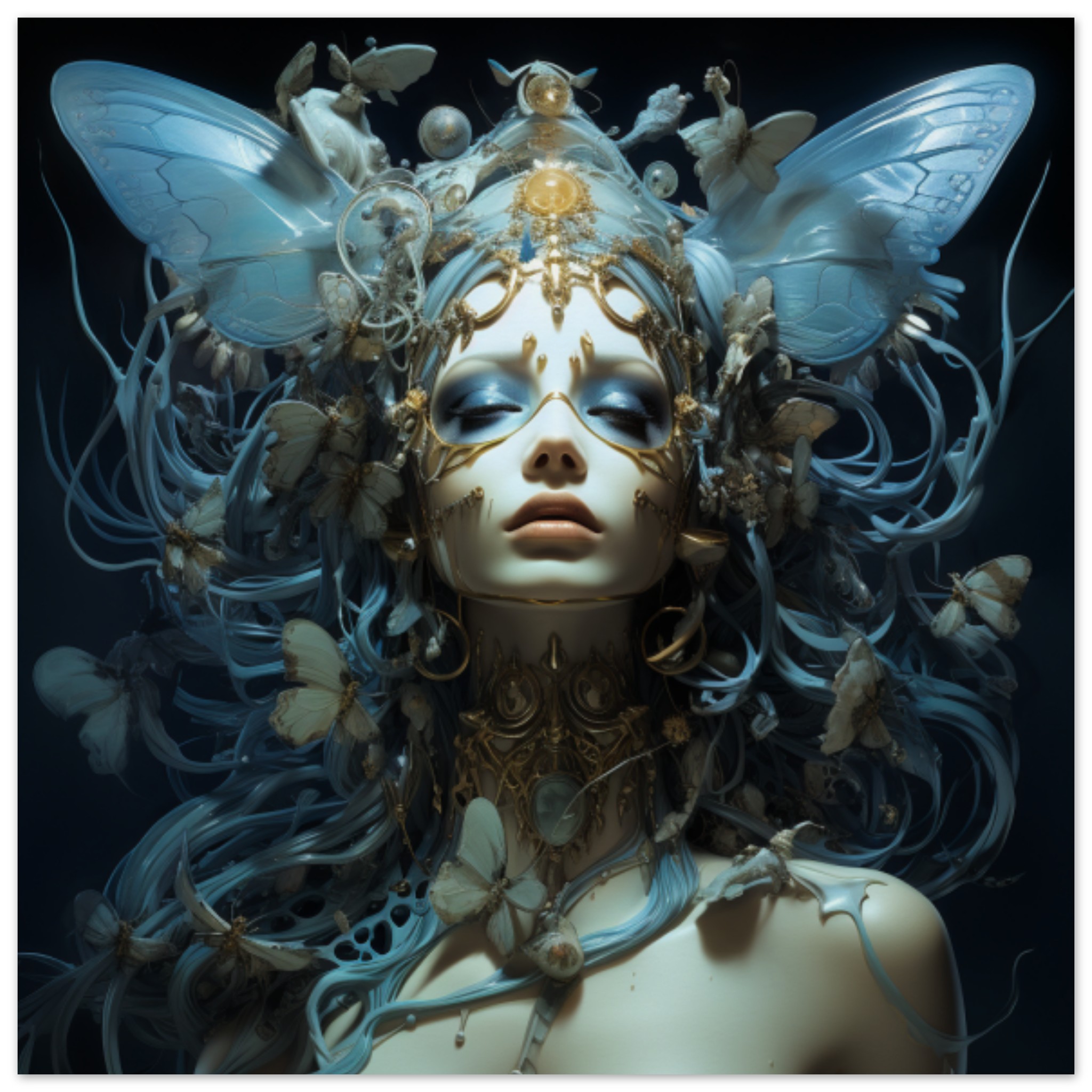 A woman is depicted wearing a garment adorned with intricate butterfly and wing designs. The garment is predominantly black in color, with the woman’s face partially visible in the center of the image. The background is also black, emphasizing the striking contrast of the garment. The image appears to be a form of art, possibly a sculpture, given the dominant color palette and detailed design. The woman’s face is located towards the center of the image, showcasing a serene expression. The overall composition exudes a sense of elegance and sophistication.