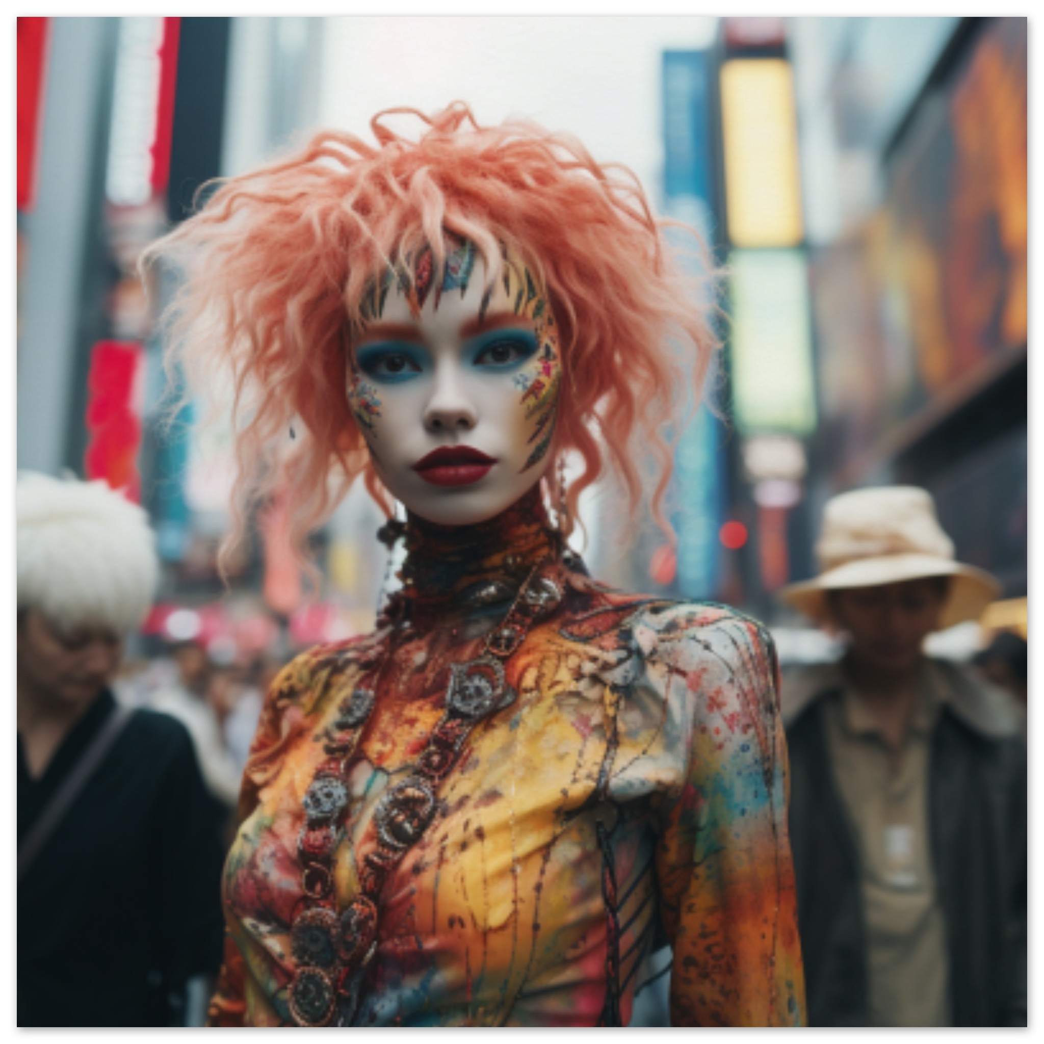 A woman with striking orange hair and vibrant, colorful makeup stands out in this image. She is wearing a unique outfit that suggests a costume or perhaps a Halloween costume. The background is dark, with a dominant color of black and grey. The woman’s face is the focal point, showcasing her bold makeup and edgy style. She is outdoors, possibly on the street, embodying elements of the goth subculture. The image is not in black and white and features a woman with a hat, along with other people in the background.