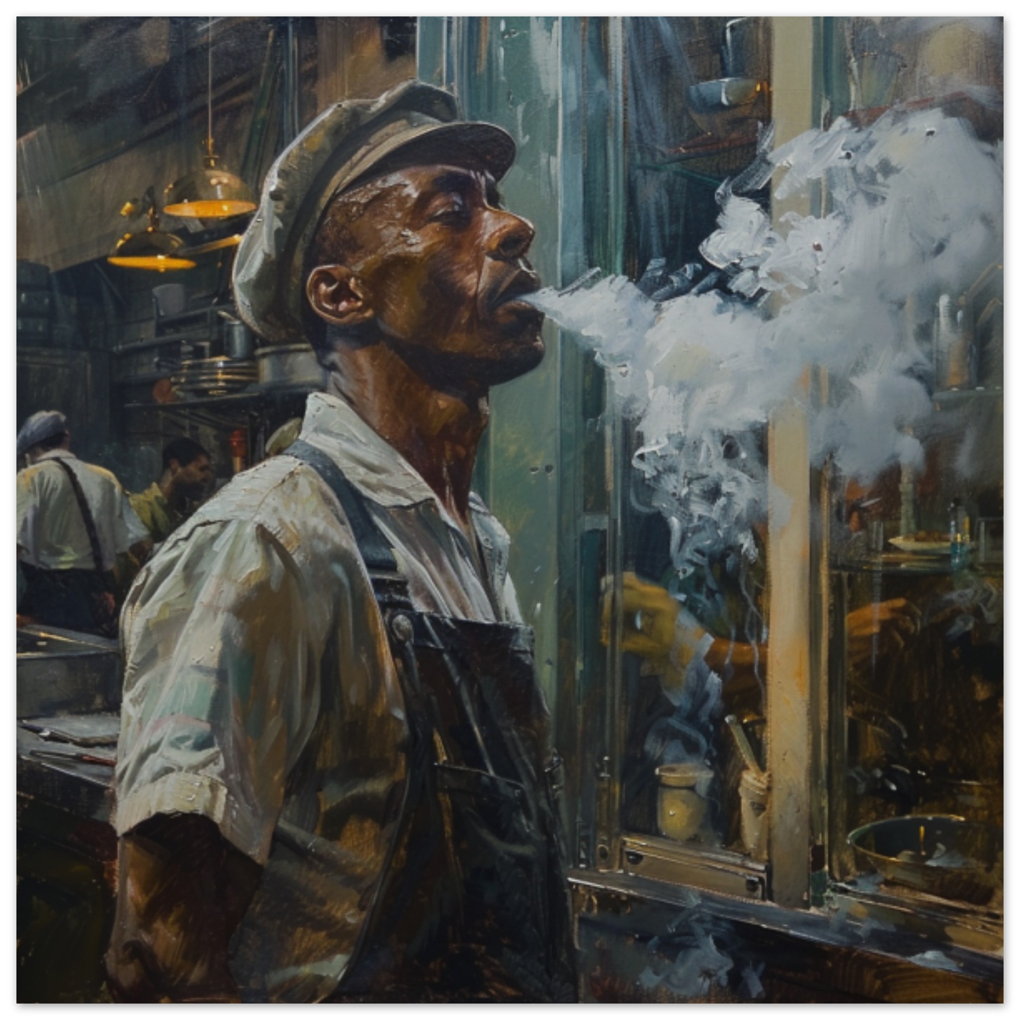 A man is depicted smoking a cigarette in this image. The man is wearing overalls and suspenders, standing on a street with a helmet nearby. The painting captures the man’s face in a blurry manner, with a dominant color scheme of grey and black. The person in the image is shown in various poses, with one close-up of their face. The overall scene has an artistic quality to it, with elements of street life and urban culture. This composition offers a glimpse into a moment of contemplation and rugged charm.