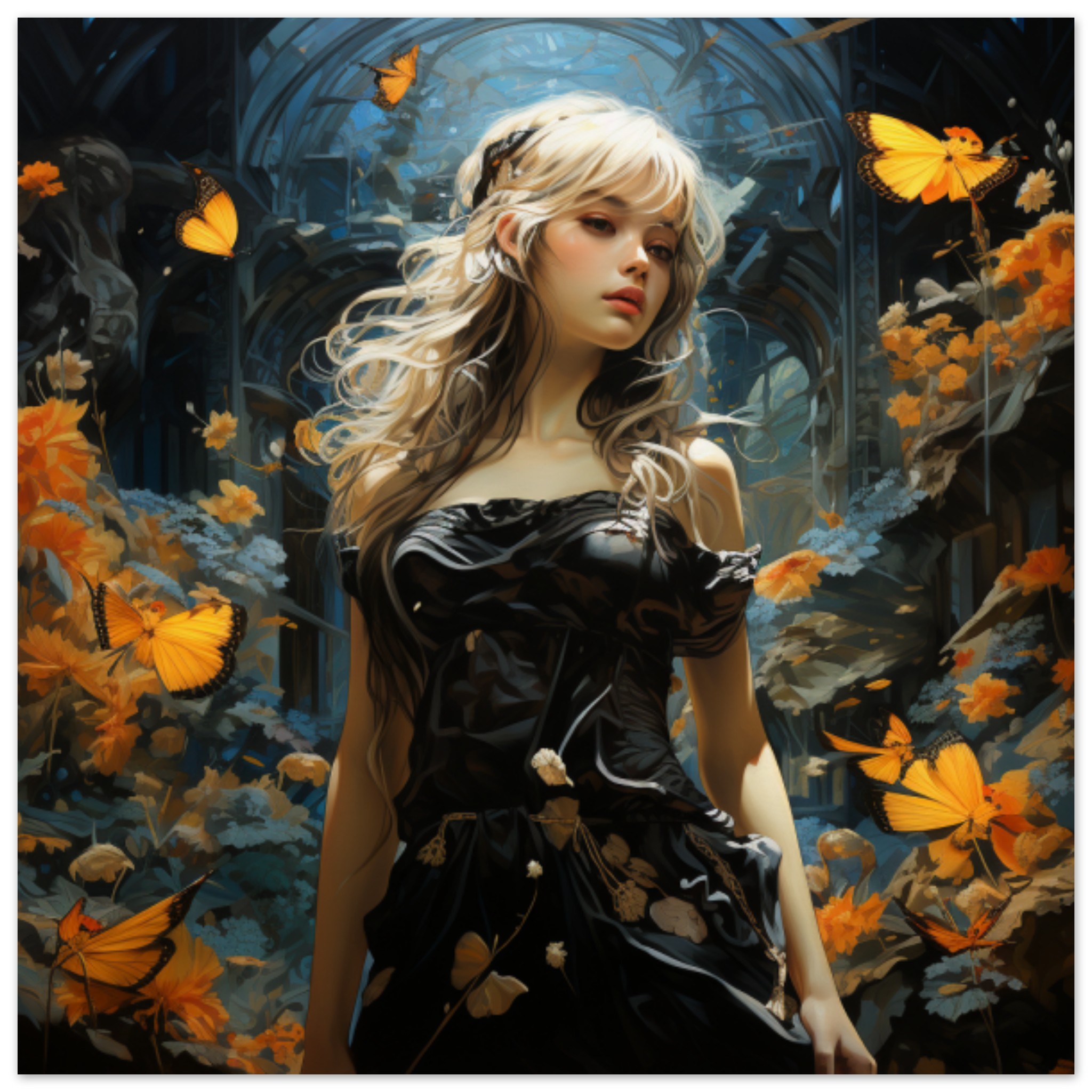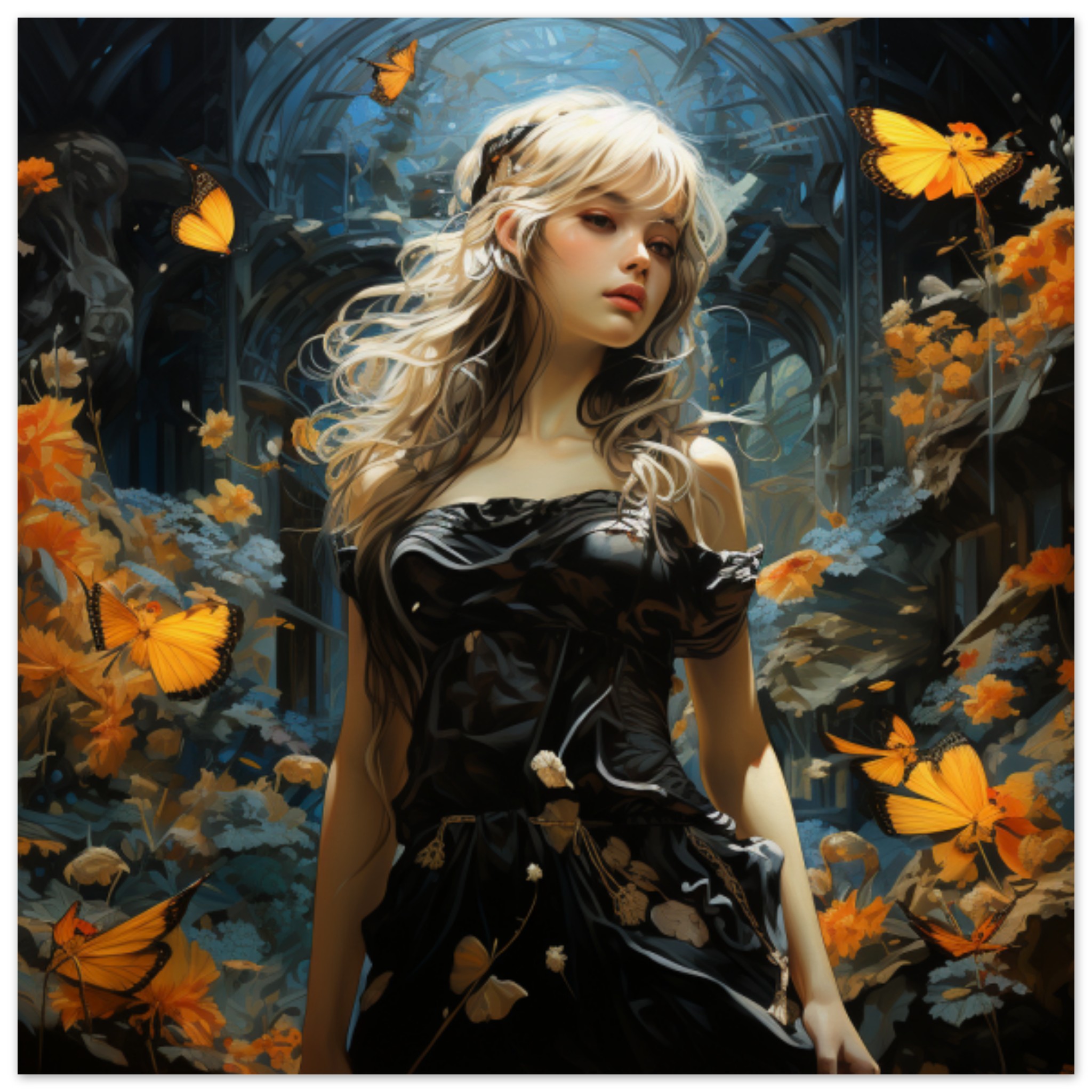 A stunning painting of a woman wearing a black dress, standing gracefully amidst a swarm of vibrant orange butterflies. The woman’s face is partially visible, displaying a serene expression. The dominant colors in the image are black and brown, with an accent color of deep blue. The artwork is rich in detail, showcasing intricate clothing and delicate features. The composition evokes a sense of beauty and tranquility, with the butterflies adding a touch of whimsy. Overall, it is a captivating and visually striking piece of art that captures the viewer’s attention.