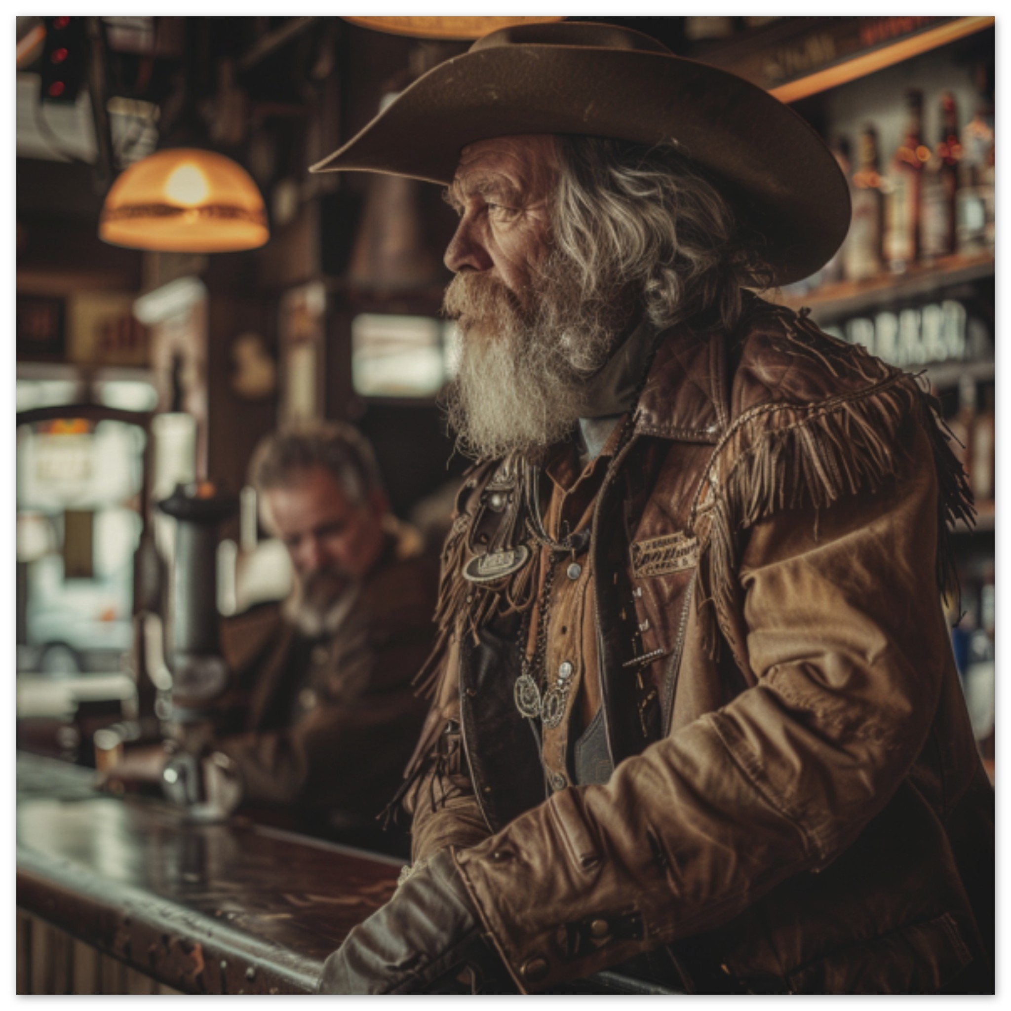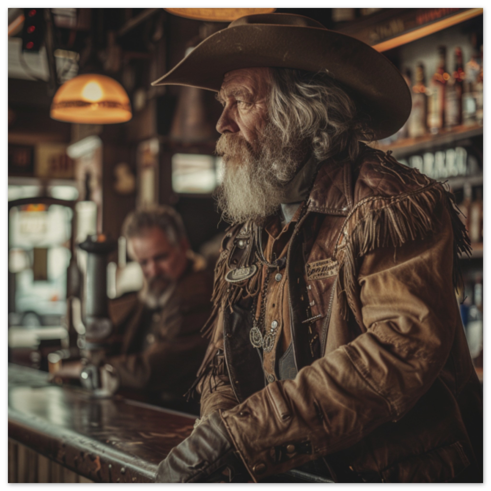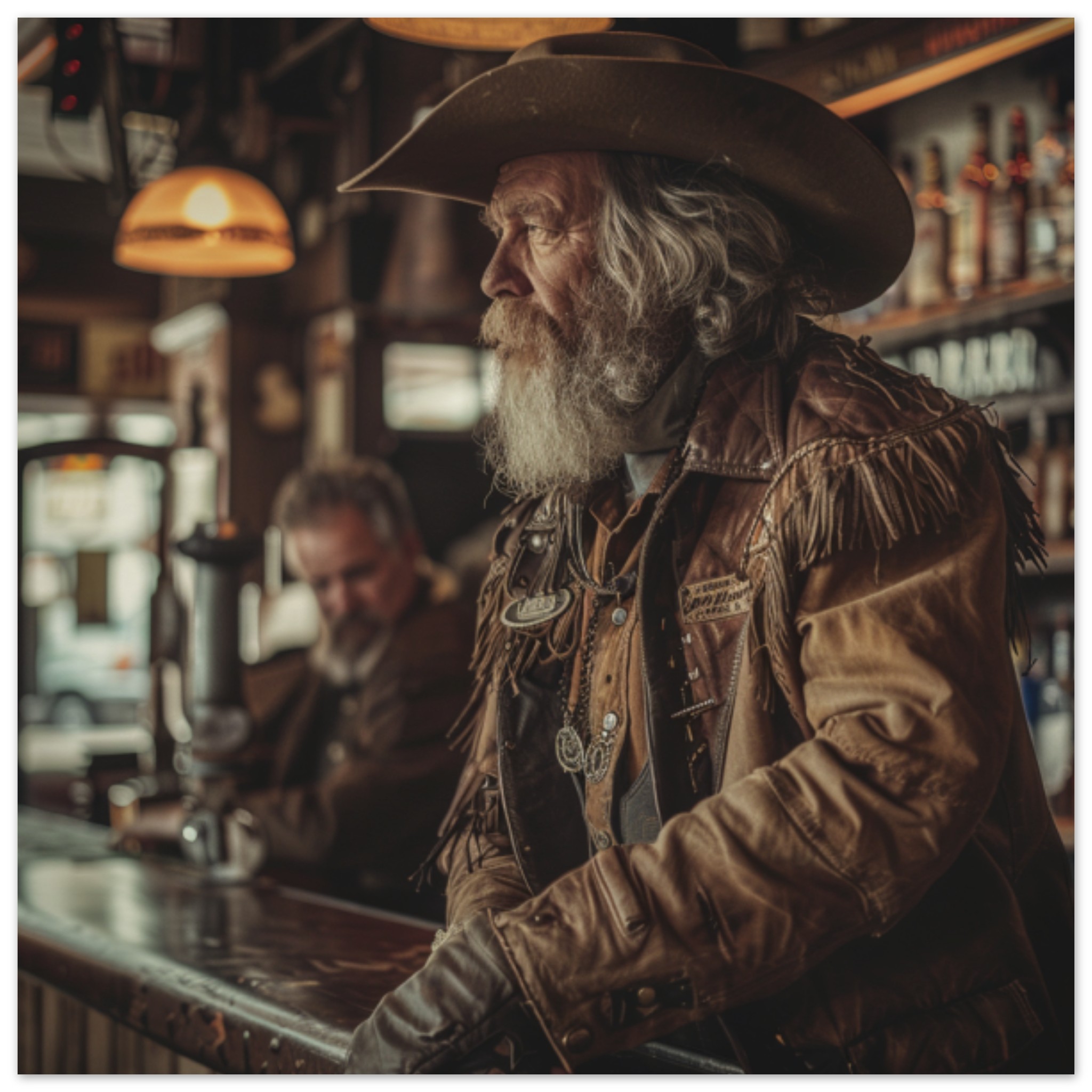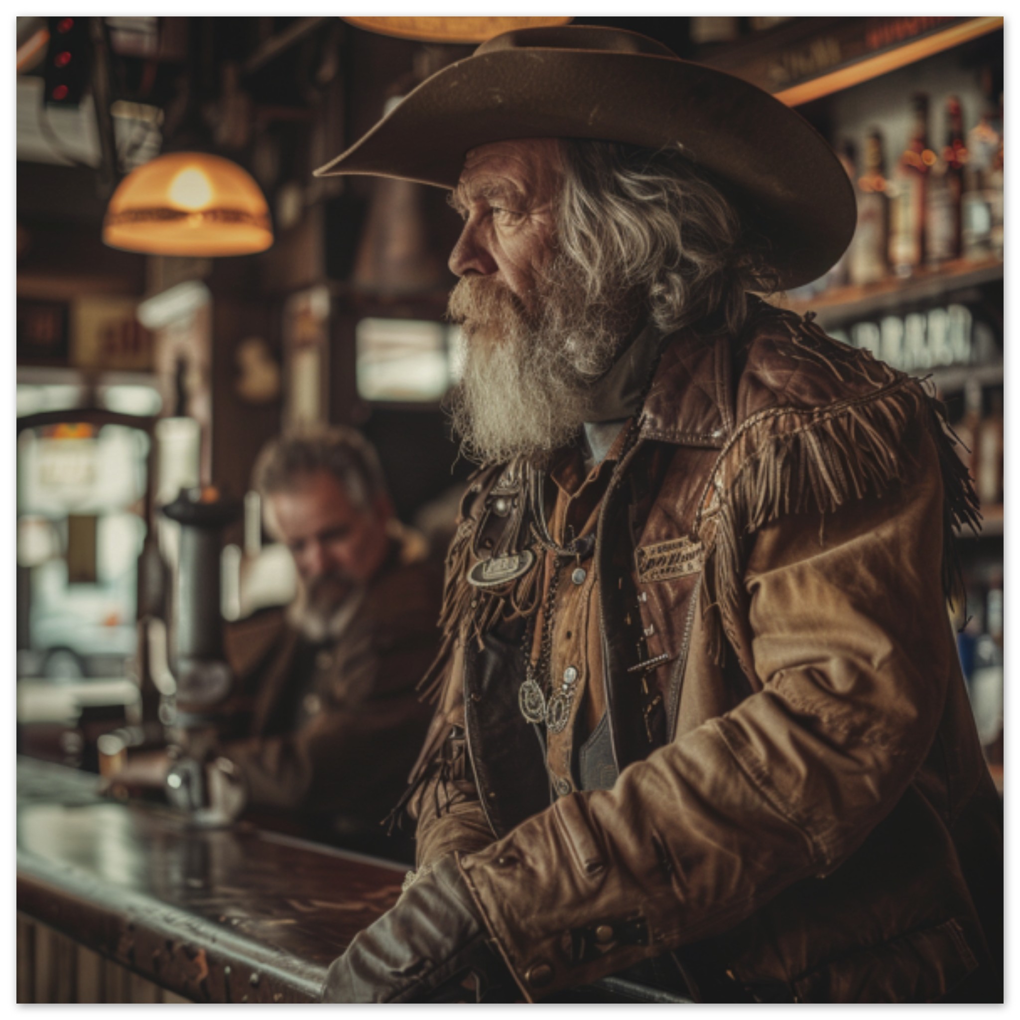 A man with a rugged appearance is wearing a black cowboy hat indoors. He has a full beard and is dressed in a stylish jacket. The dominant colors in the image are black and brown, with an accent color of a warm brown tone. The man is standing in front of a black background, and the image is not in black and white. The man’s face is the main focus, with a cowboy hat on his head. The image has a moderate score for adult, racy, and gory content.