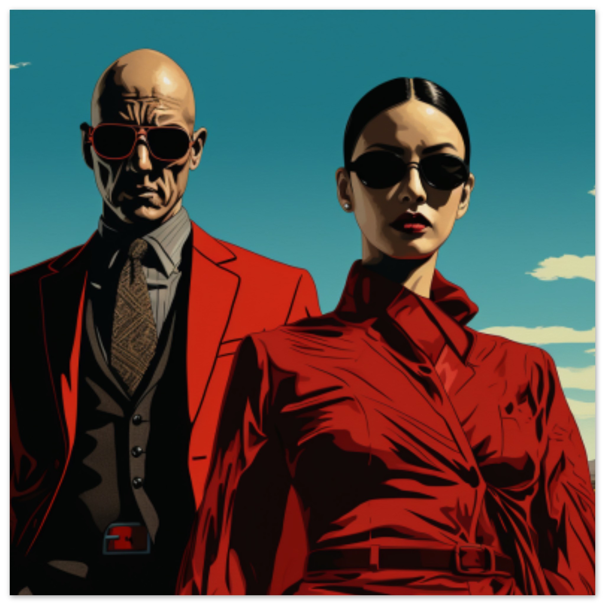 A man and woman are standing outdoors in a desert landscape. Both are wearing sunglasses, with the man in a suit and tie and the woman in a red shirt. They are smiling and looking towards the camera. The sky is clear with a few clouds, and mountains can be seen in the background. The dominant colors in the image are teal, black, and red. The man and woman are the main focus, with their faces clearly visible. The image portrays a happy and relaxed couple enjoying a sunny day in the desert.