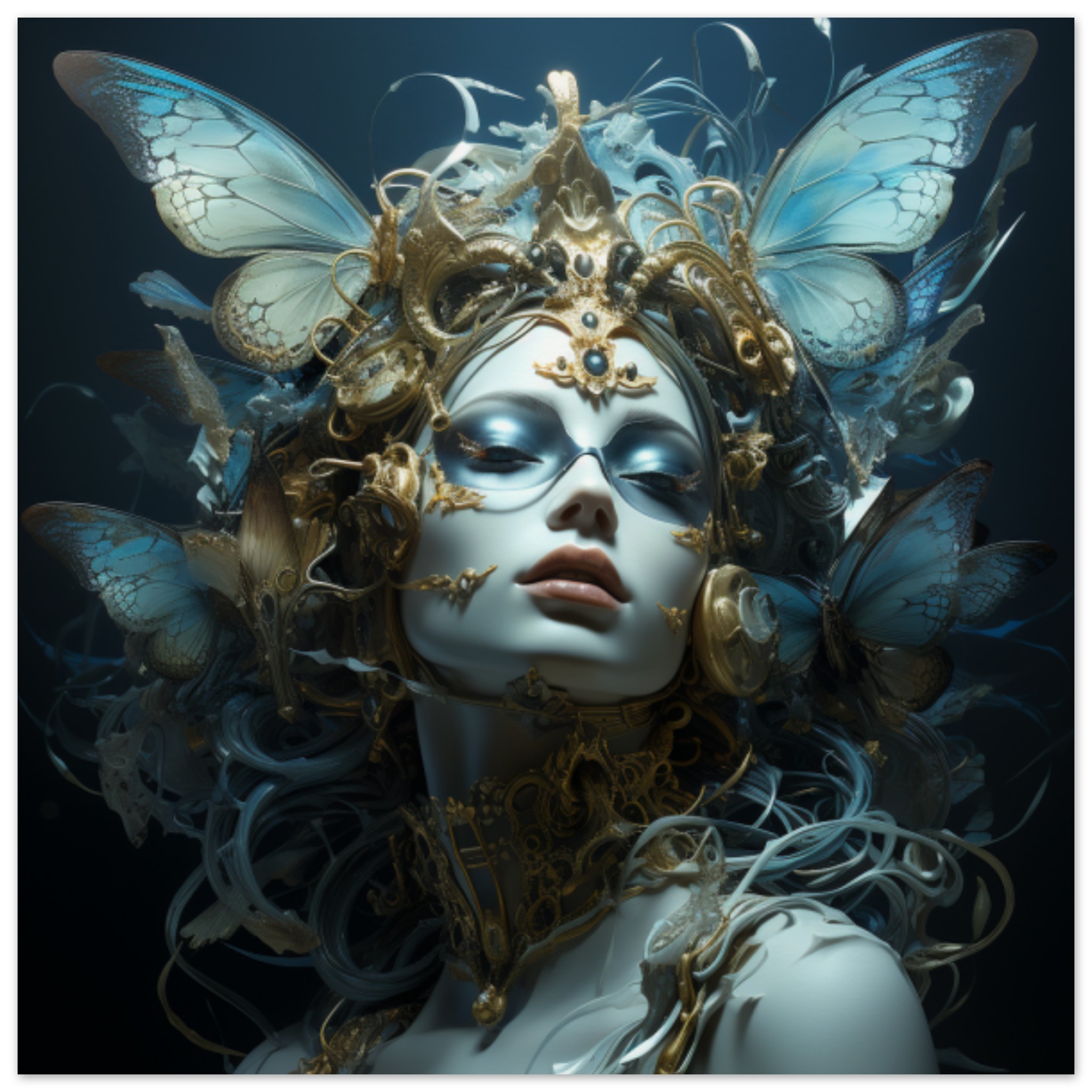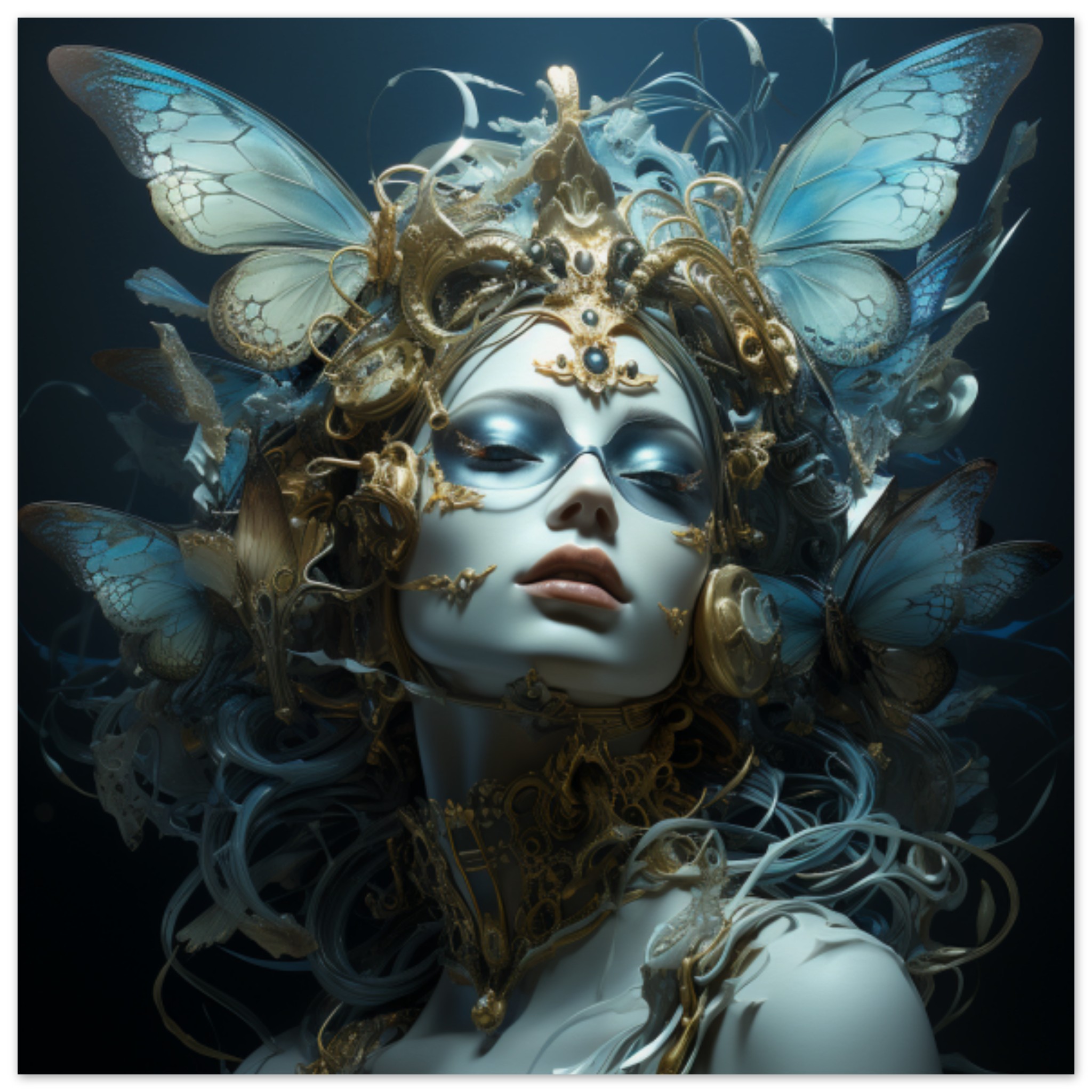 A mannequin is standing with butterfly wings attached to its back, showcasing a unique and creative display. The mannequin has striking gold and blue hair, adding to its whimsical appearance. It is wearing a headwear that complements the overall ensemble. The background is black, emphasizing the colorful and vibrant features of the mannequin. The image is focused on the mannequin’s face, highlighting intricate details such as the mask-like design. This imaginative and artistic creation evokes a sense of mystery and fantasy, ideal for fashion or theatrical purposes.