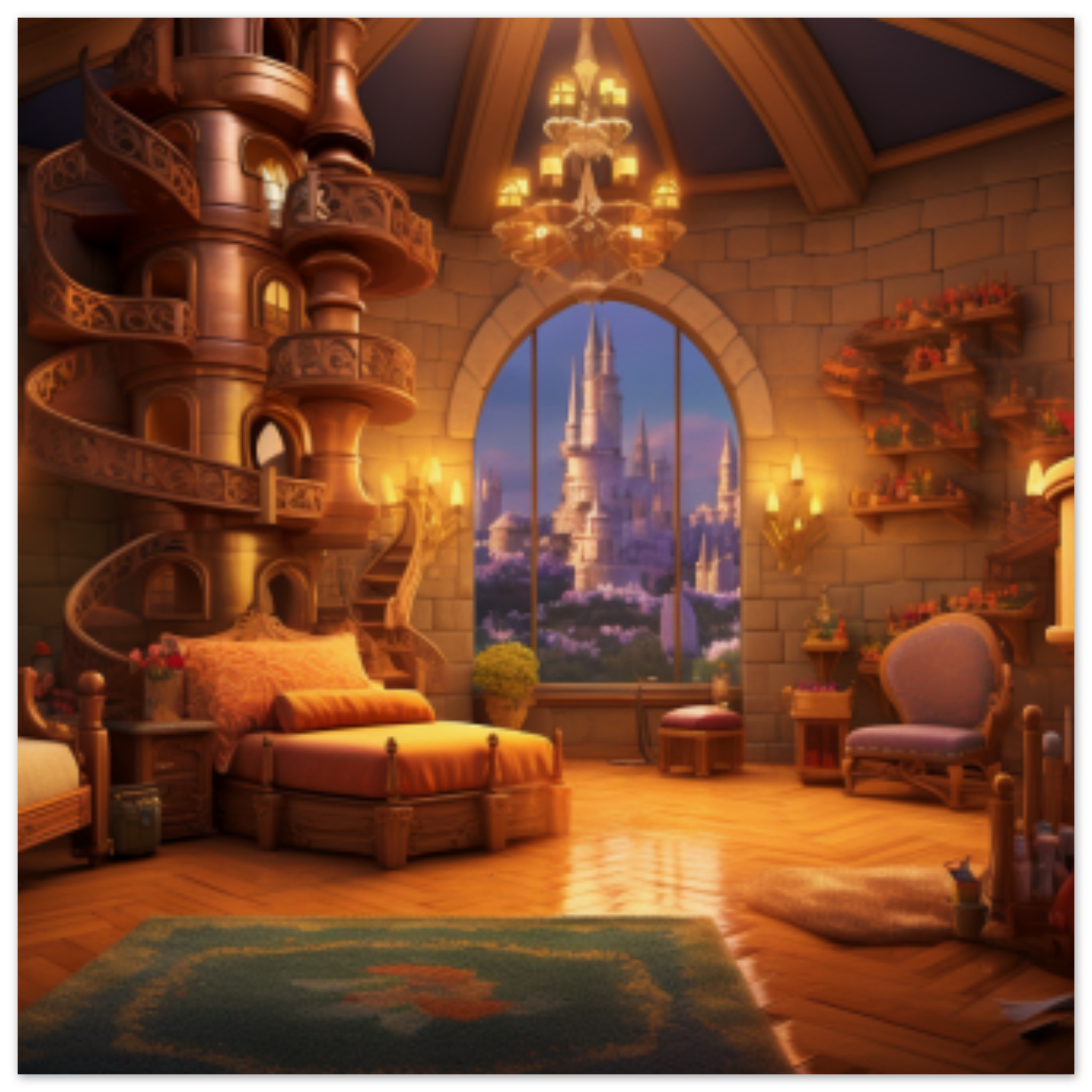 A cozy and elegant room featuring a spiral staircase and a comfortable bed. The room is beautifully designed with a blend of brown and black tones, creating a warm and inviting atmosphere. A purple chair with a wooden frame is placed in one corner, adding a touch of color to the space. The room also includes a couch, fireplace, and stylish furniture. Through the windows, a view of a castle with towers and trees can be seen. The room is well-lit with a unique triangle-shaped light fixture, making it a perfect place to relax and unwind.
