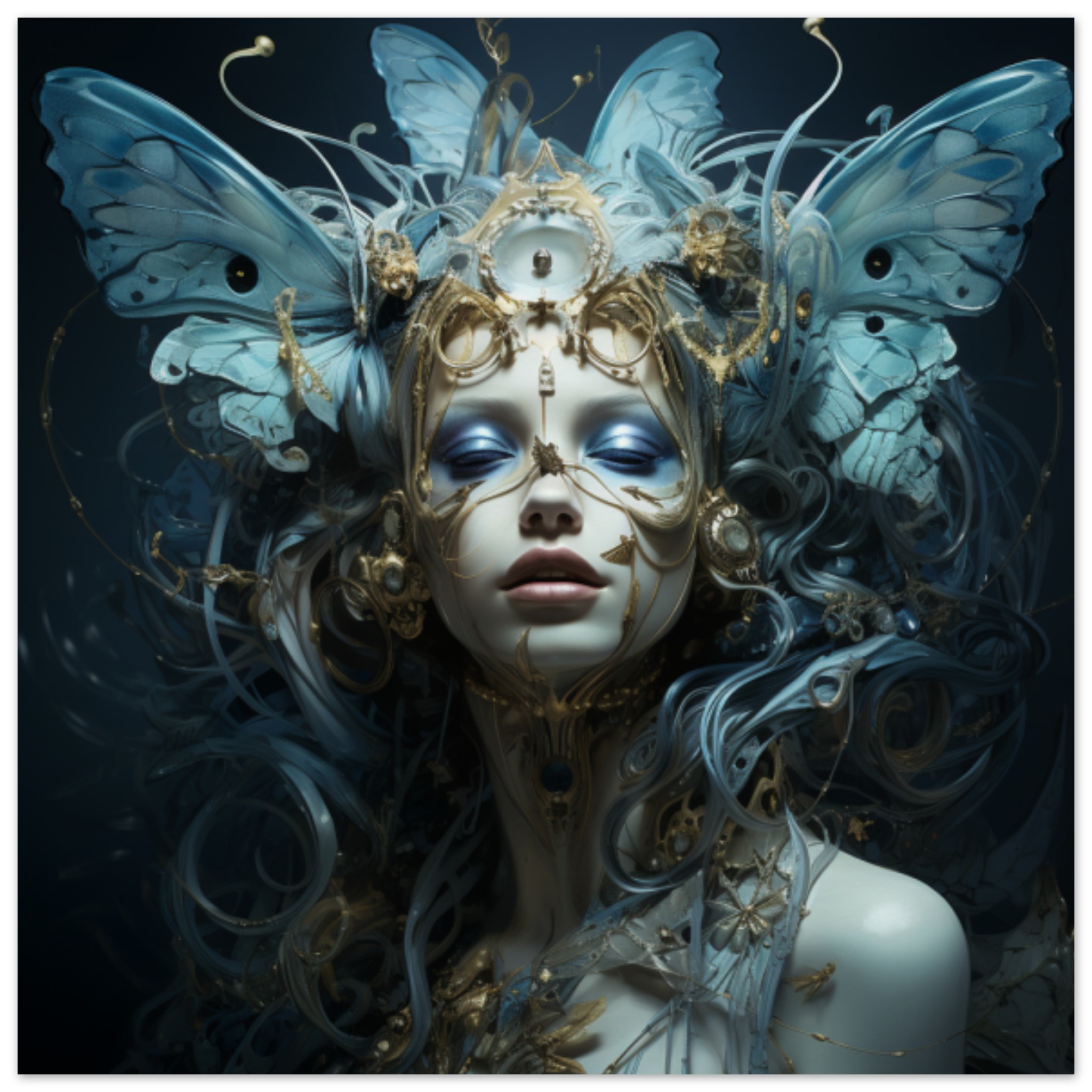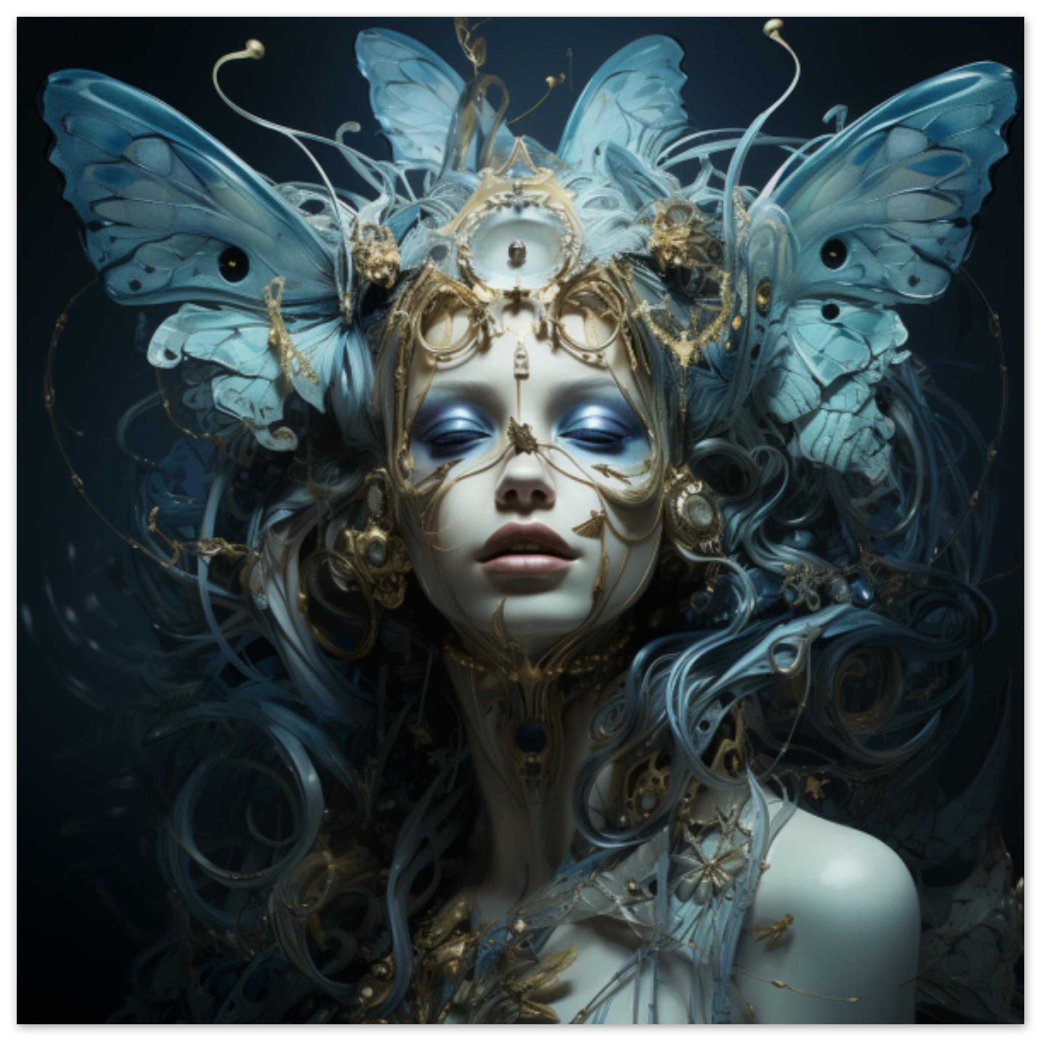 A striking image featuring a woman with blue and gold hair adorned with butterflies. She is wearing a captivating mask that covers her face, adding an air of mystery to her appearance. The dominant colors in the image are black, with a subtle accent color of 284D5E. The woman’s headwear is a focal point, with a score of 0.53 indicating its significance. The overall theme of the image suggests a blend of artistry and elegance, making it a visually captivating piece. The woman’s face is prominently featured, adding a personal touch to the composition.