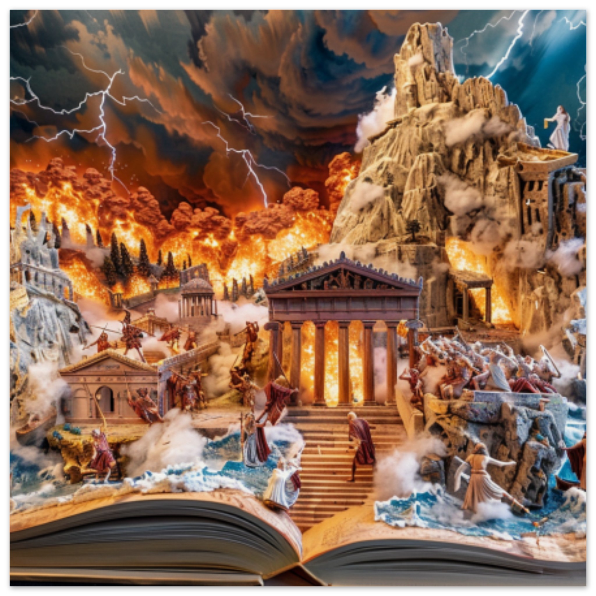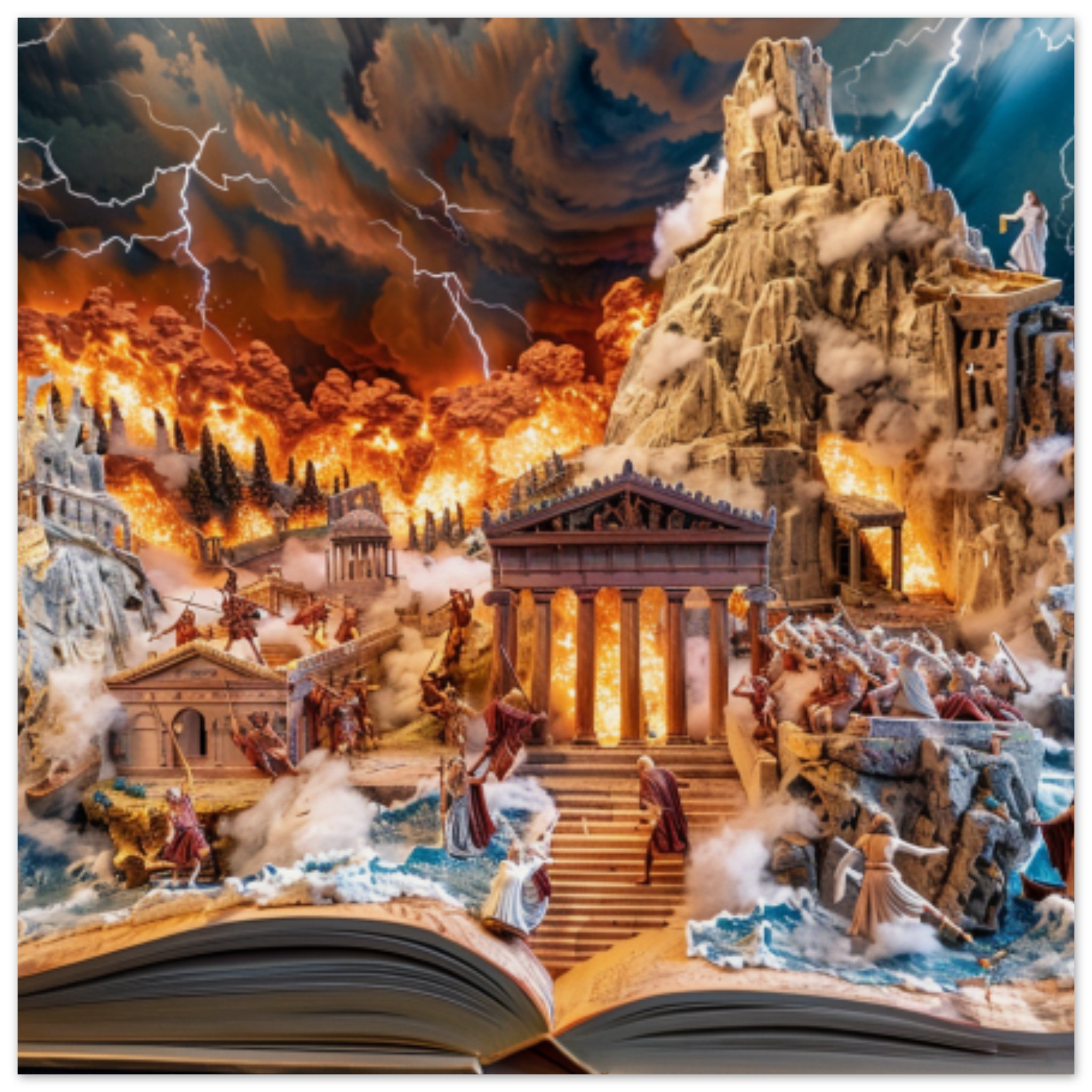 An open book is displayed, showcasing a painting of a majestic temple statue surrounded by a towering mountain. In the background, a dramatic scene unfolds as lightning strikes the sky, creating a sense of impending storm. The overall color scheme is dominated by various shades of brown, with an accent color of A96B22 adding contrast. The image exudes a sense of mystery and power, with elements of nature and ancient architecture combining to create a captivating scene. This unique composition offers a blend of artistry and natural beauty, making it a striking visual narrative.