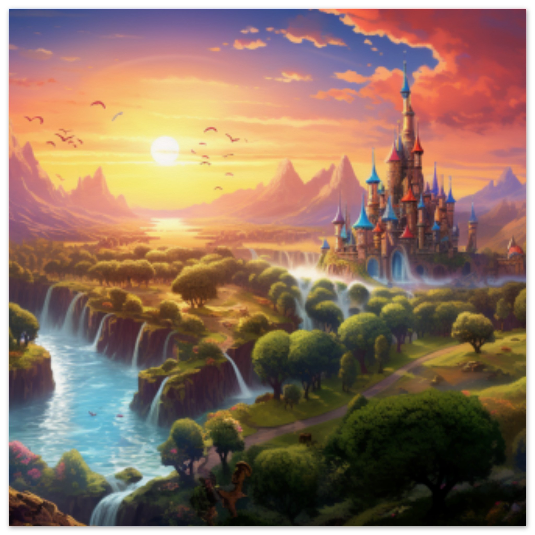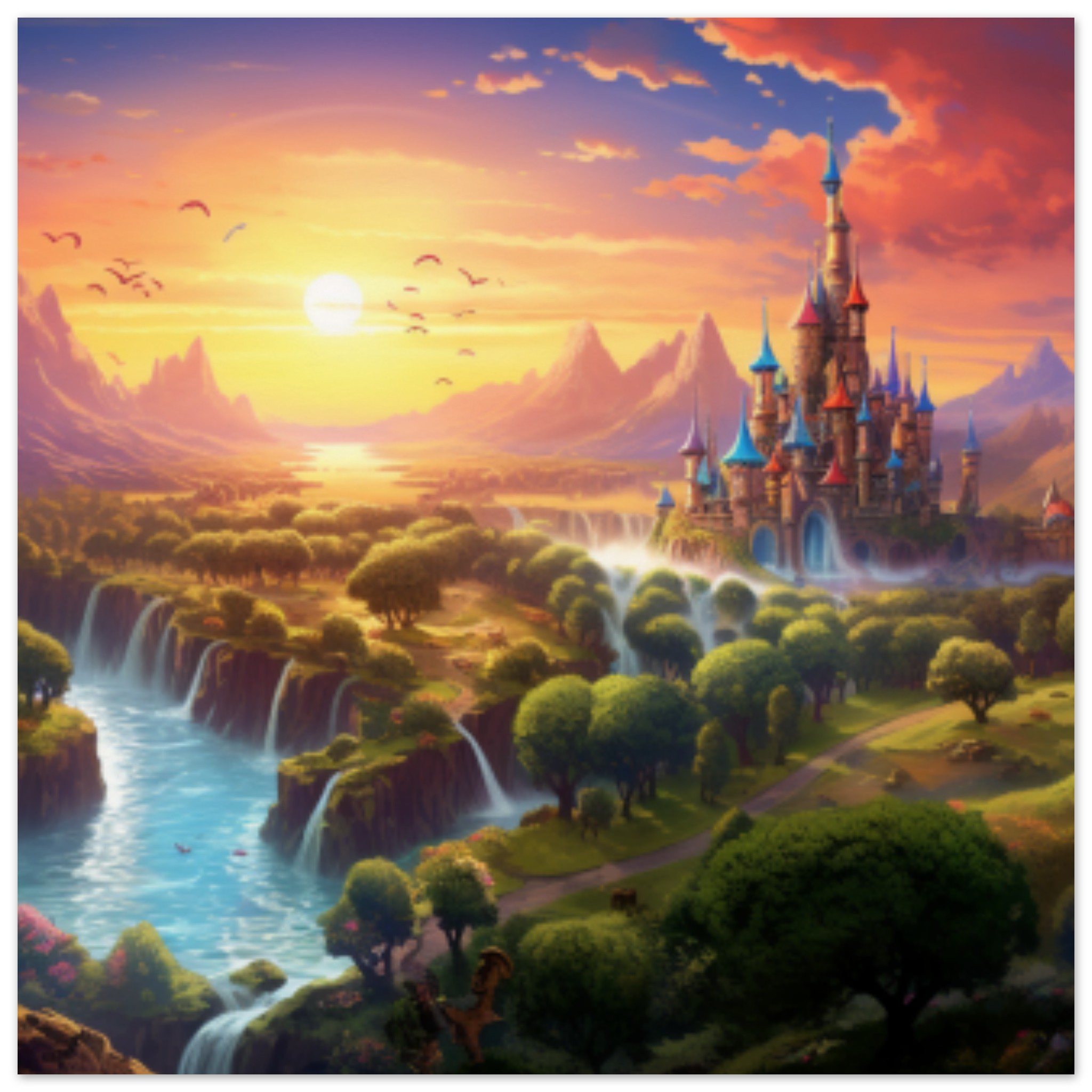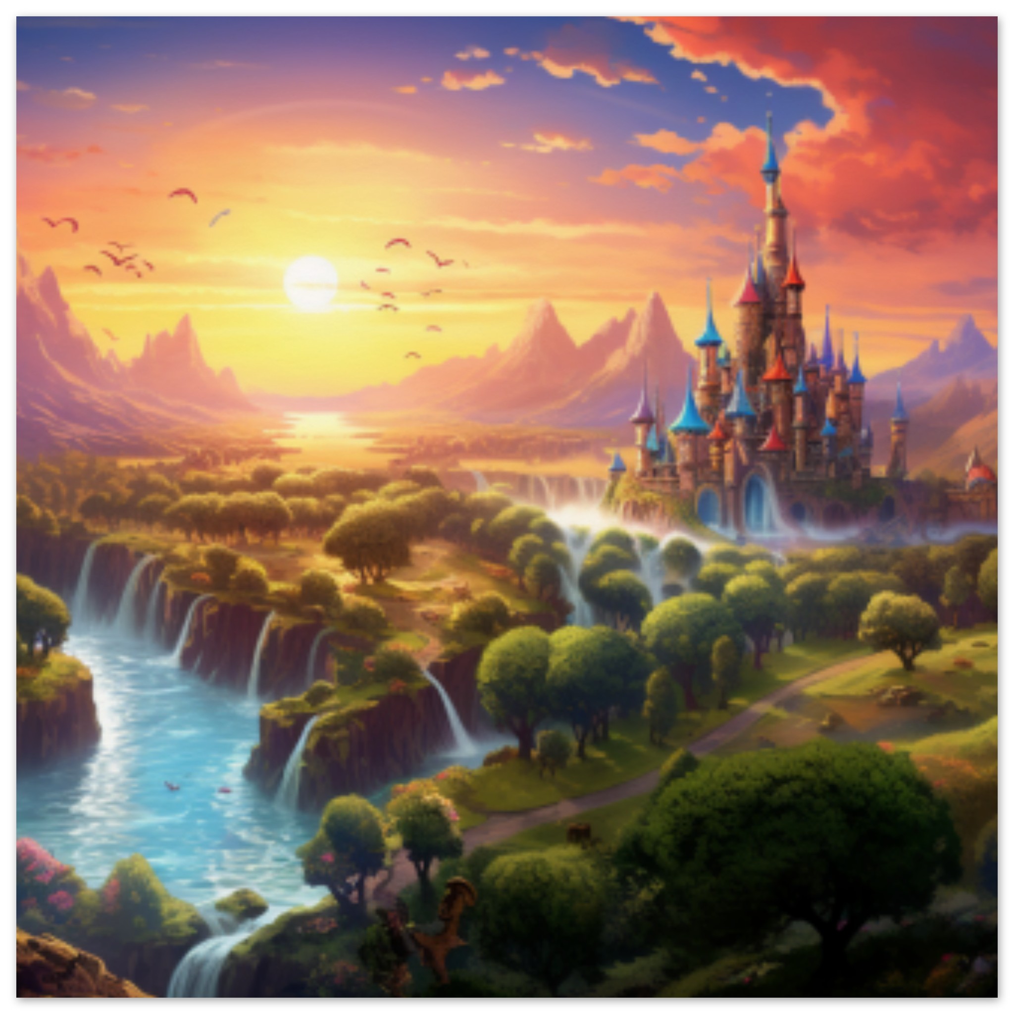 A majestic castle with towering spires sits alongside a serene river, creating a picturesque scene. The castle is surrounded by lush greenery and the river flows peacefully through the landscape. The sky above is painted with soft clouds, hinting at a beautiful sunset or sunrise. The overall atmosphere is calm and magical, as if taken from a fairy tale. This painting captures the essence of nature and beauty, with the castle standing as a symbol of strength and royalty against the backdrop of the stunning landscape.