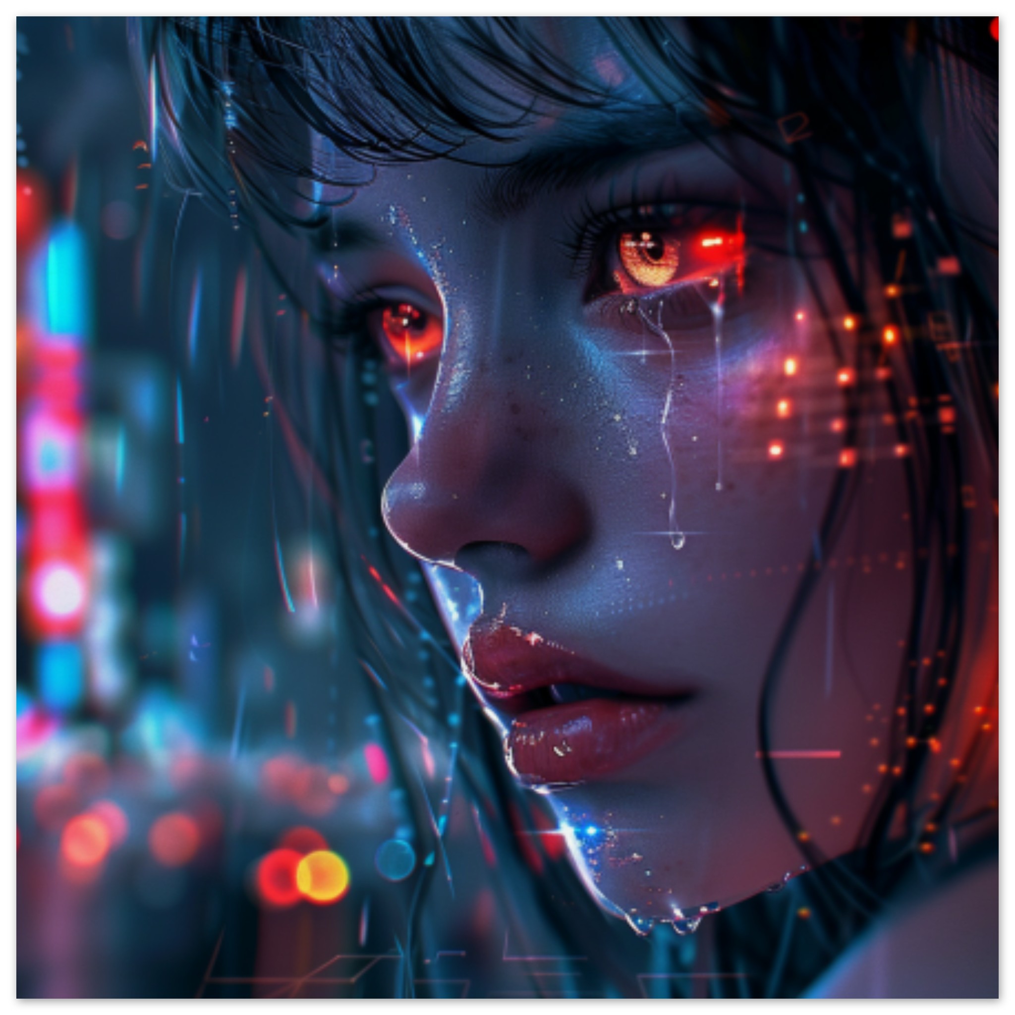 A digital art piece depicting a woman crying is shown in this image. The woman has red eyes, conveying deep sadness and emotion. The background is dark, enhancing the somber mood of the artwork. The dominant colors in the image are black, with an accent color of AB2320 adding a touch of intensity. The woman’s face is the main focus, with her lips and expression drawing attention. This emotional portrait captures the raw vulnerability and pain of the woman, making it a powerful and evocative piece of art.