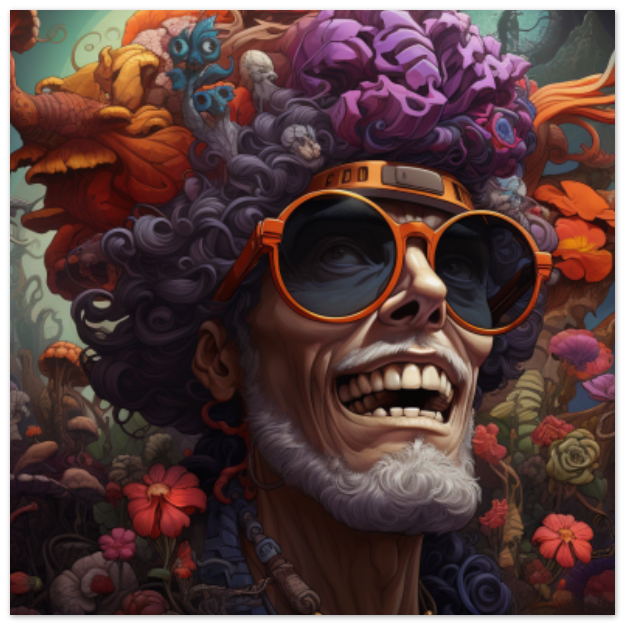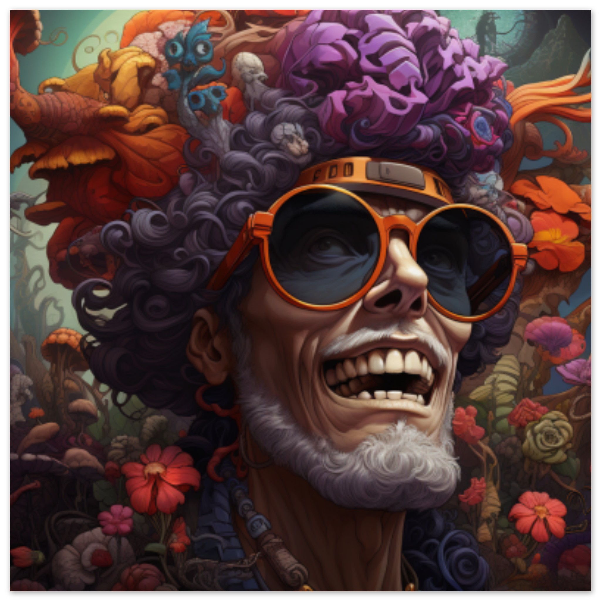 A man with curly hair and orange sunglasses is standing in front of a colorful reef mural. He is wearing a black shirt and has a confident expression on his face. The background is dominated by black and brown colors, with the man’s sunglasses accentuated in a vibrant orange shade. The image is vibrant and artistic, with a touch of whimsy. The man’s glasses are a prominent feature, adding a playful element to the scene. The overall composition is lively and engaging, capturing a moment of urban artistry and individuality.