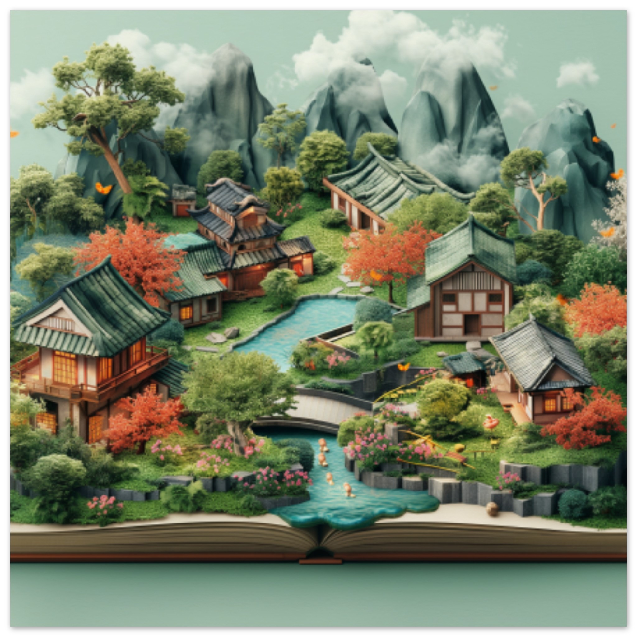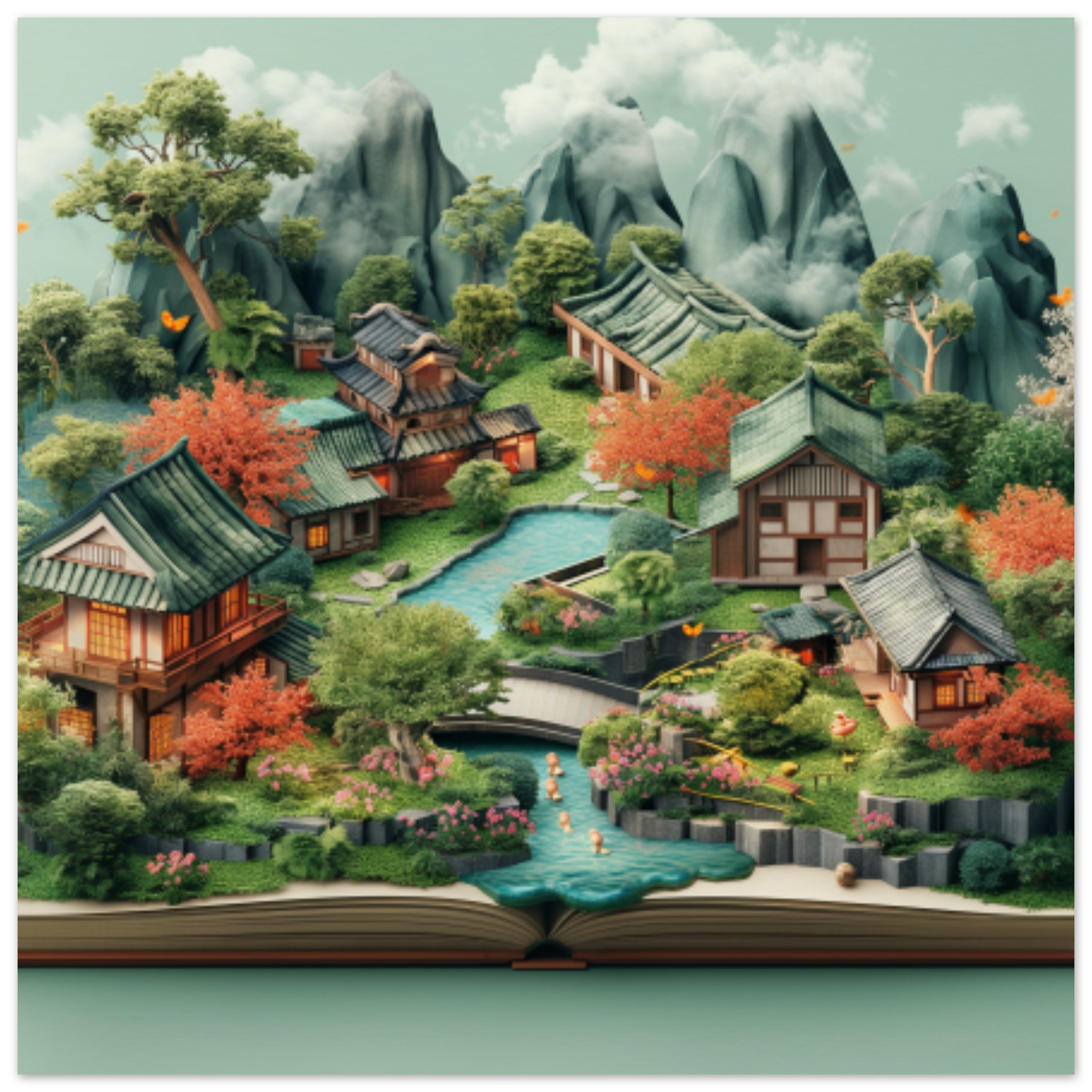 A detailed painting of a serene landscape featuring a small village nestled among lush greenery and colorful flowers. The artwork is depicted in a book, showcasing intricate details and vibrant colors. The dominant colors in the painting are green and white, creating a peaceful and harmonious atmosphere. The accent color of the painting is a warm brown tone. The scene evokes a sense of tranquility and beauty, inviting viewers to immerse themselves in the idyllic setting. The painting captures the essence of nature and rural life, making it a captivating piece of art.