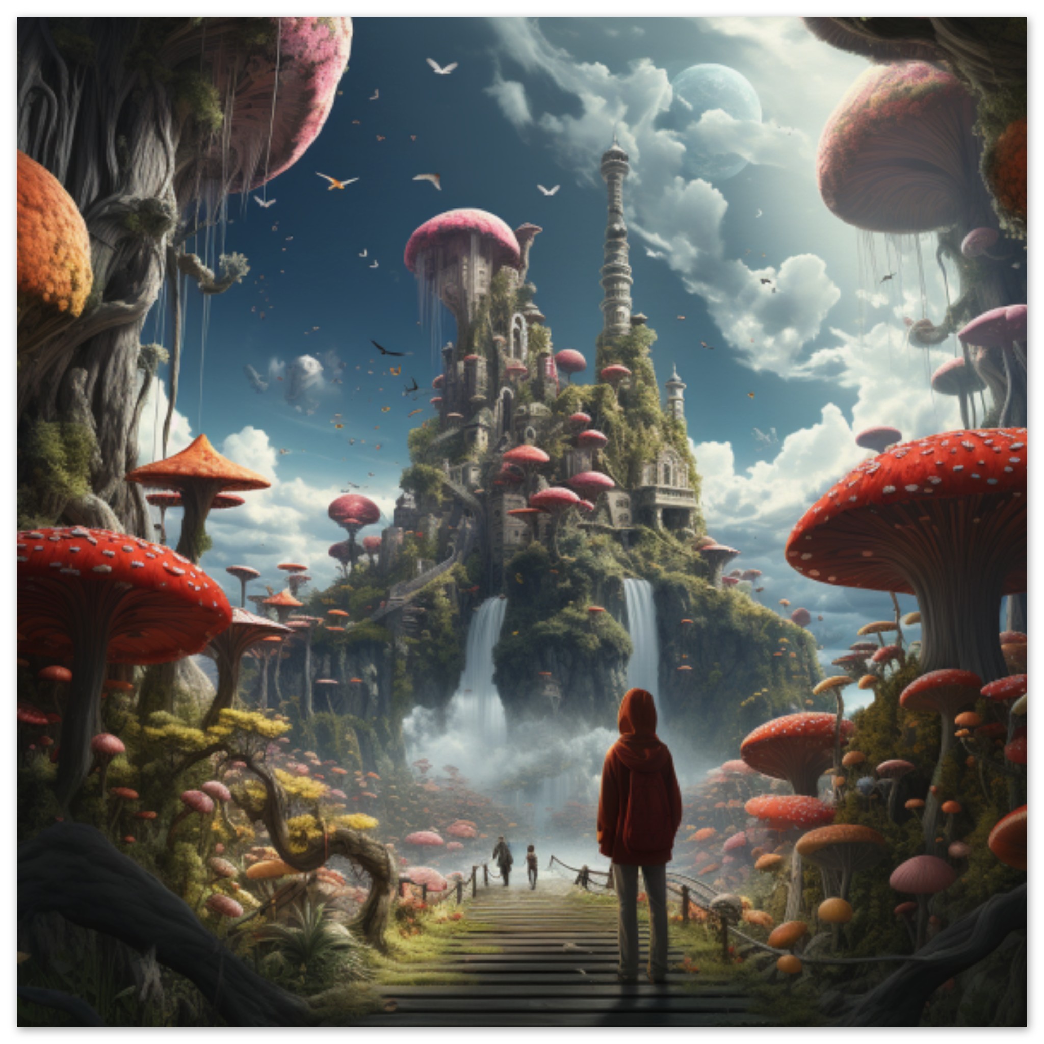 A person dressed in a red coat is standing on a winding path leading up to a majestic castle. The scene is set under a cloudy sky, with a hint of green plants in the background. The dominant colors in the image are grey and black, creating a moody atmosphere. The person is positioned towards the center of the image, appearing small in comparison to the grandiose castle in the distance. The overall composition evokes a sense of mystery and adventure, inviting the viewer to imagine the story behind this enchanting setting.