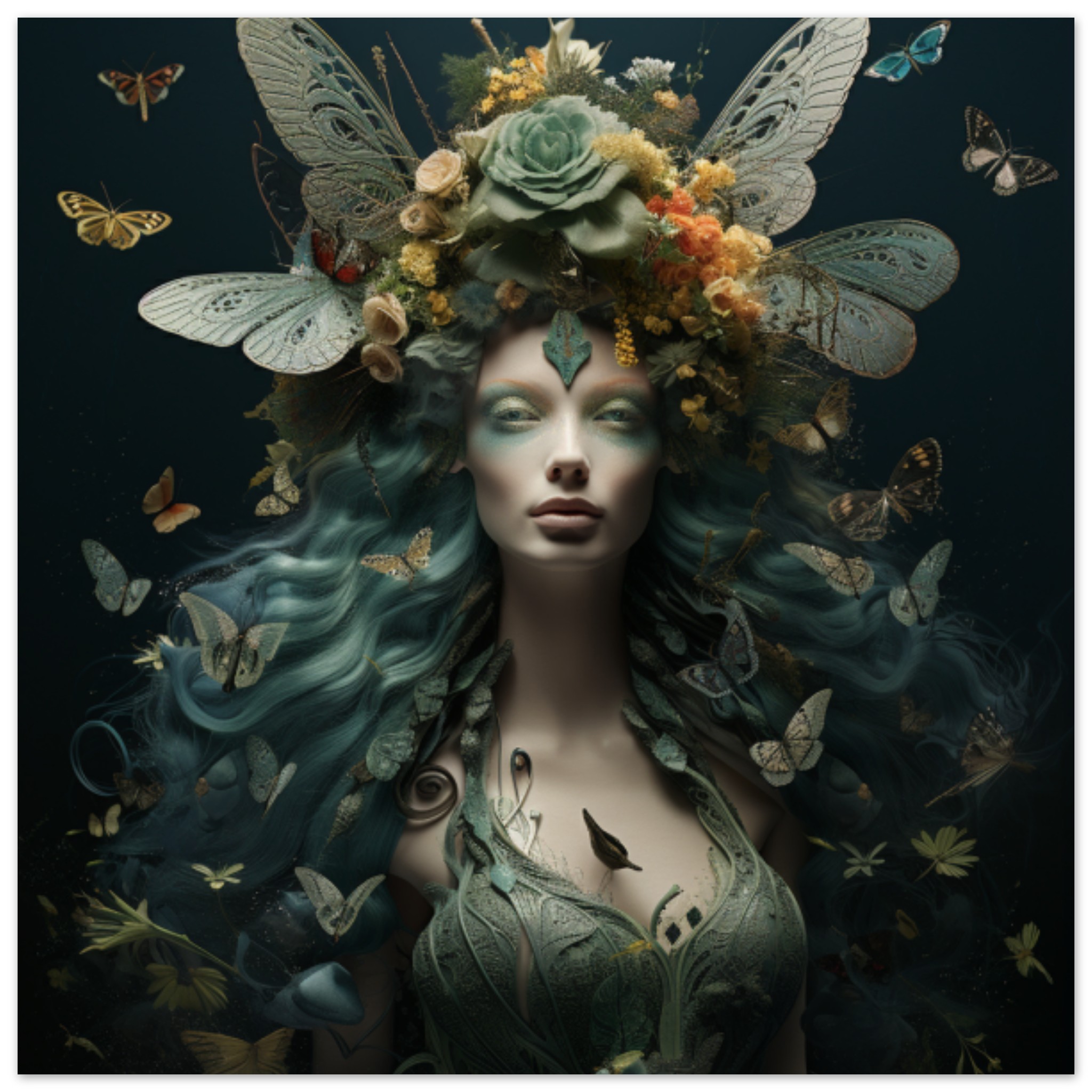 A mannequin with black hair is adorned with butterflies and colorful flowers. The mannequin is placed against a black background, standing out with its vibrant decorations. A butterfly is prominently displayed on the mannequin’s chest area. The overall scene gives off a whimsical and artistic vibe, with a touch of elegance. The image is square with dimensions of 600×600 pixels. The dominant colors in the image are black and a muted teal. The tags associated with the image include flower, woman, butterfly, organism, underwater, and art. The image also features a face in the center with a bounding box.