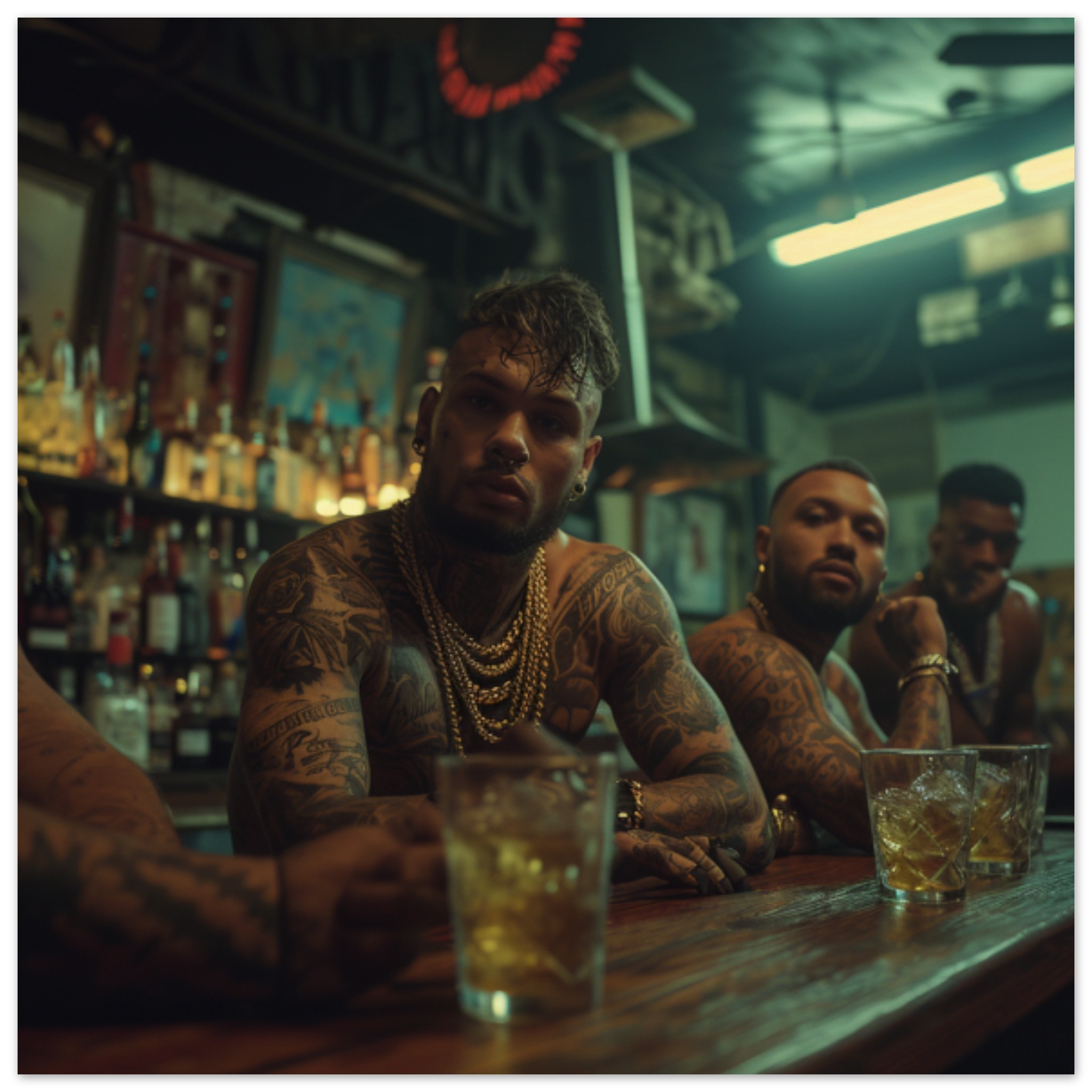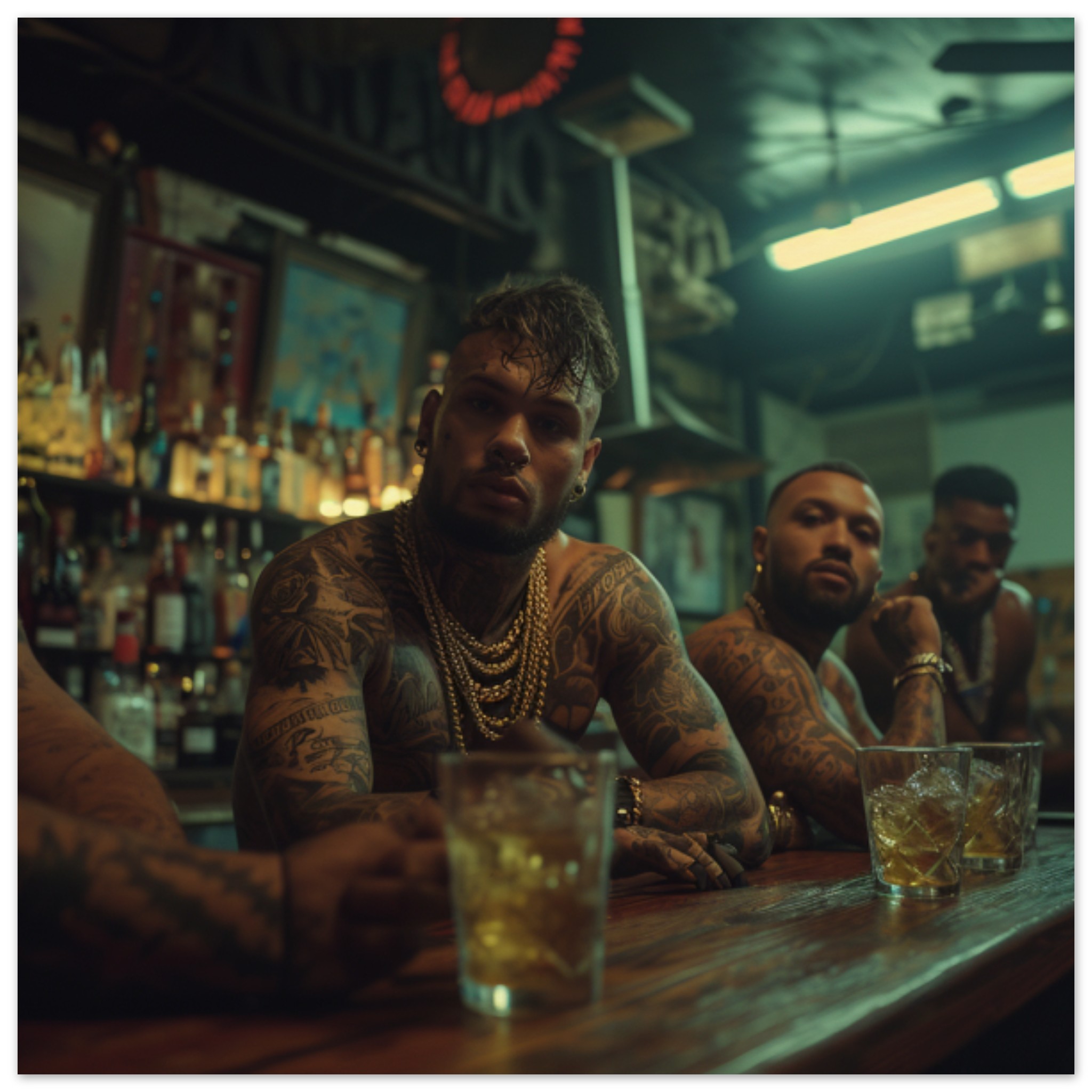 A group of men of different ages and ethnicities are sitting at a dimly lit bar. The men are casually dressed and appear to be engaged in conversation, with drinks in front of them. One man has visible tattoos on his arm. The bar is adorned with various bottles and glassware, creating a typical pub atmosphere. The background is dark, emphasizing the warm lighting over the bar. The image captures a typical scene of socializing and relaxation in a traditional drinking establishment.