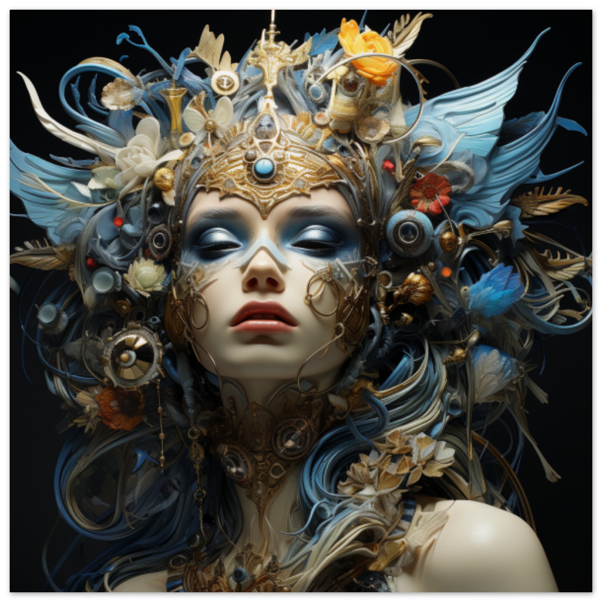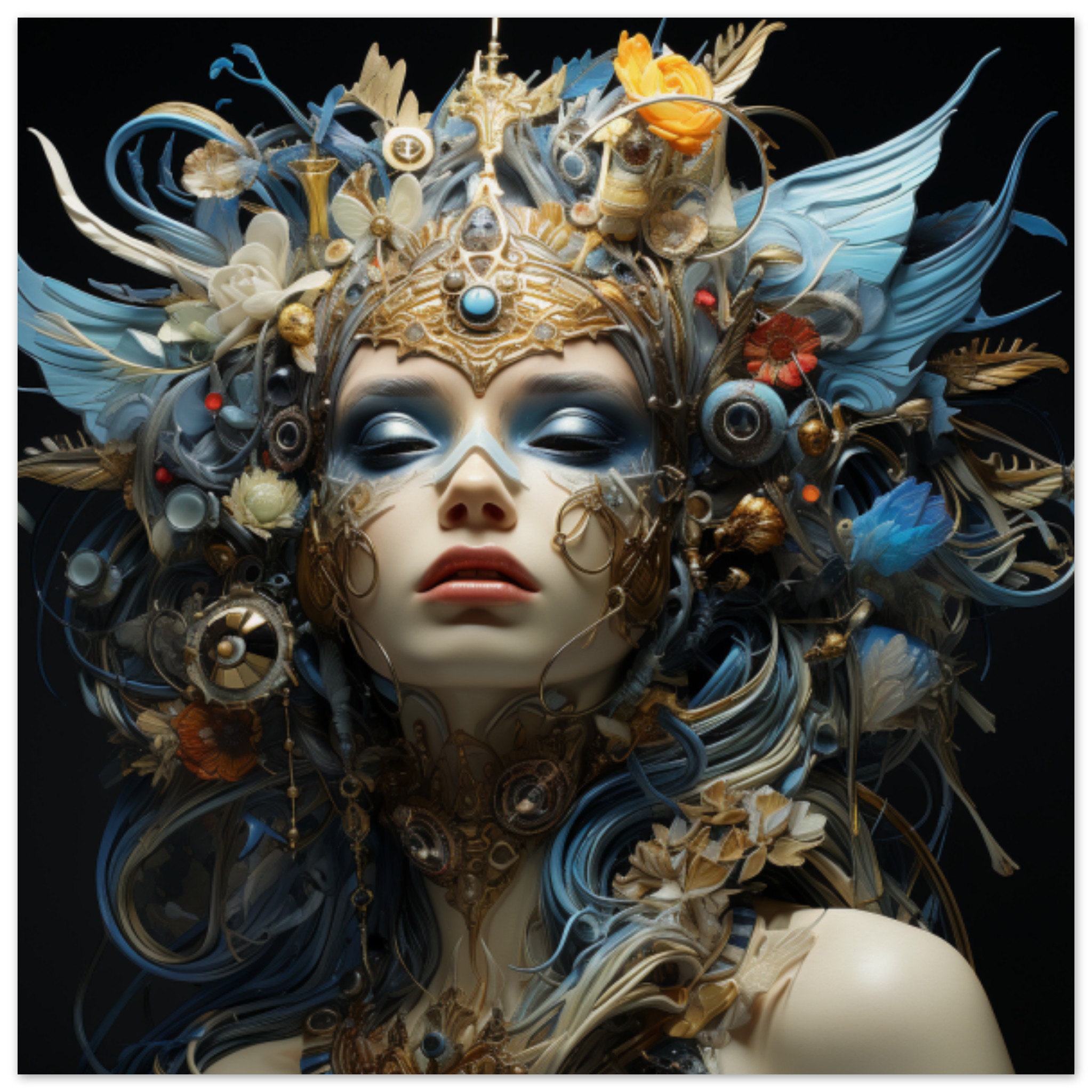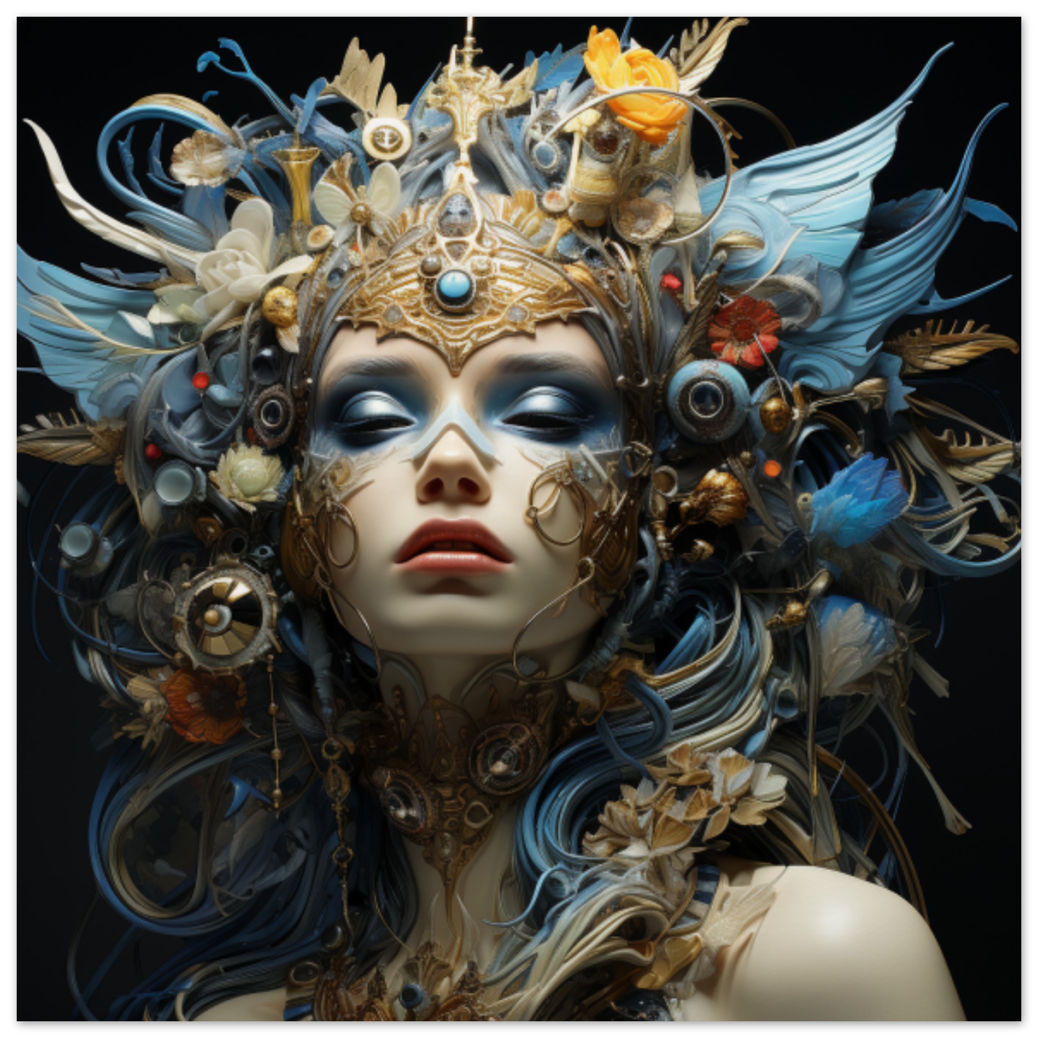 A woman is standing in the center of the image, wearing a stunning gold and blue garment. The garment is intricately designed and catches the eye with its vibrant colors. The woman’s face is partially covered with a mask, adding a mysterious and festive element to her appearance. The background is dark, allowing the woman and her attire to stand out. She is positioned within a crowd, suggesting that she may be attending a celebration such as Mardi Gras or a carnival. The overall scene exudes a sense of elegance and excitement.