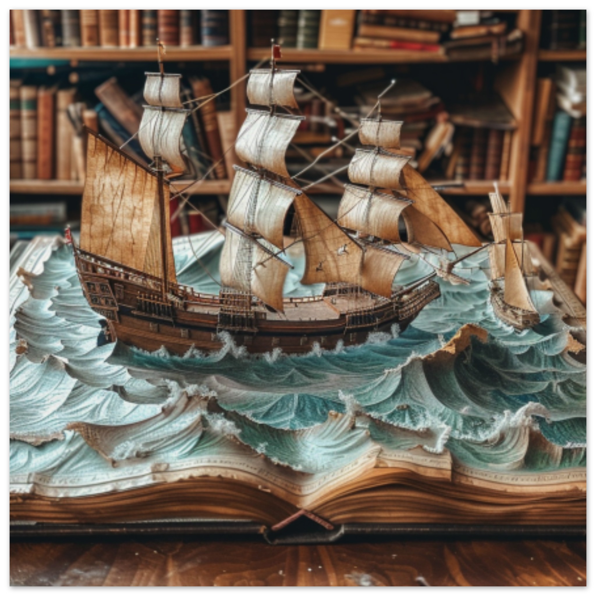 A brown book sits on a shelf with a model of a ship displayed on its cover. The book is placed in a bookcase indoors, surrounded by other items. The dominant colors in the image are brown, black, and grey, with an accent color of 90613B. The image is not black and white. The tags associated with the image include transport, book, watercraft, boat, bookcase, indoor, shelf, ship, and wooden. The image does not contain any objects, faces, celebrities, landmarks, or text. The content of the image is not adult, racy, or gory.
