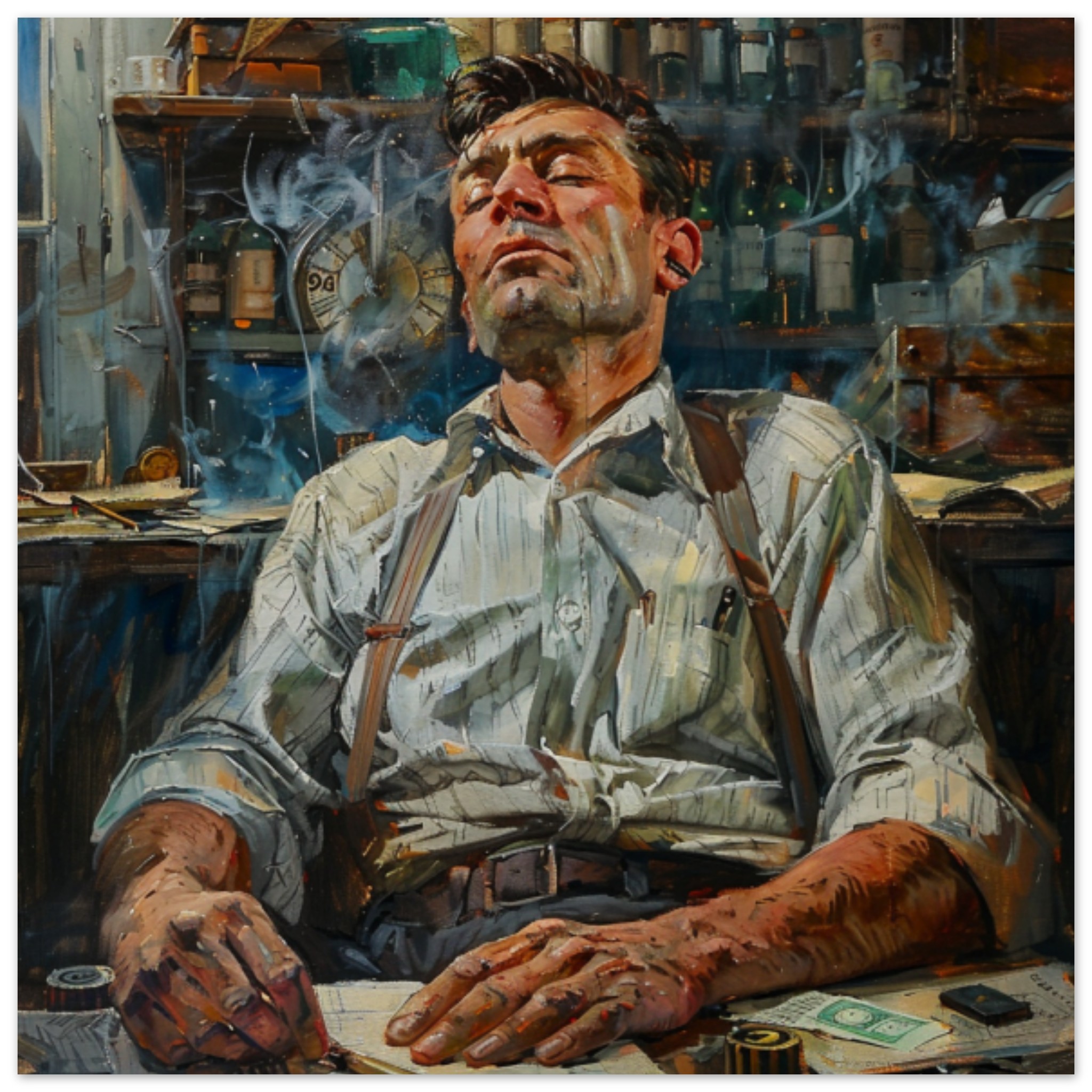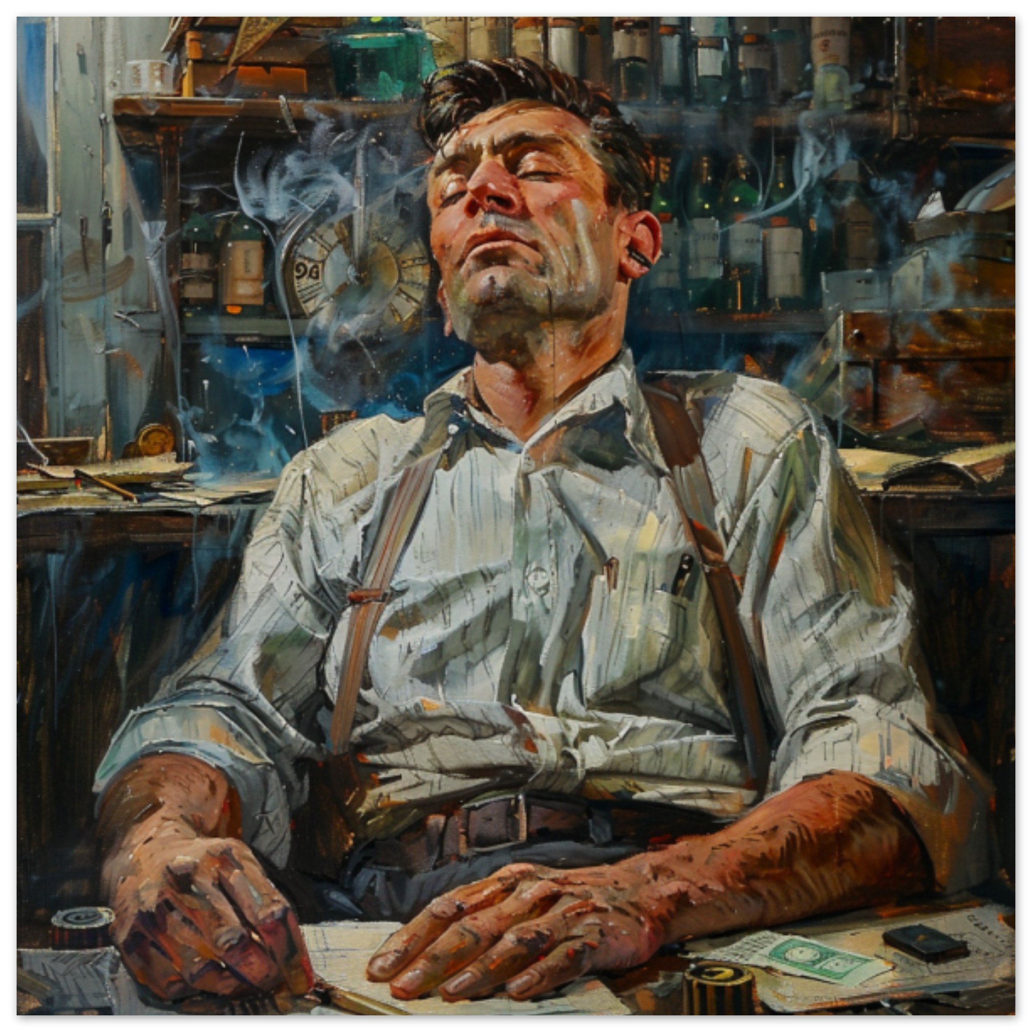 A man with a human face is sitting at a desk, engrossed in a drawing of himself. He has a human beard and is wearing clothing. The indoor scene is dominated by shades of black, grey, and brown, with an accent color of 945C37. The man is not engaging in any adult, racy, or gory activities, and the image is not black and white. The painting of the man is detailed, with a clock in the background. The overall atmosphere is artistic and contemplative, with no other objects or people present in the scene.