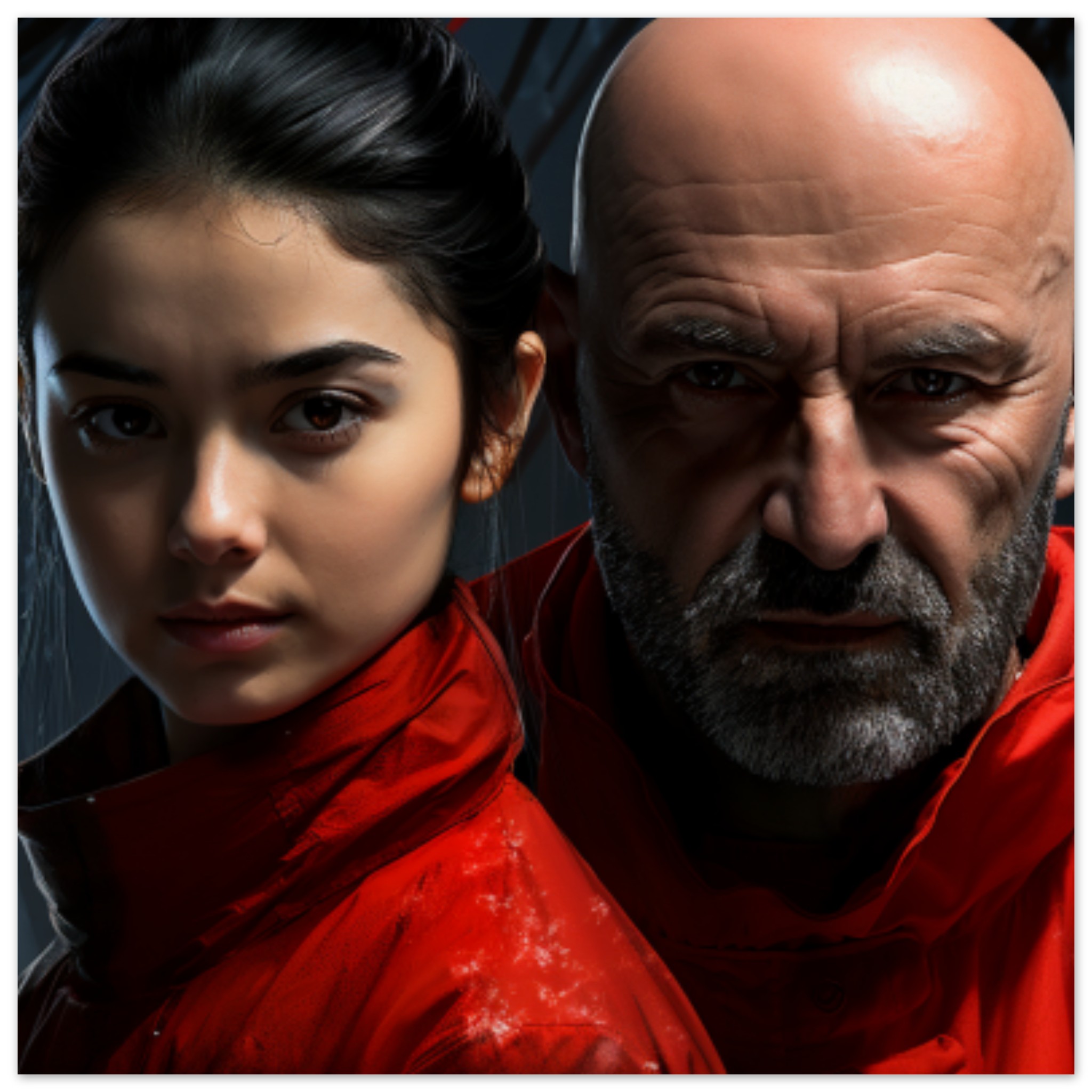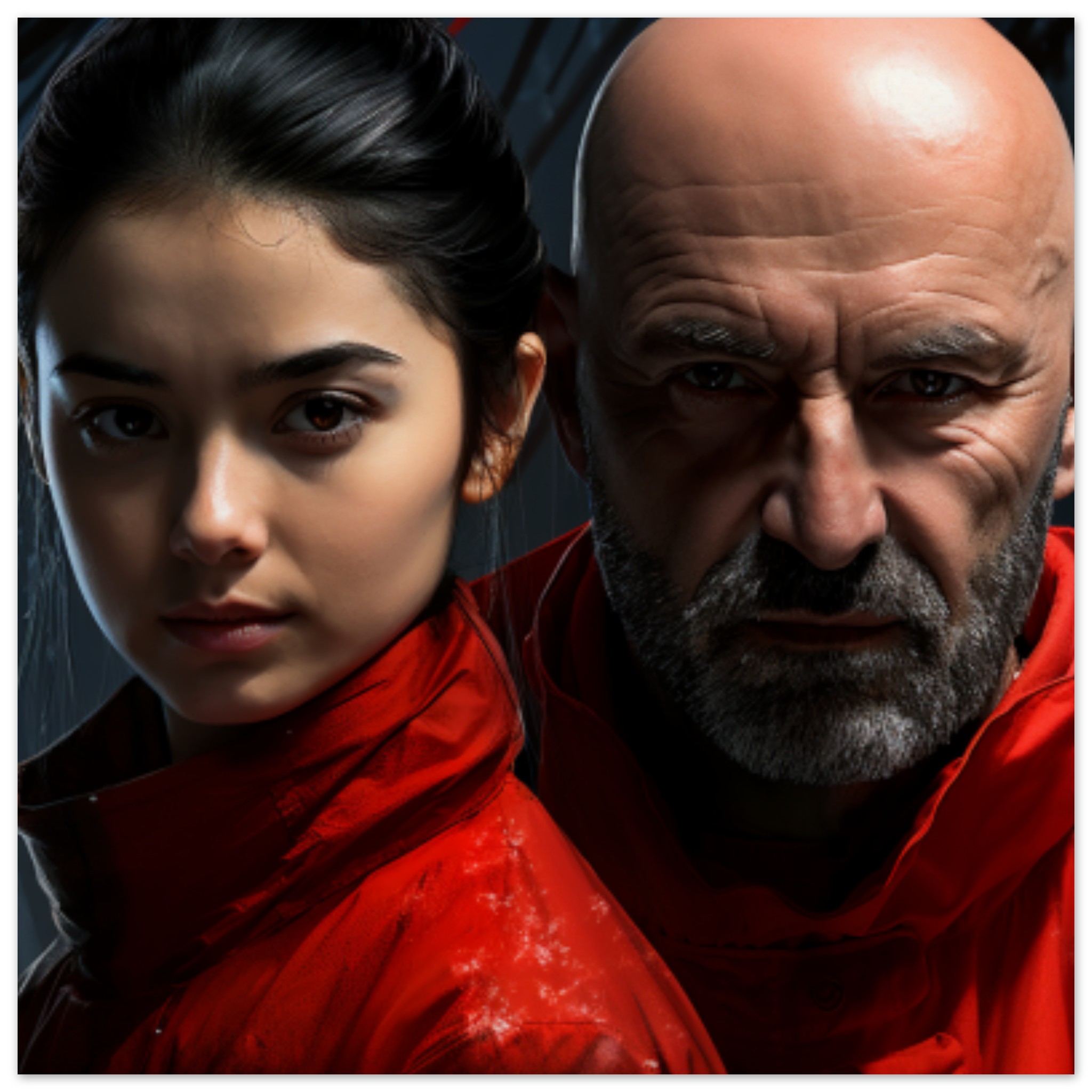 A man and a woman are posing for a picture, standing close together. The man is wearing a black jacket, and the woman is wearing a red jacket. Both individuals have their faces visible, with the man having a beard. The dominant colors in the image are black, brown, and red. The background is black. The man’s face is in the foreground, while the woman’s face is slightly behind. They are both looking towards the camera with neutral expressions. The image is focused on the faces of the man and woman, capturing a moment of connection between them.