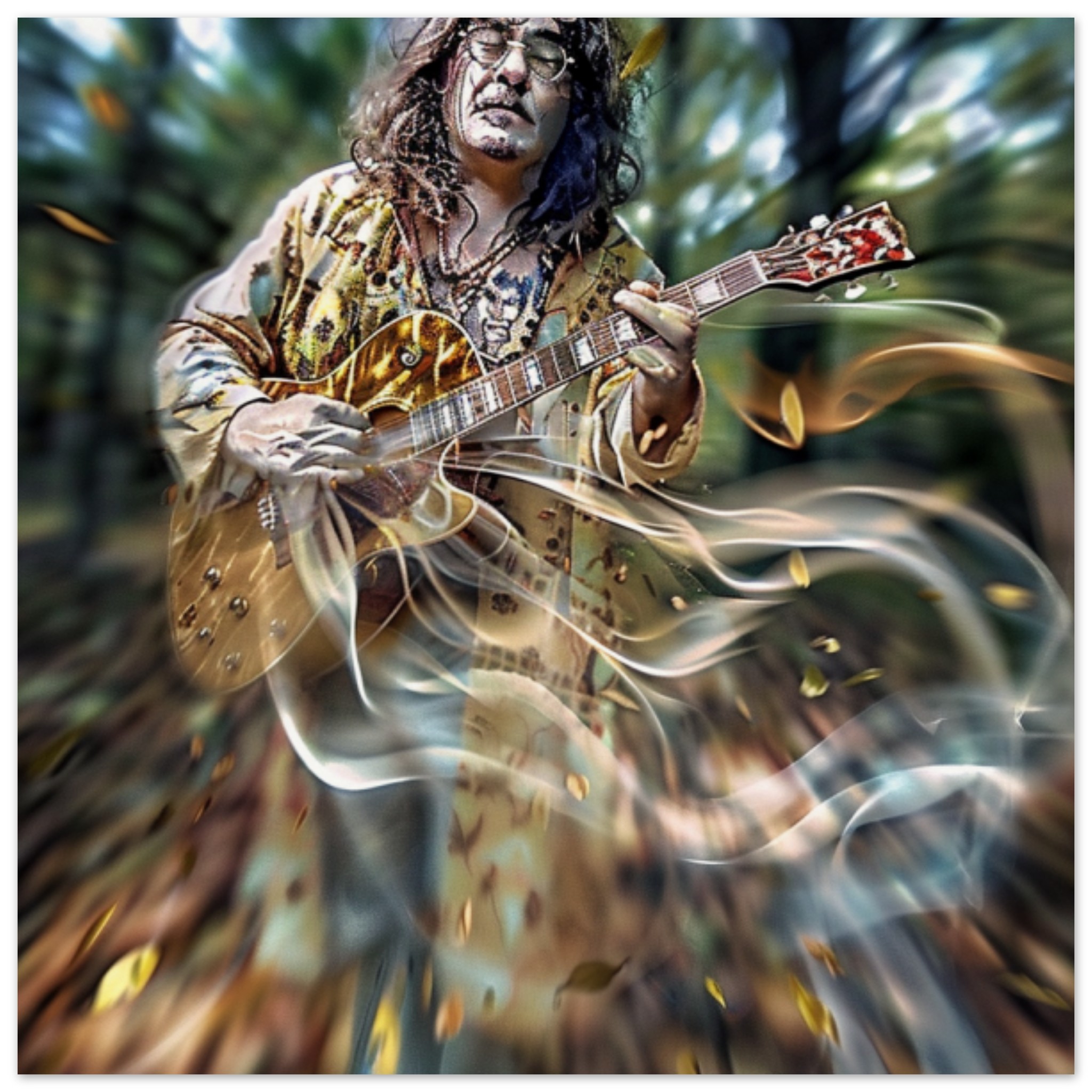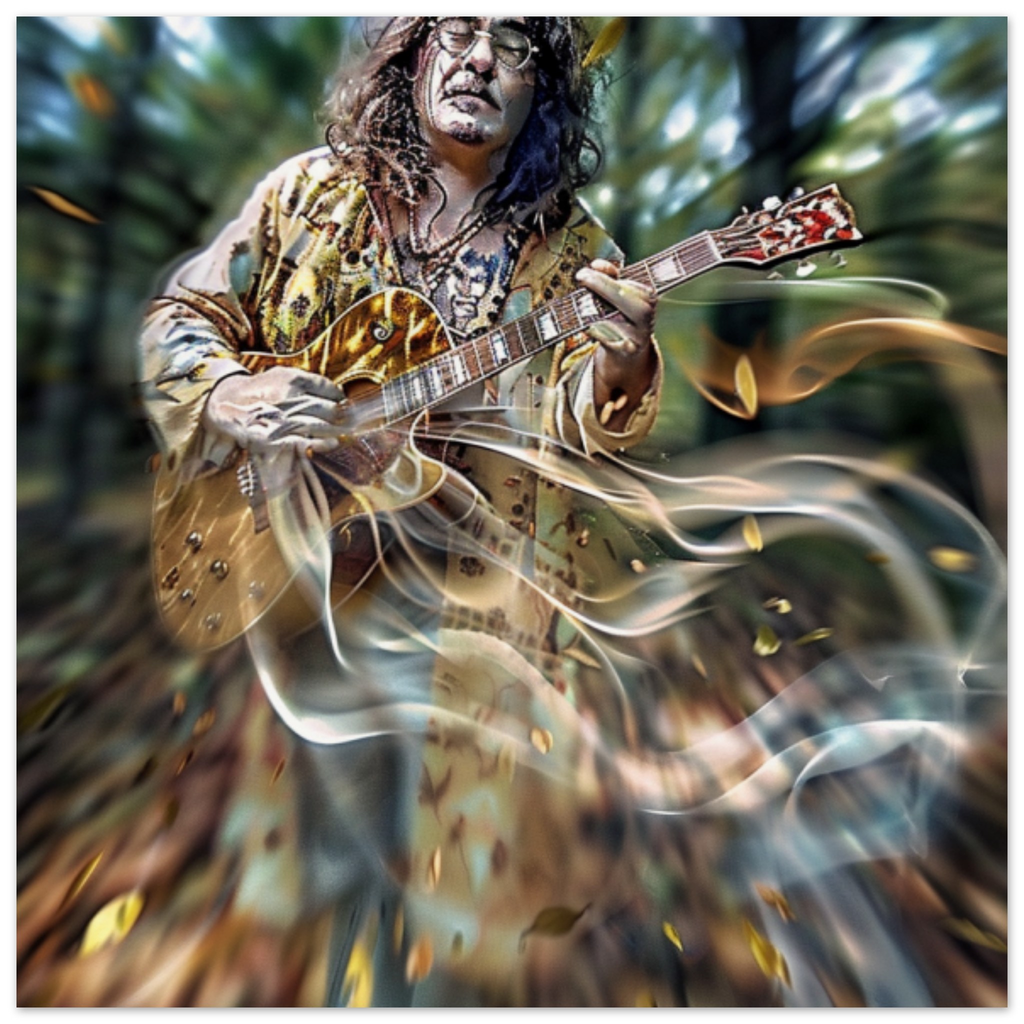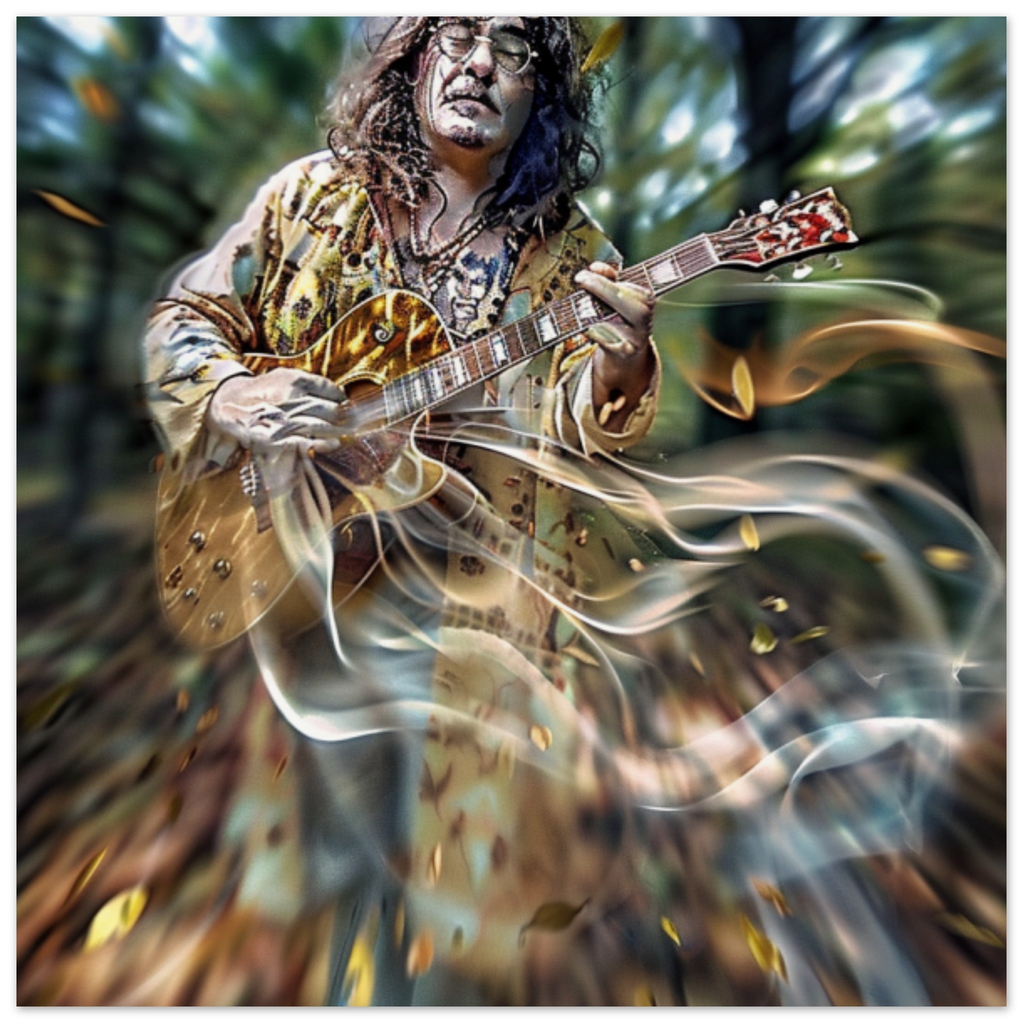 A man playing a guitar is captured in this image, set against a backdrop of trees outdoors. The man is focused on strumming the guitar, with his face partially visible in the top right corner. The dominant colors in the image are grey and black, with an accent color of 897442. The guitar is prominently featured in the center, with a bounding box indicating its location on the image. The overall scene is peaceful and serene, with a close-up shot highlighting the musician’s passion for playing music in nature.