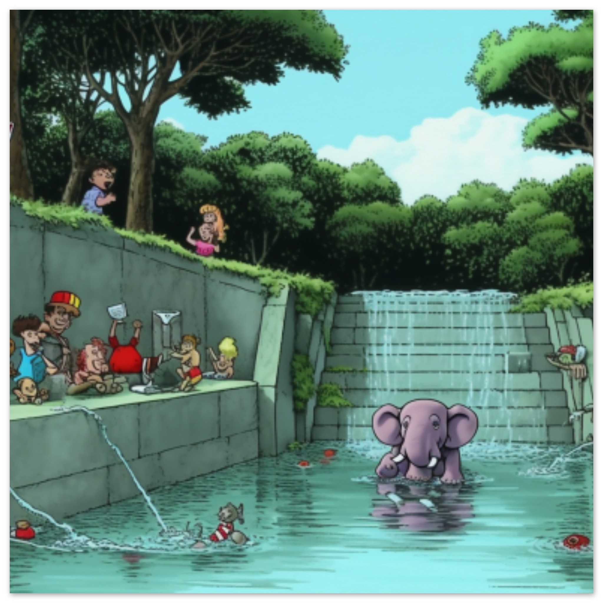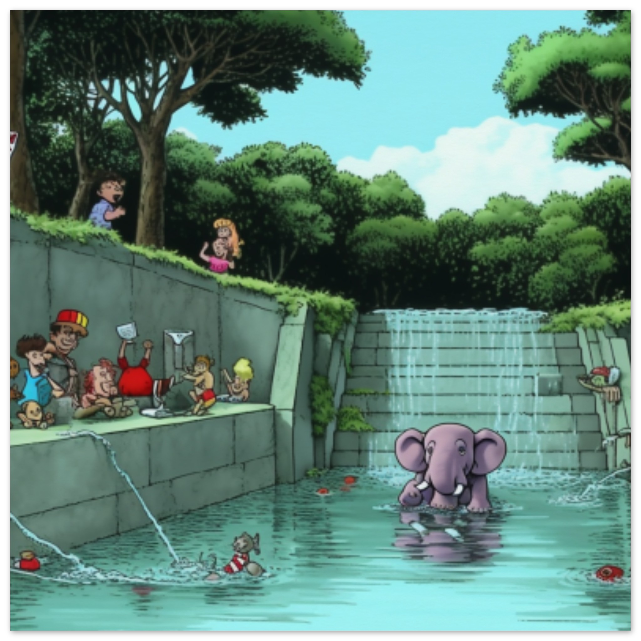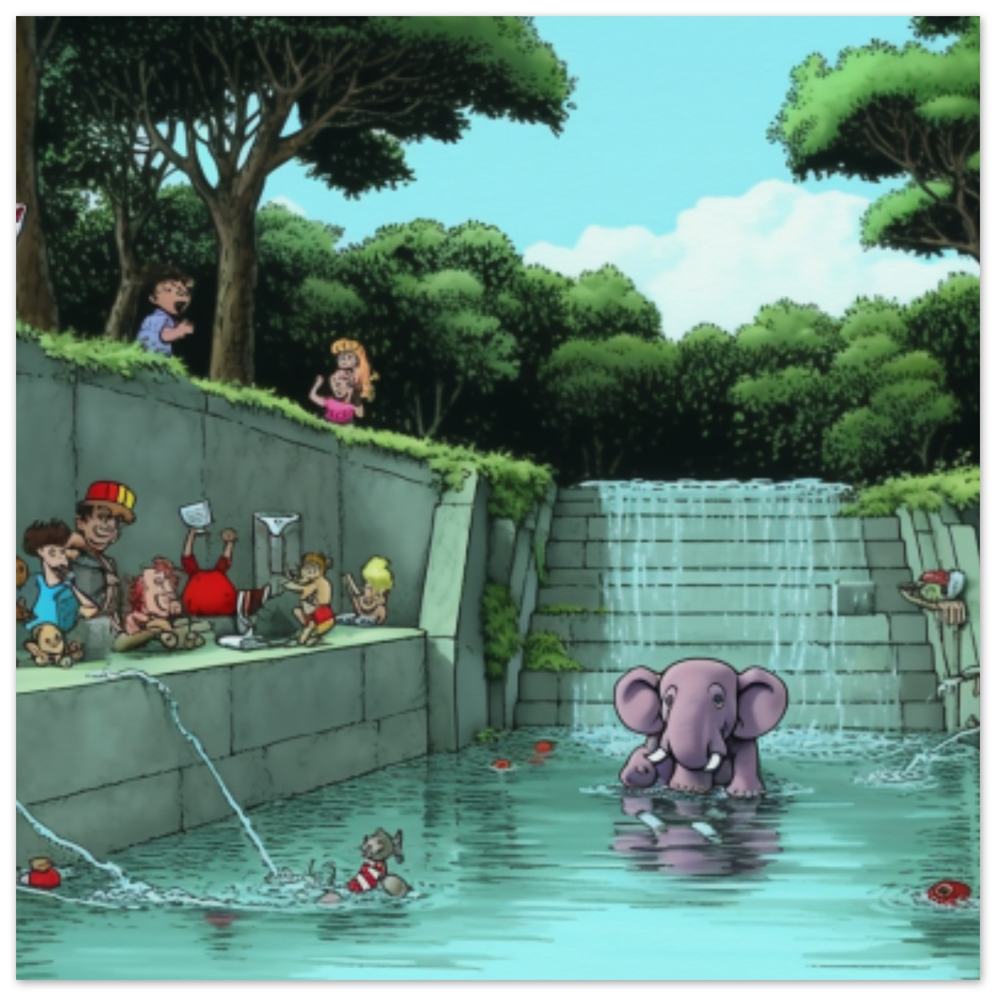 A cartoon elephant is happily splashing around in a pool of water, surrounded by a group of people. The scene is set outdoors, with a tall palm tree and lush green trees in the background. The sky is clear and blue, adding to the cheerful atmosphere. The cartoon elephant is the main focus, with its playful demeanor captivating the onlookers. The setting is a peaceful oasis, with the sound of water gently cascading into the pool. Overall, it’s a whimsical and joyful moment captured in this vibrant and colorful cartoon illustration.