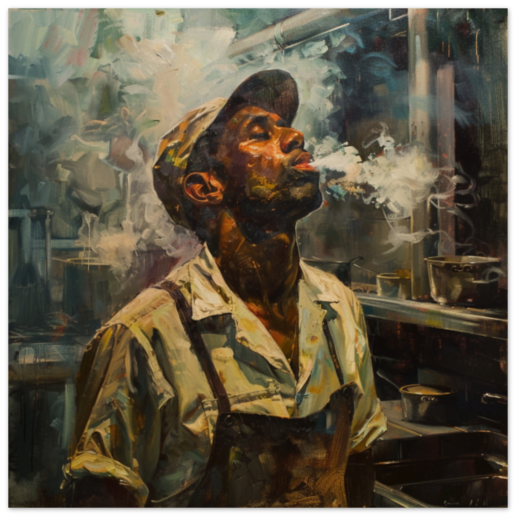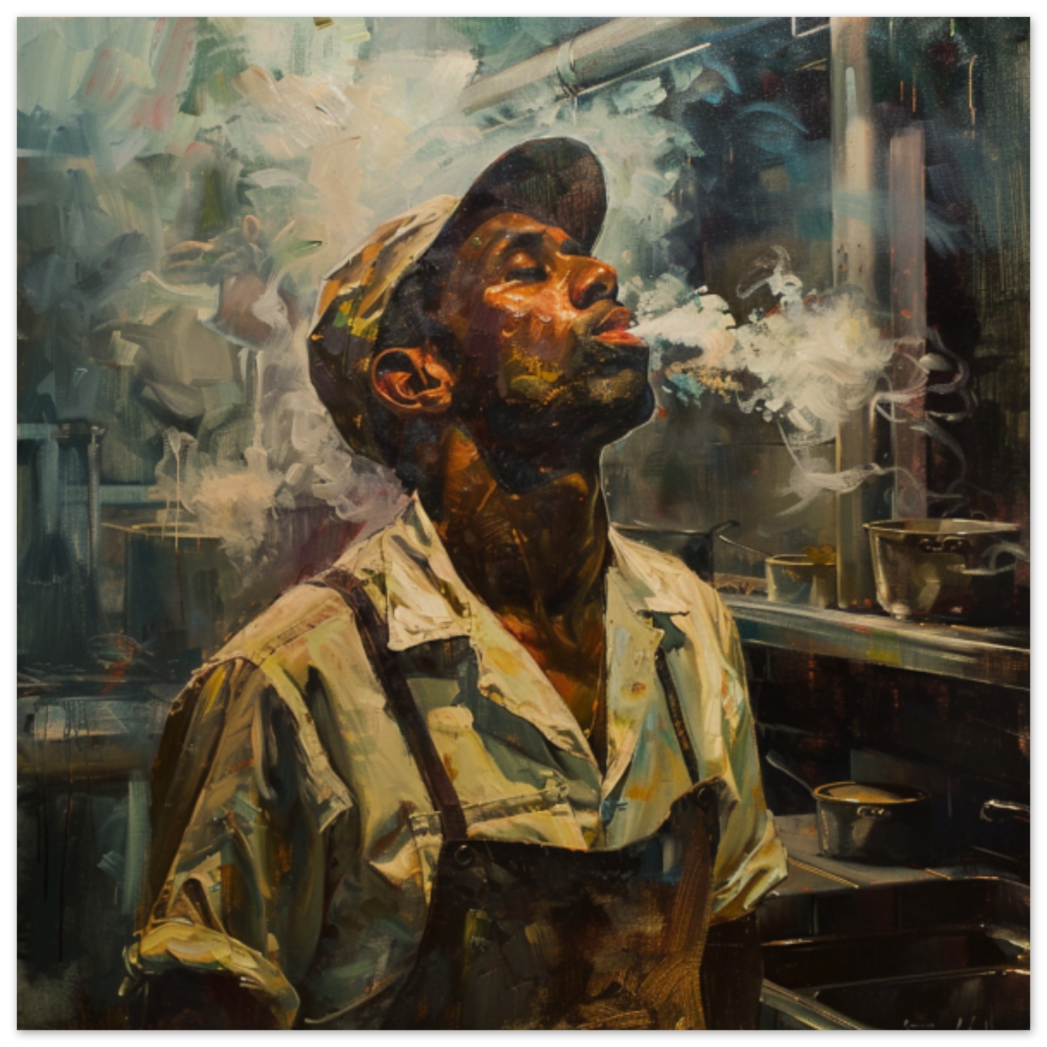 A detailed painting depicting a man smoking is showcased in this image. The artwork features a man’s face, with a dominant color scheme of black and grey. The man’s facial expression is captured in great detail, showcasing a sense of contemplation or relaxation. The painting is displayed in a museum setting, highlighting the artist’s skill in capturing human emotions. The man appears to be enjoying a smoke, adding a touch of nostalgia to the scene. The composition is primarily focused on the man’s face, drawing the viewer’s attention to his expression and the act of smoking.