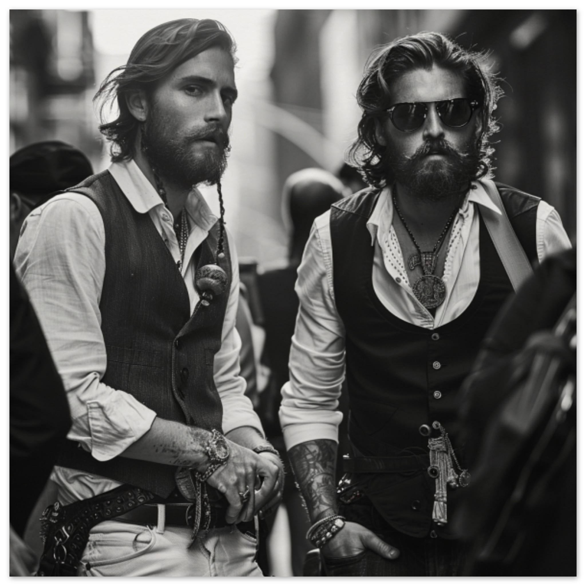 A group of two men, both wearing sunglasses and vests, are captured in a black and white outdoor setting. The men have a street fashion vibe, exuding a cool and confident aura. One man has a beard and mustache, while the other sports a suit. The image focuses on their faces and shoulders, with a close-up emphasizing their stylish clothing choices. The background is minimal, with shades of black and grey dominating the scene. Overall, the image portrays a sense of urban style and camaraderie amongst the men.