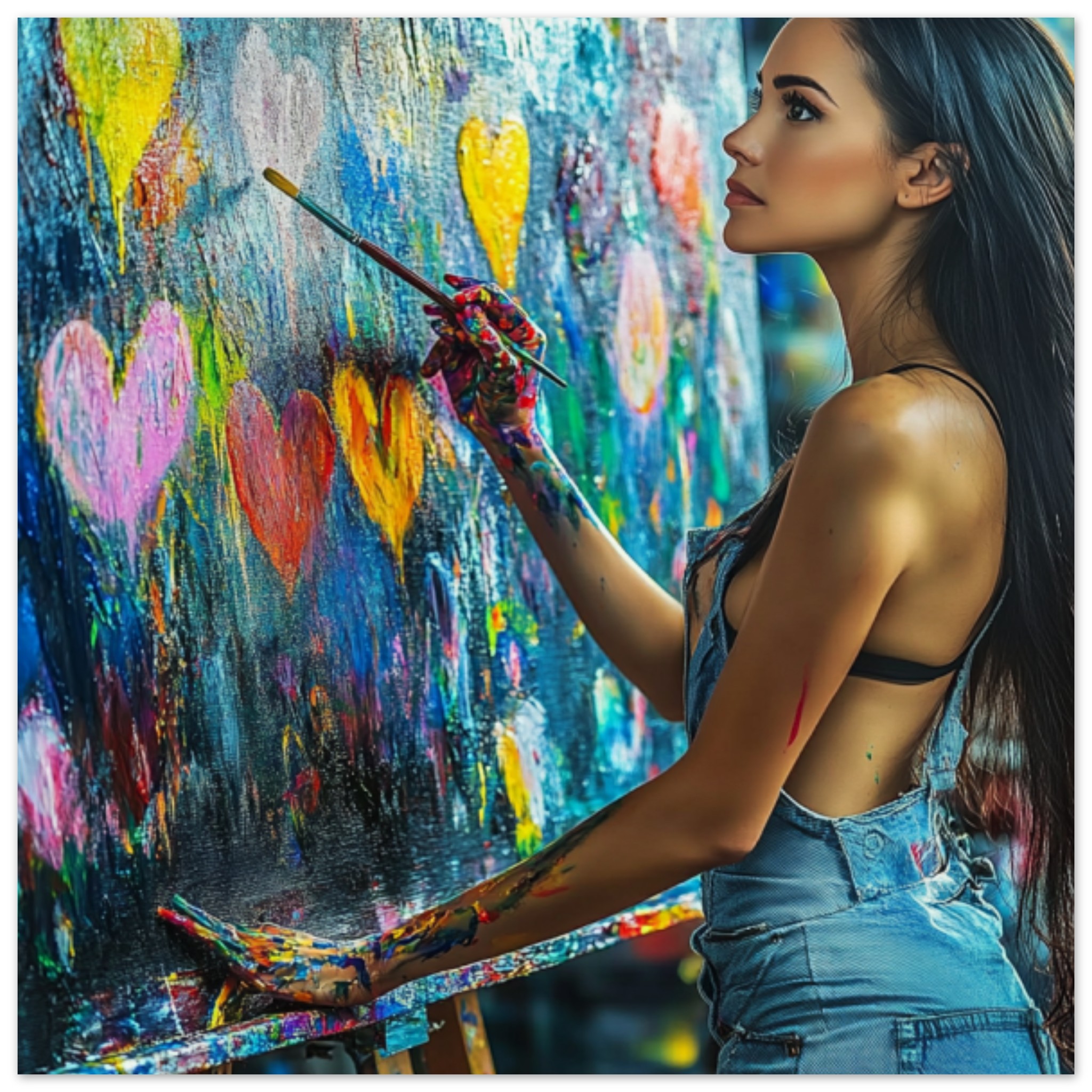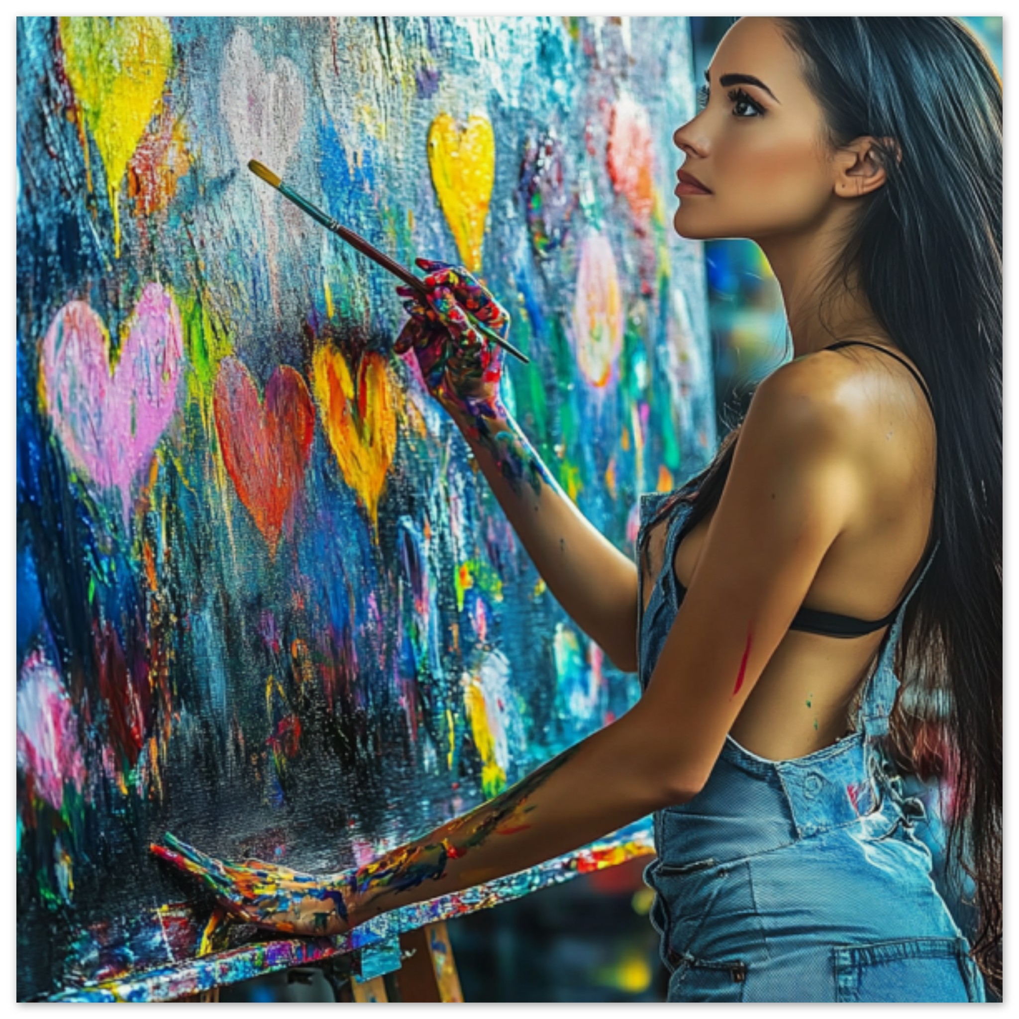 A woman with brown hair is standing outdoors, painting on a canvas. She is wearing clothing and is focused on her artwork. The dominant colors in the image are black and brown, with an accent color of 2A7FA1. The image is not black and white. The objects detected include a person, with a bounding box located at x: 201, y: 75, width: 379, height: 628. The image is categorized as abstract nonphoto and people. Tags associated with the image include painting, clothing, person, girl, human face, art, woman, outdoor, and fashion.