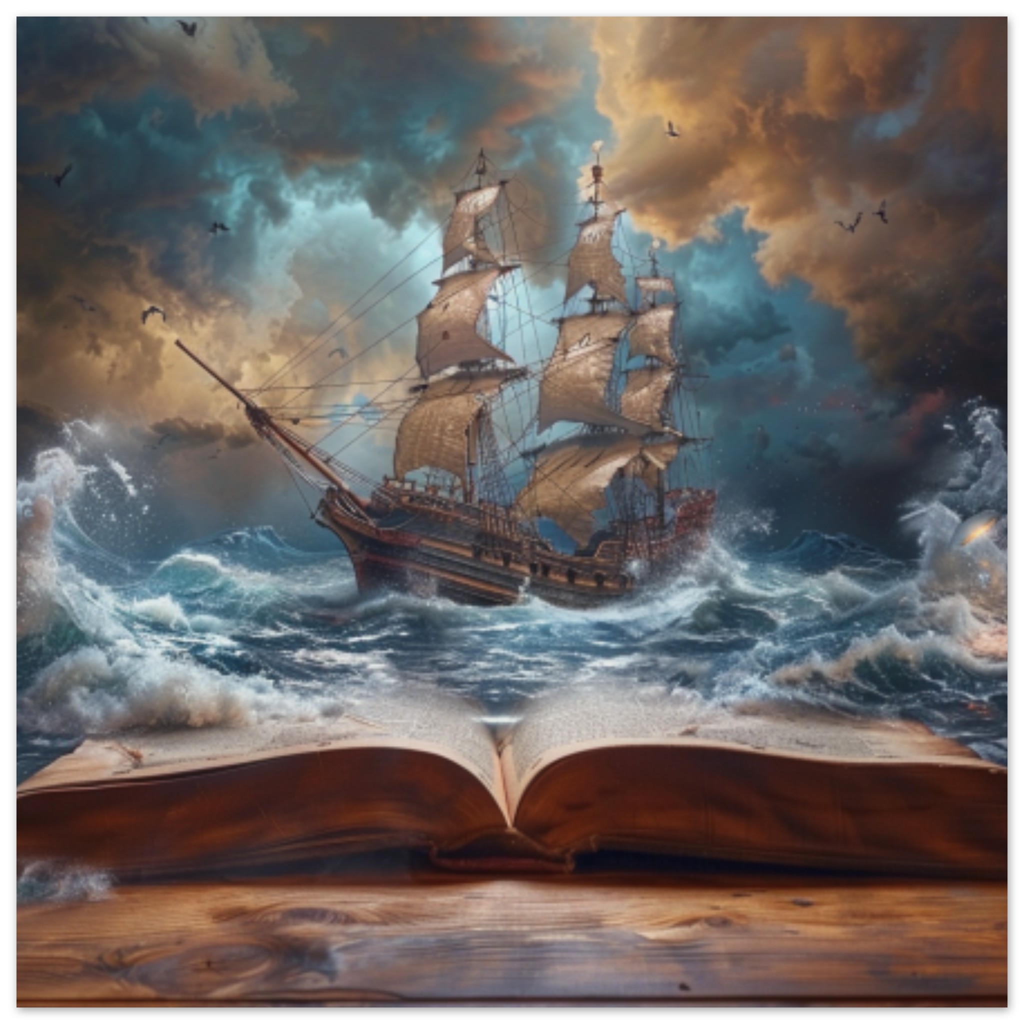 An open book with a ship in the water is depicted in this image. The painting showcases a grey and brown ship sailing on the ocean, with grey clouds in the sky. The boat is the focal point of the composition, positioned towards the center of the image. The book is open, revealing pages that add depth to the scene. The overall color scheme is dominated by shades of grey, with an accent color of 886643 adding a touch of warmth. This outdoor artwork captures a serene maritime moment, perfect for admirers of nautical themes.