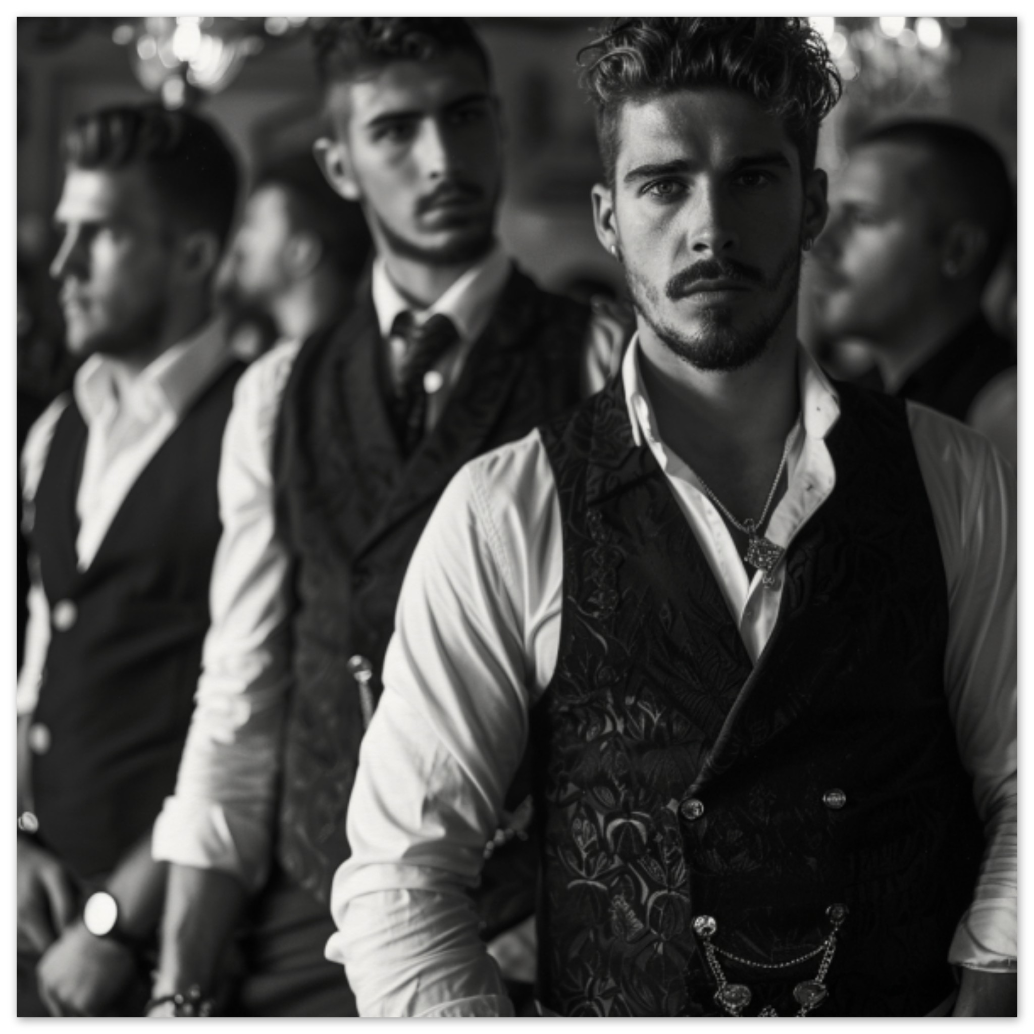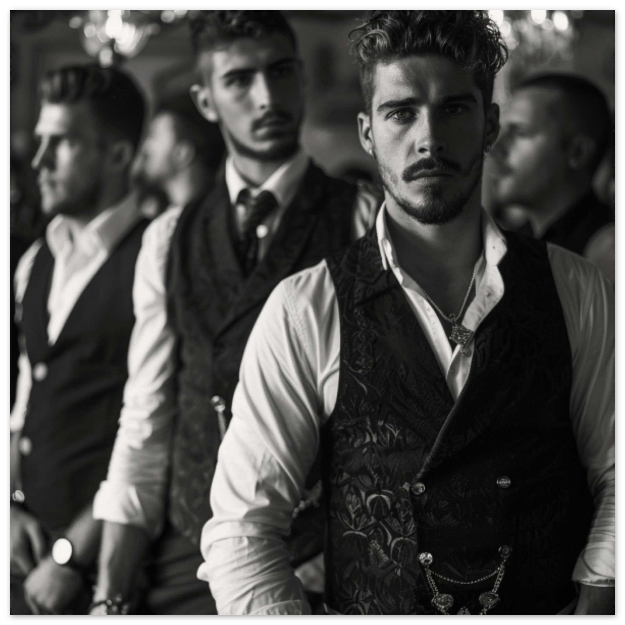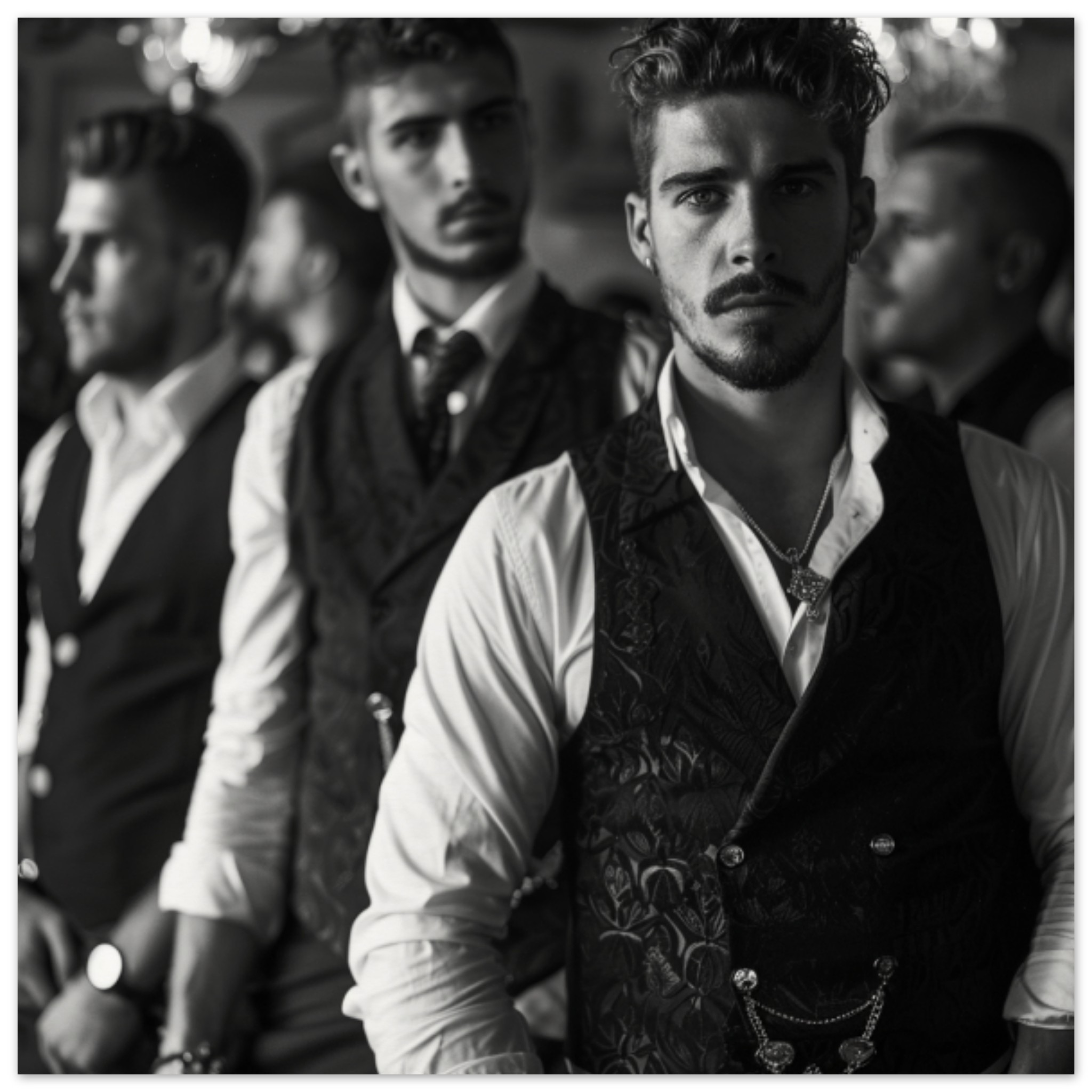 A group of four men, dressed in black vests and bow ties, are standing outdoors on a street. The men are all wearing different styles of vests, with one man also sporting a necklace. The image is in black and white, with the dominant colors being black and grey. The men’s faces are partially visible, with one man in the foreground and another in the background. The scene captures a sense of gentlemanly fashion and camaraderie. Overall, the image exudes a classic and elegant vibe, with a touch of urban street style.