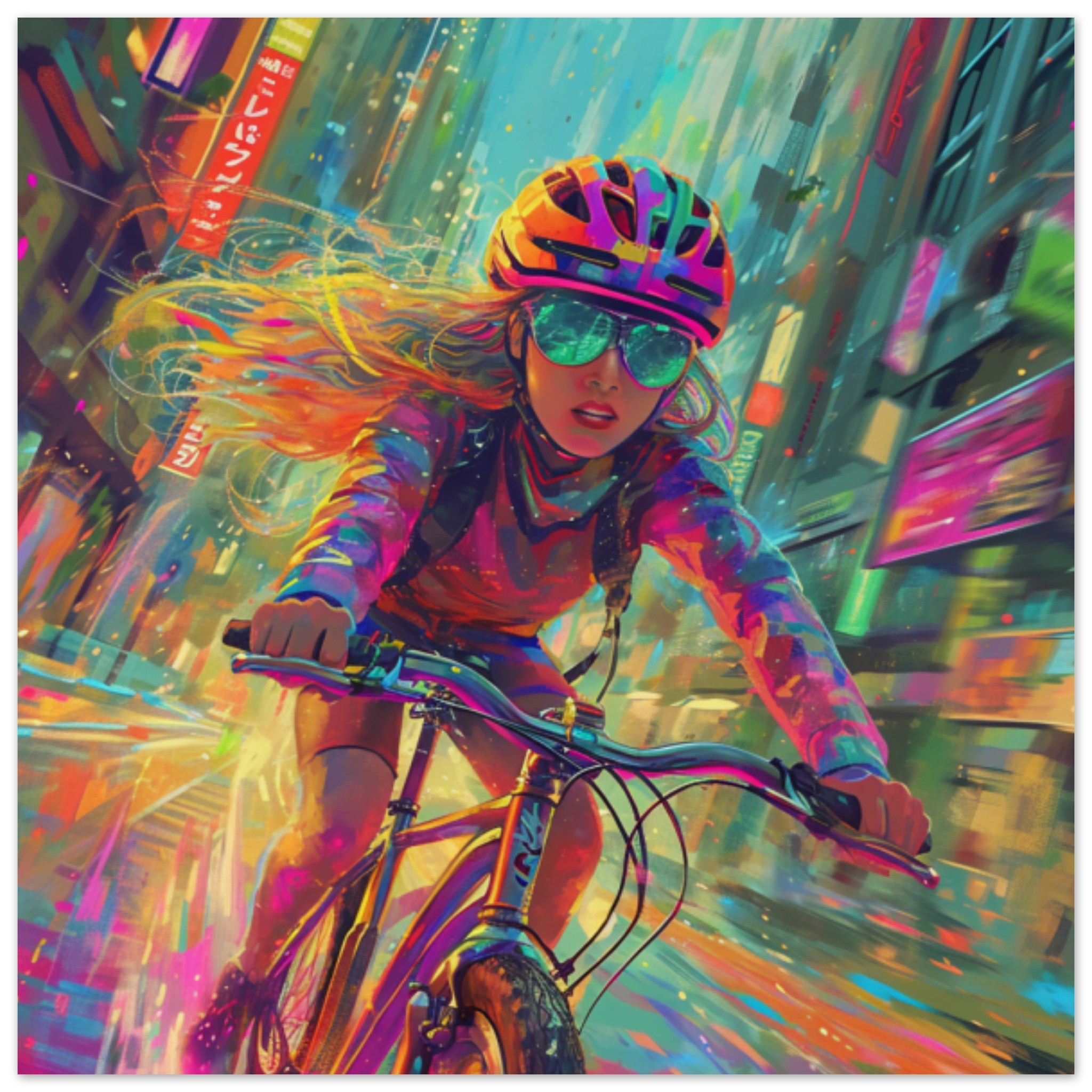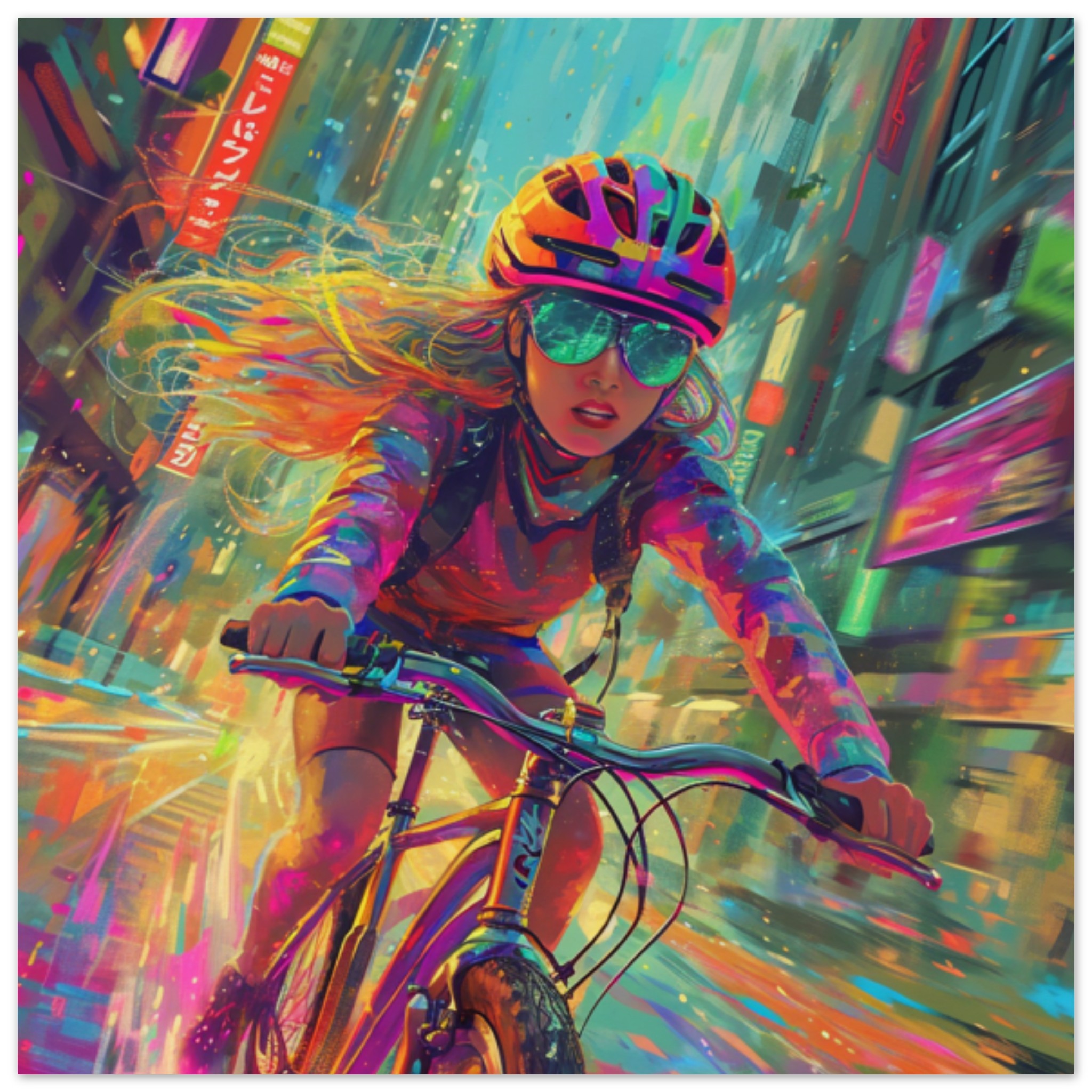 A young girl is joyfully riding a bicycle in a bustling city. The vibrant image captures her in motion, with a bicycle helmet securely fastened on her head. She is wearing glasses and appears to be focused on her journey. The background showcases the urban landscape with teal buildings. The dominant colors of yellow and teal add a lively atmosphere to the scene. The girl’s face is the main focus of the painting-like composition, exuding a sense of freedom and adventure. Overall, the artwork conveys a sense of movement and exploration in a city setting.