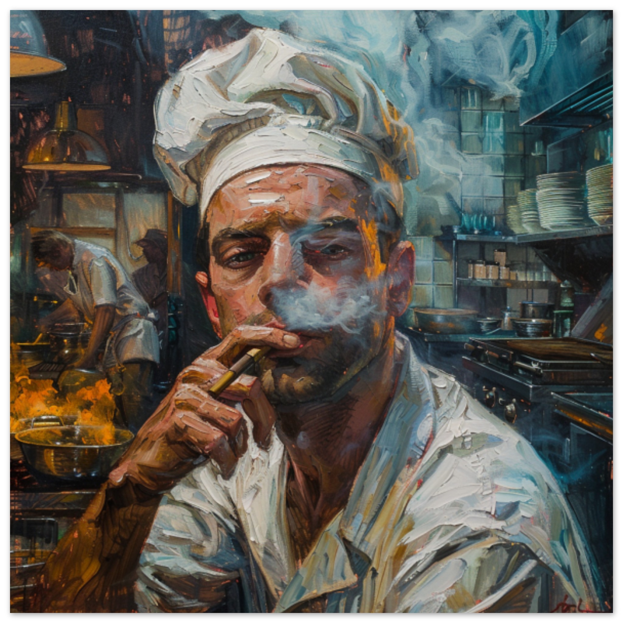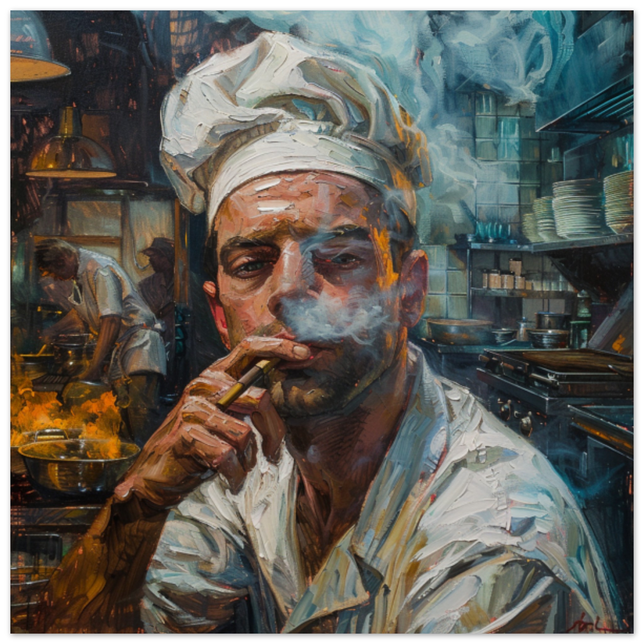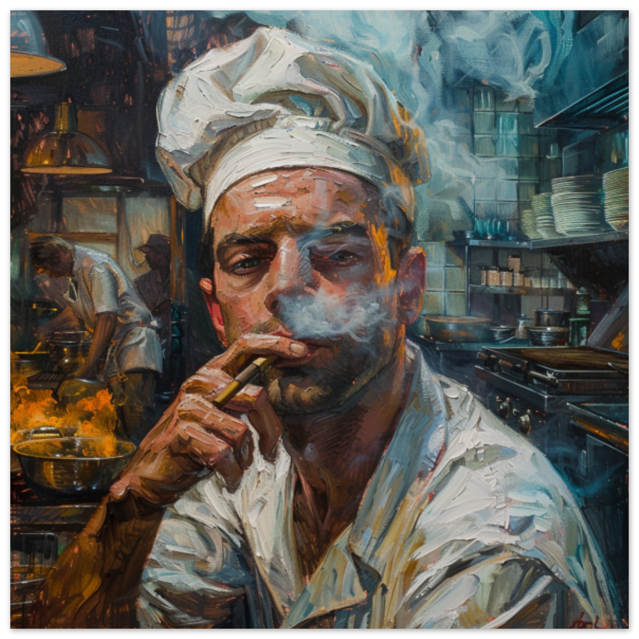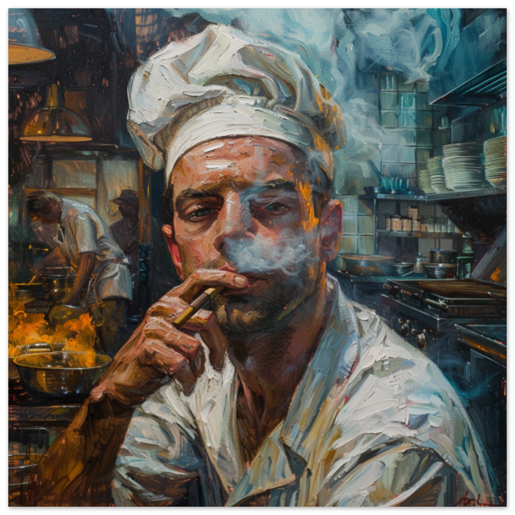 A detailed painting captured in this image features a chef sitting on a chair, deeply engrossed in smoking a cigarette. The chef’s face, adorned with a beard, is the focal point of the painting, showcasing a sense of concentration. The background is predominantly black, enhancing the chef’s grey attire and the brown tones in the painting. This artwork portrays a realistic human face, expertly drawn with intricate details, creating a lifelike portrait. The overall composition exudes a sense of artistry and skill, making it a captivating piece for art enthusiasts and observers alike.